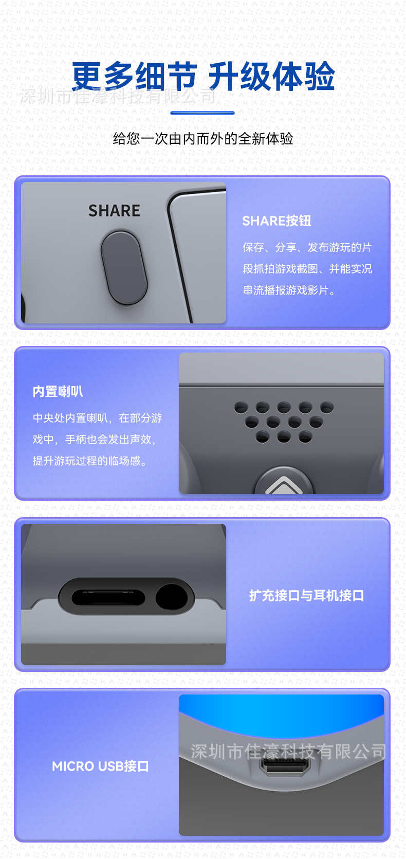 ⑦SHARE按钮:保存、分享、发布游玩的片段抓拍游戏截图、并能实况串流播报游戏影片;内置喇叭、扩充接口与3.5mm耳机接口、MICRO USB接口。