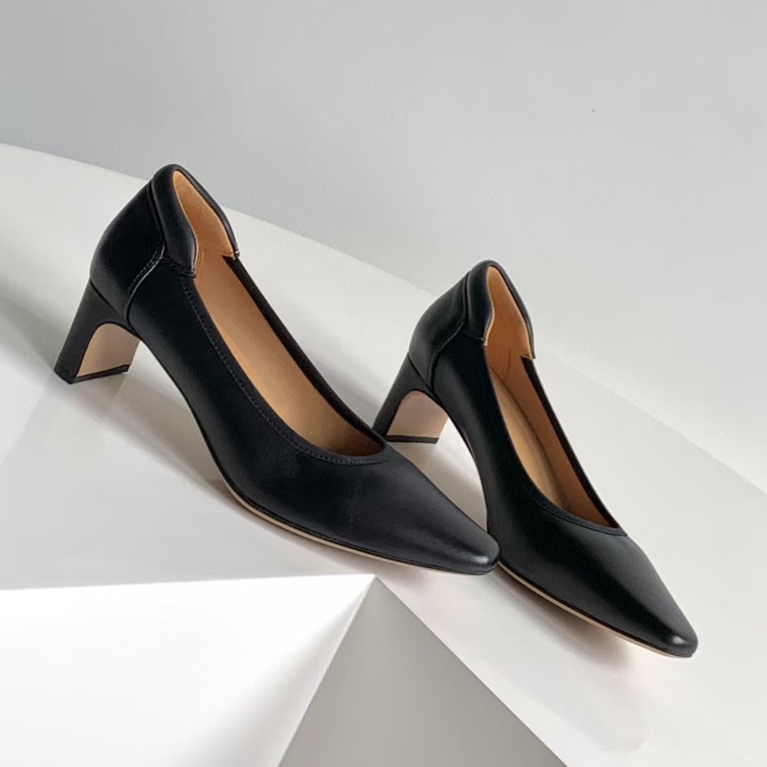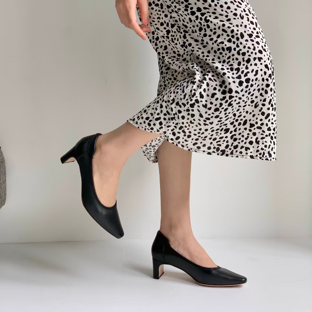 양가죽 스퀘어힐 5cm 싱글슈즈~ 천연가죽 여성화 스퀘어토 펌프스 워크슈즈 탄성 백팩 힐이 떨어지는 걸림 방지 하이힐