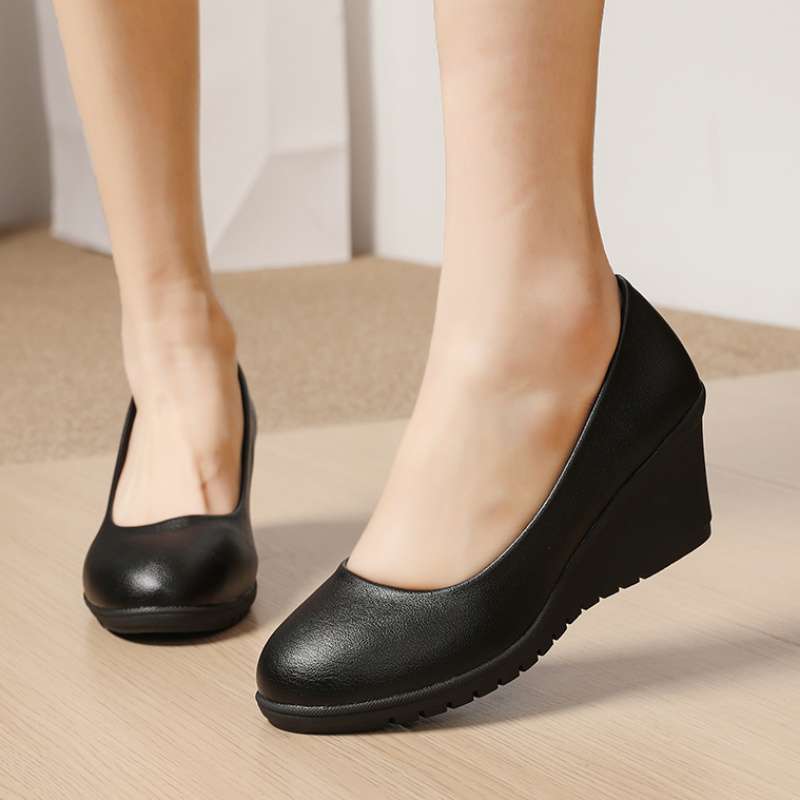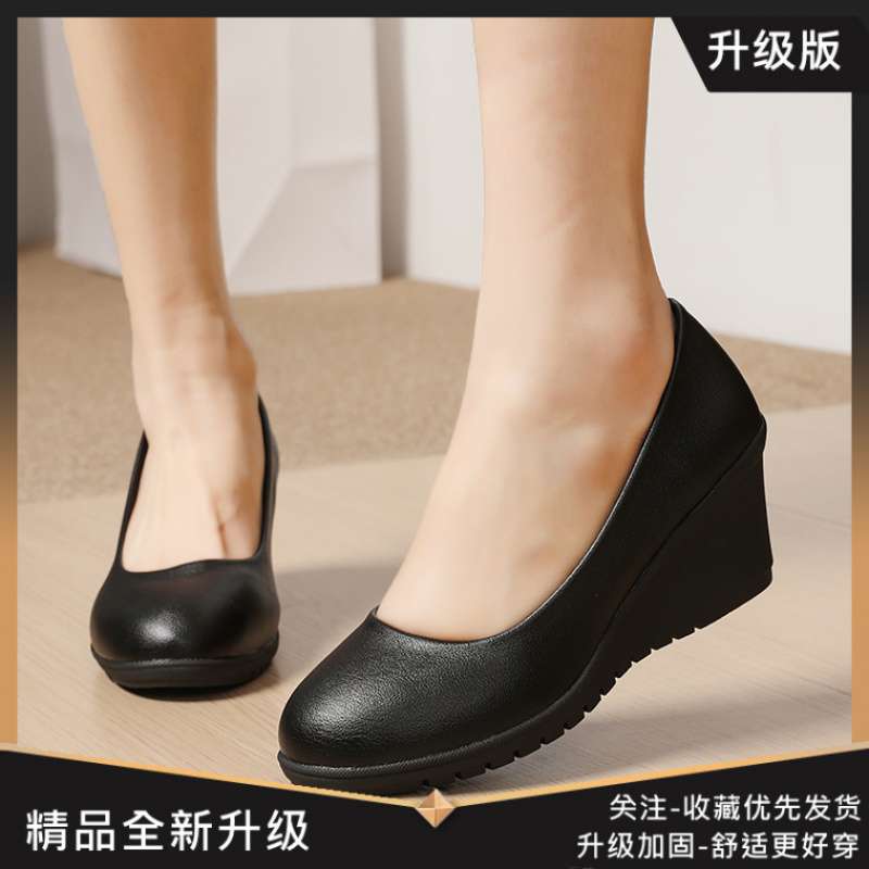 2025 봄 스타일 싱글 슈즈, 승무원이 오랫동안 서 있어도 발이 피곤하지 않은 웨지힐 부드러운 가죽 미끄럼 방지 작업화 여성용 검은색 가죽 신발스토어 가기