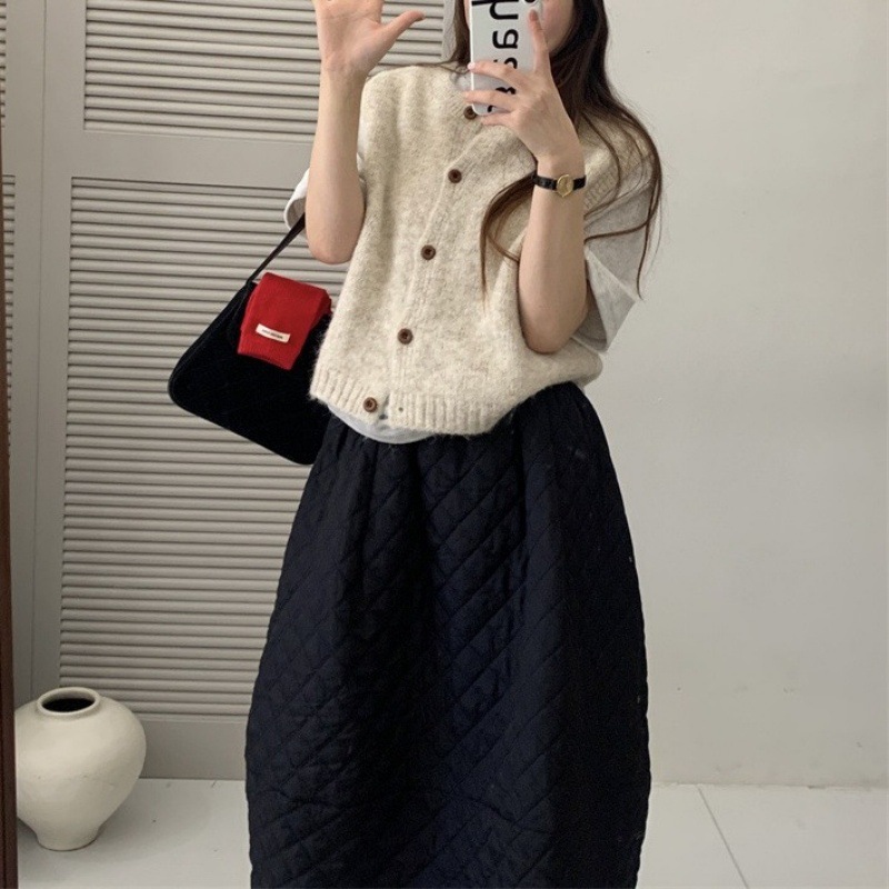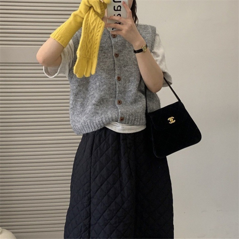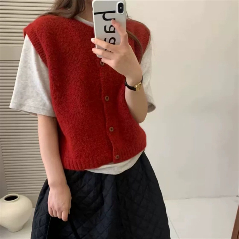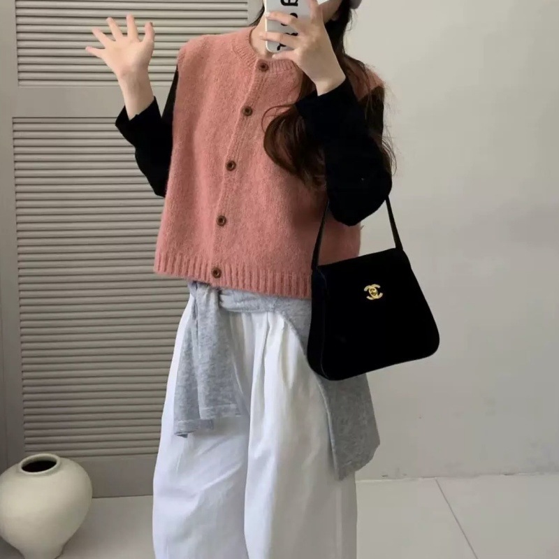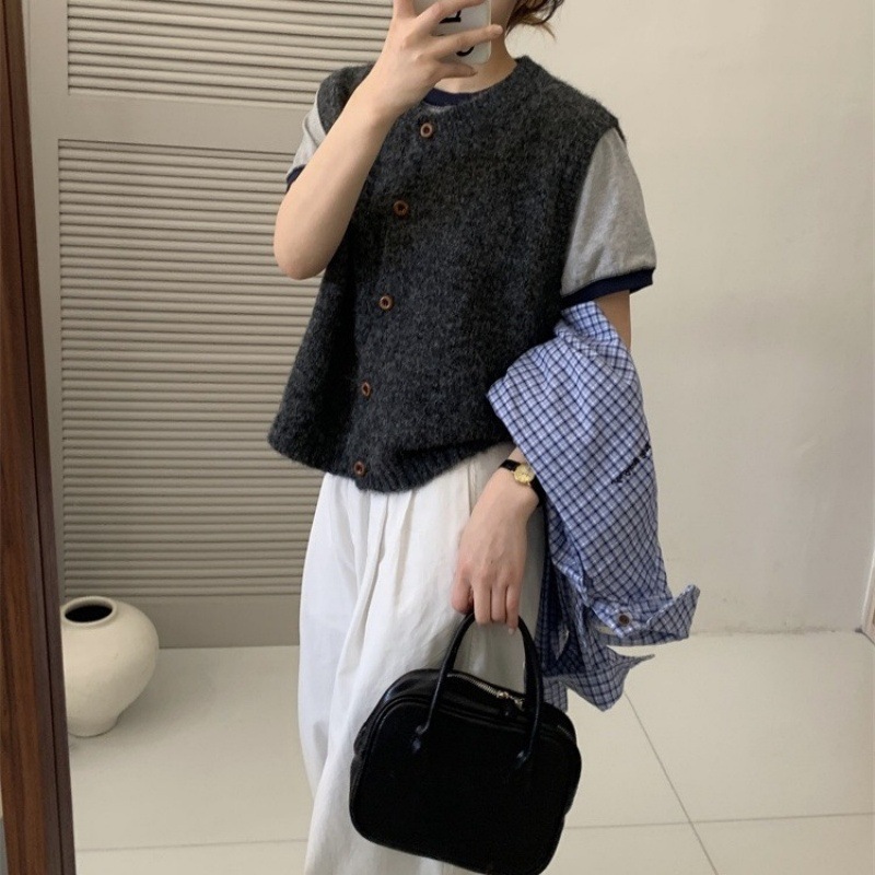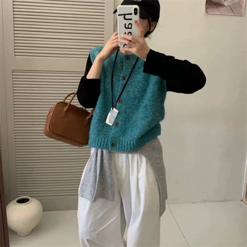 한국 복고풍 라운드 넥 싱글 브레스트 니트 조끼 여성 카디건 가을 느슨한 레이어드 양복 조끼 스웨터 조끼 탑