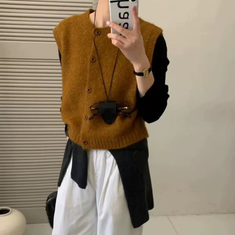 한국 복고풍 라운드 넥 싱글 브레스트 니트 조끼 여성 카디건 가을 느슨한 레이어드 양복 조끼 스웨터 조끼 탑스토어 가기