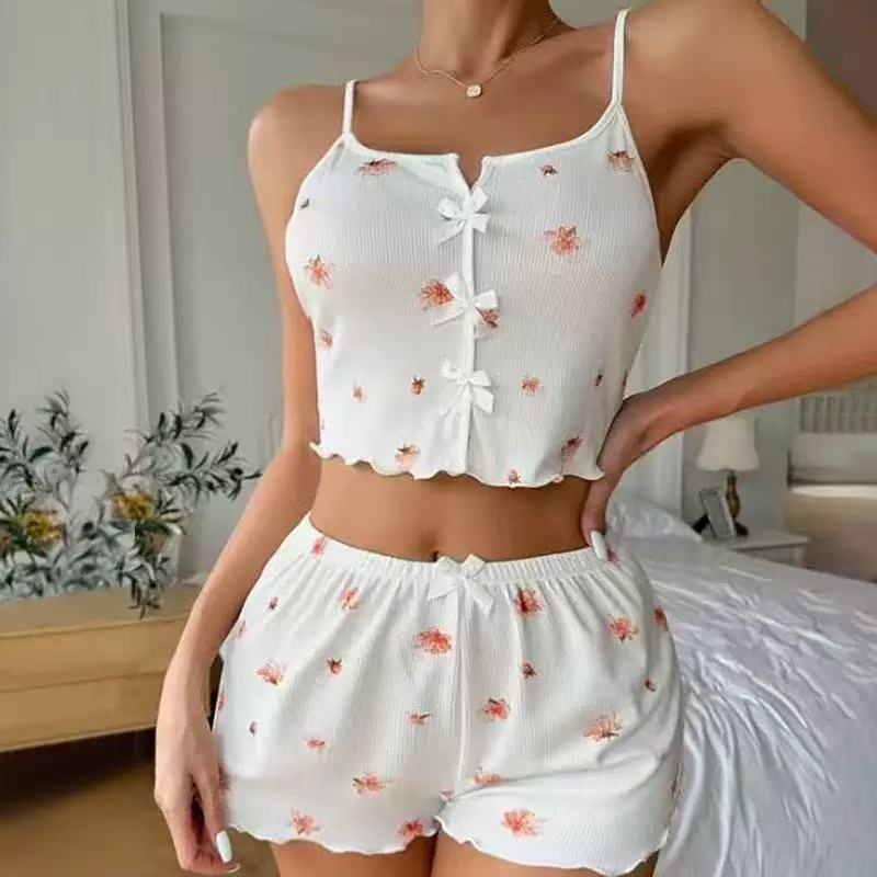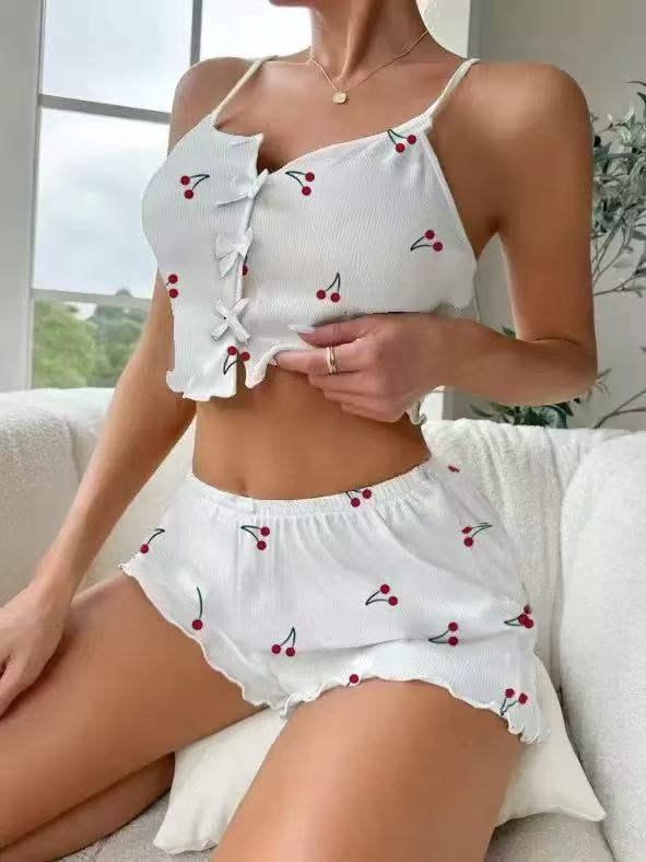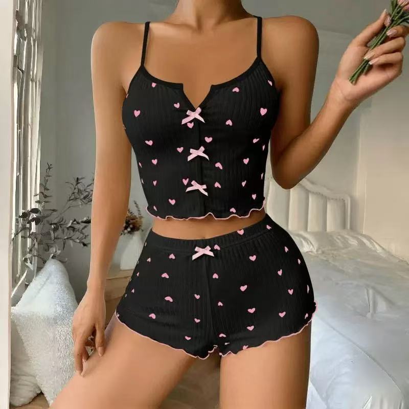 2024 Amazon AliExpress 신제품 하트 모양 프린트 대비 컬러 홈웨어 앞면 슬릿 서스펜더 파자마 세트스토어 가기