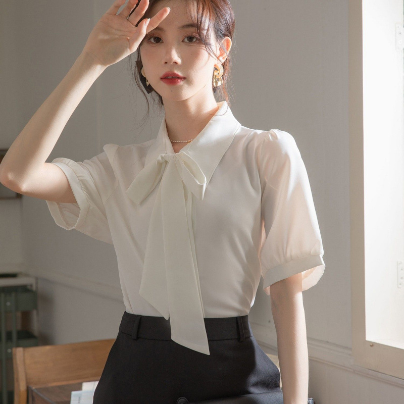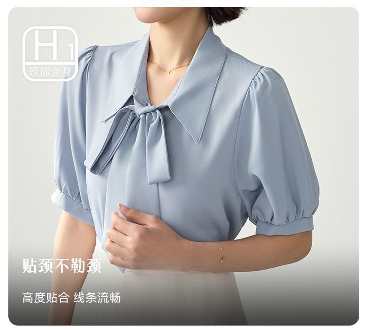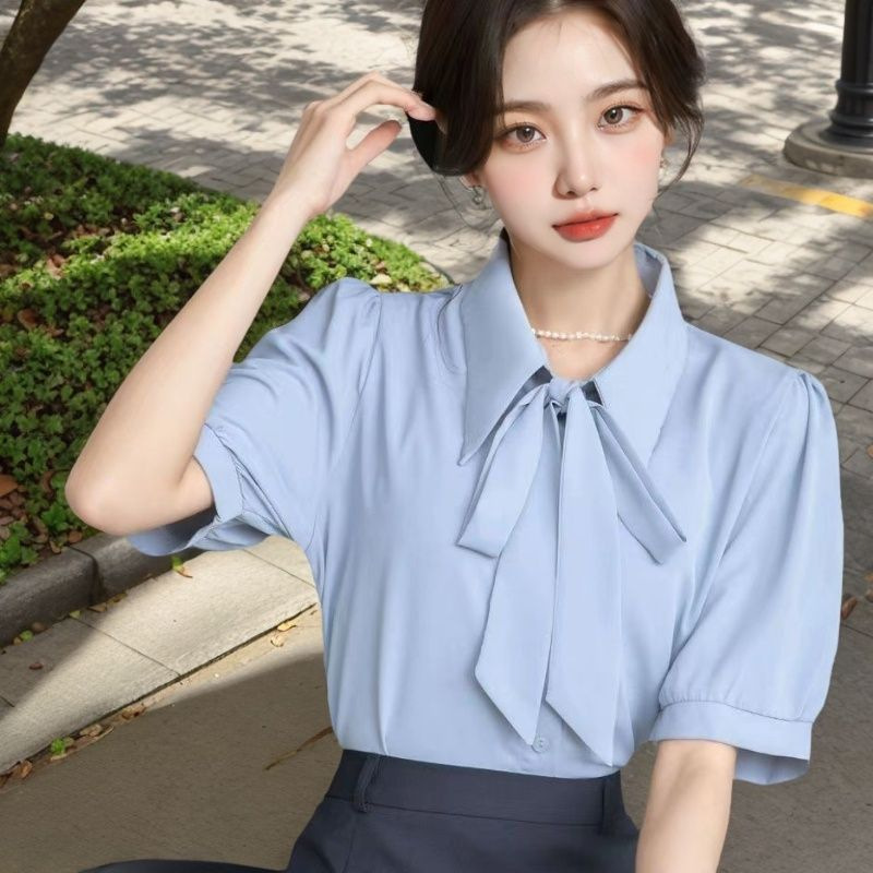 블루 쉬폰 셔츠 여성 반팔 여름 전문 정장 교사복 공무원 의류 경력 면접복