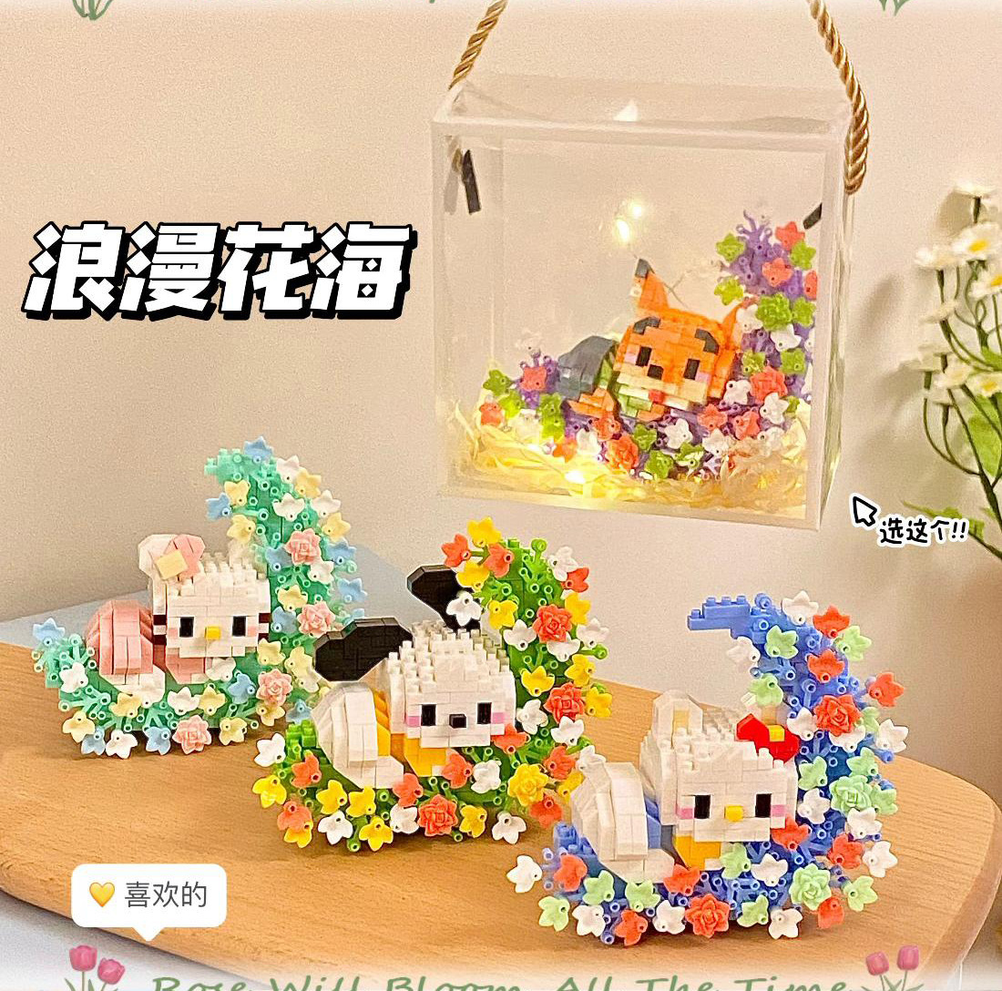 HelloKitty Pacha 개 계피 작은 입자 빌딩 블록 꽃 생일 선물 소녀 교육 조립 장난감스토어 가기