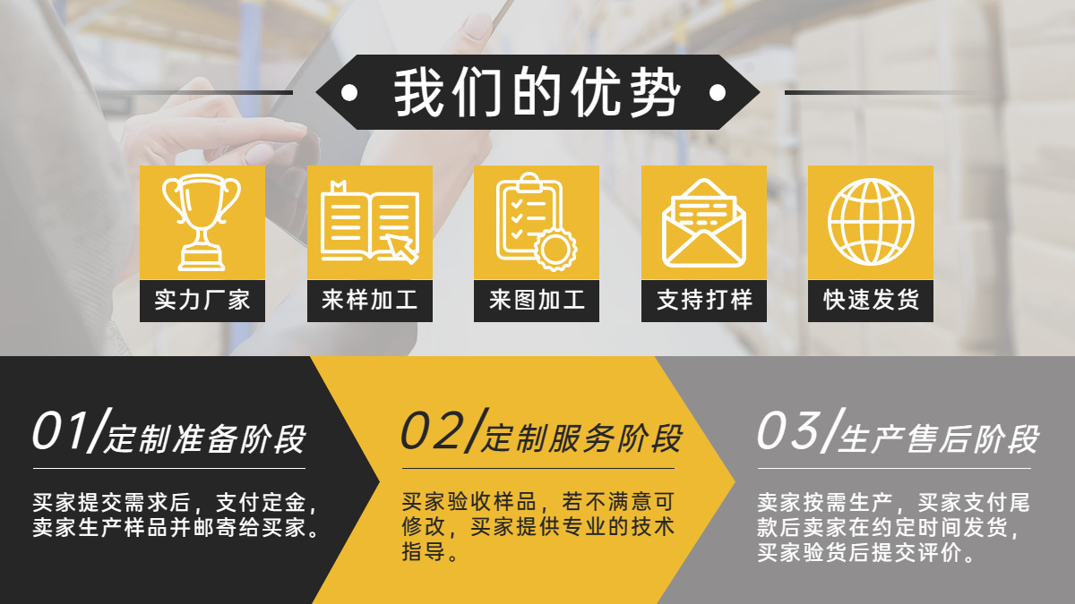 3.我们支持现货代发和混批采购,以及支持来样定制、来图定制服务。