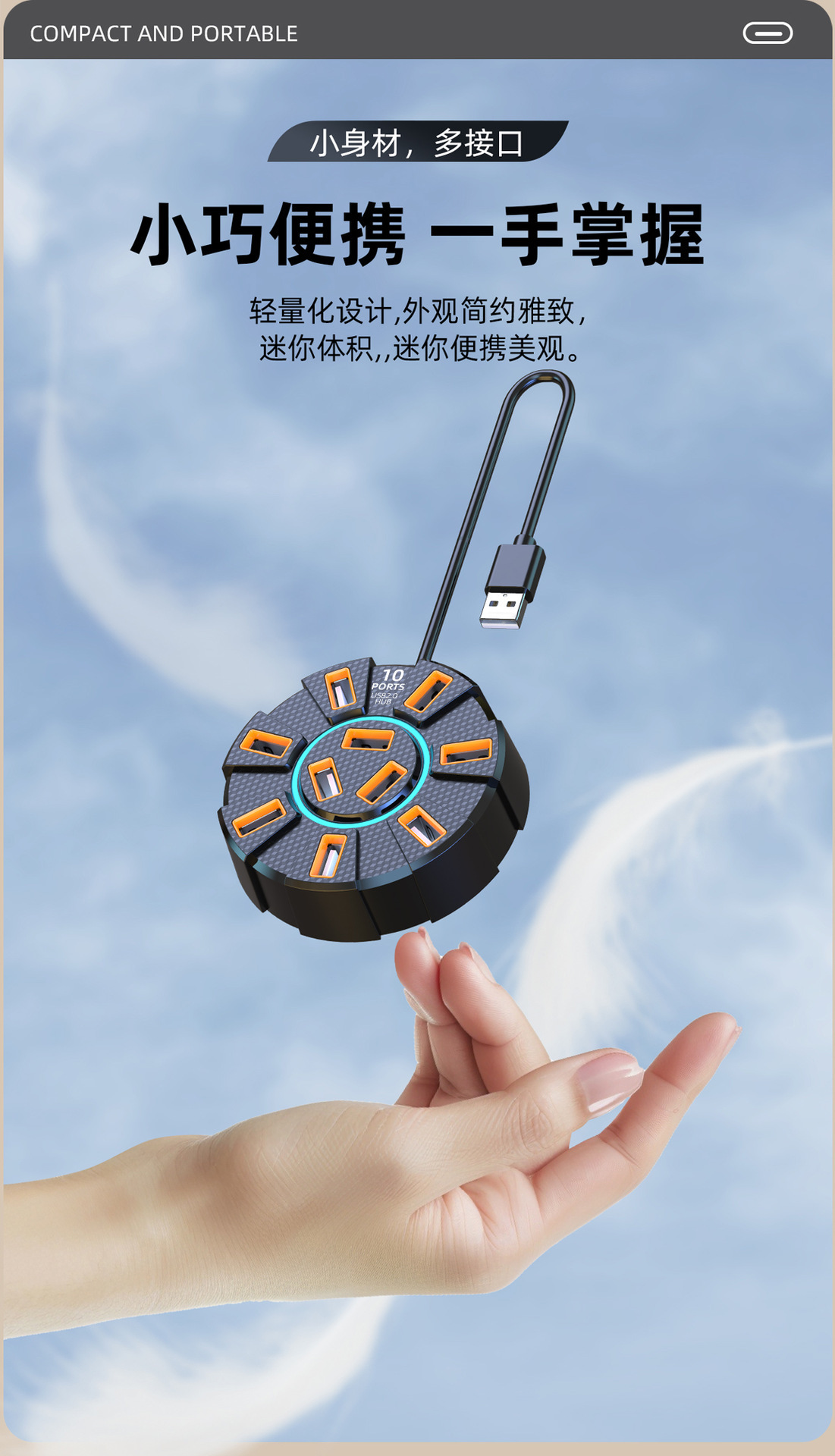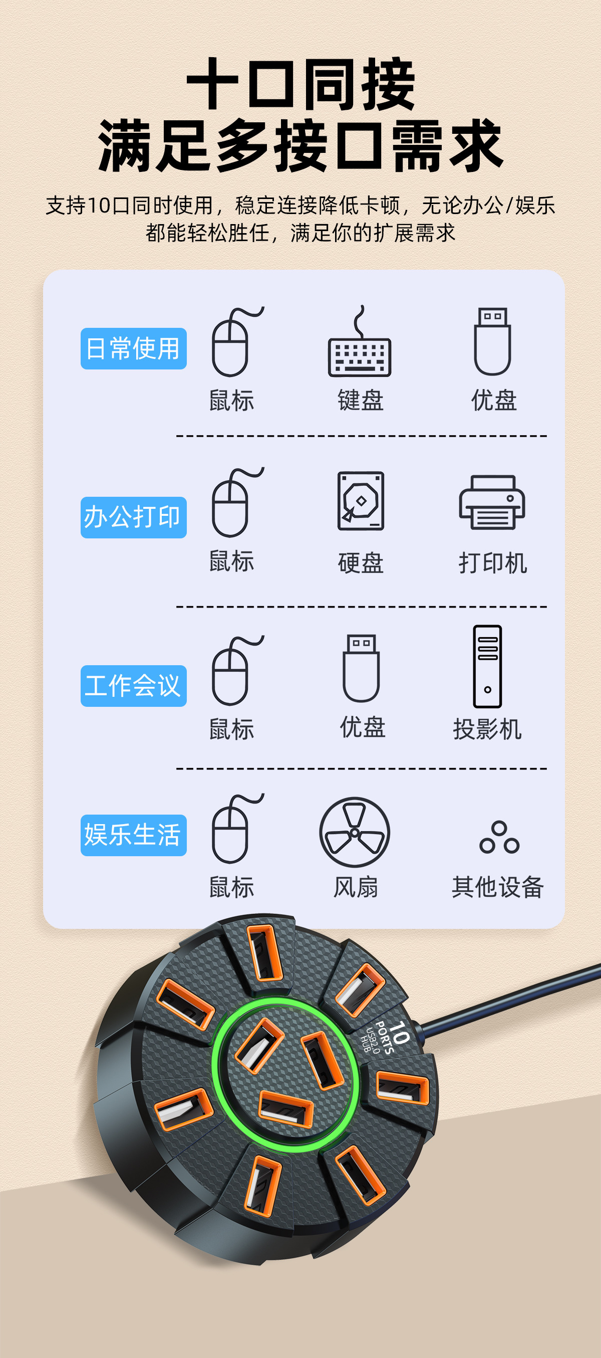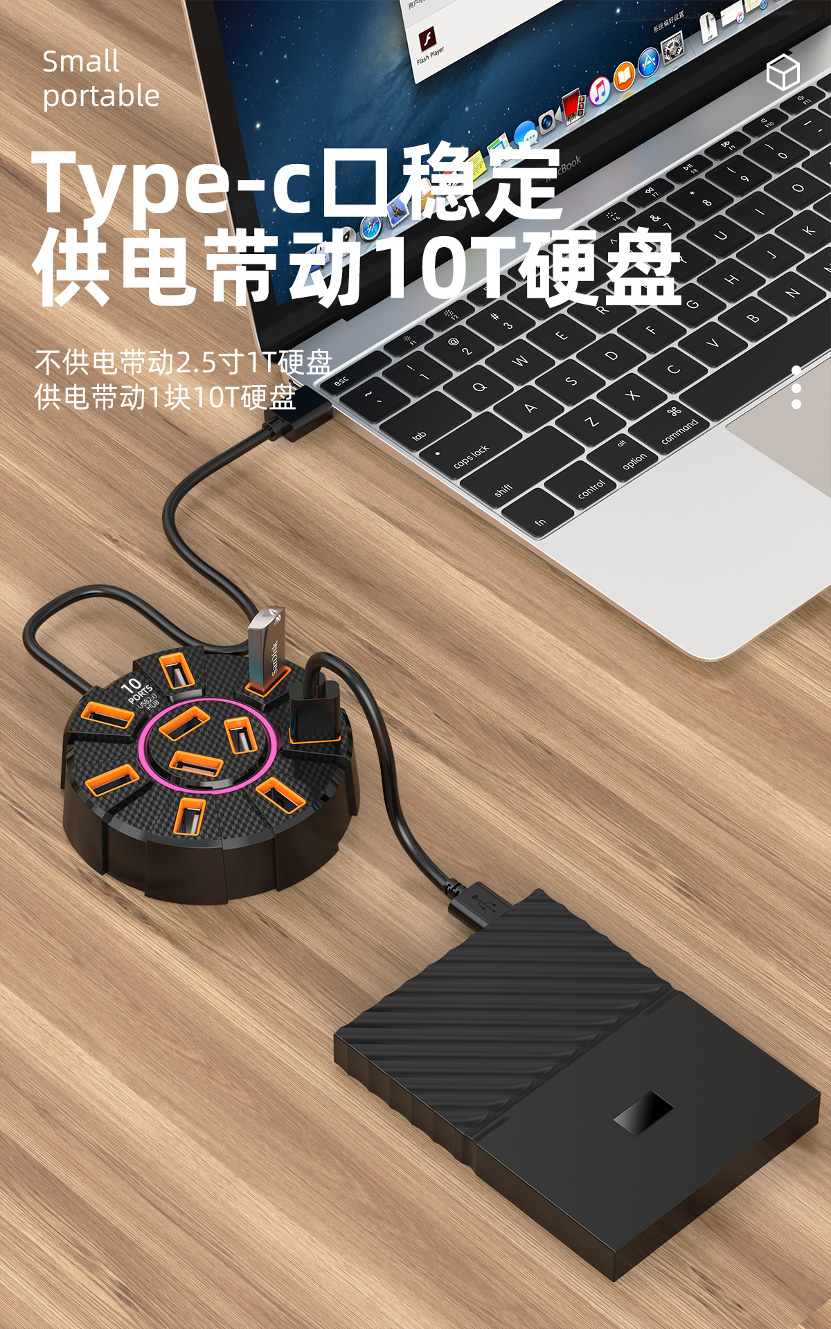 다채로운 눈부심 10포트 USB2.0 분배기 도킹 스테이션 | 독립 전원 공급 장치 포트가 있는 1-10 허브