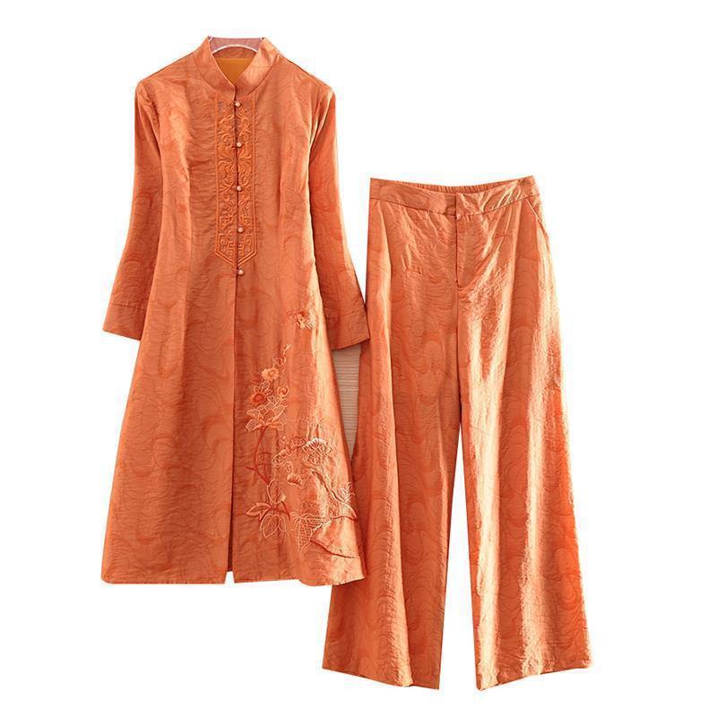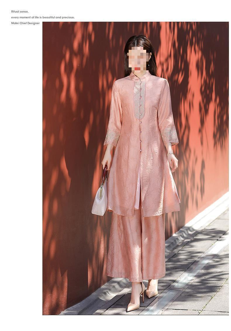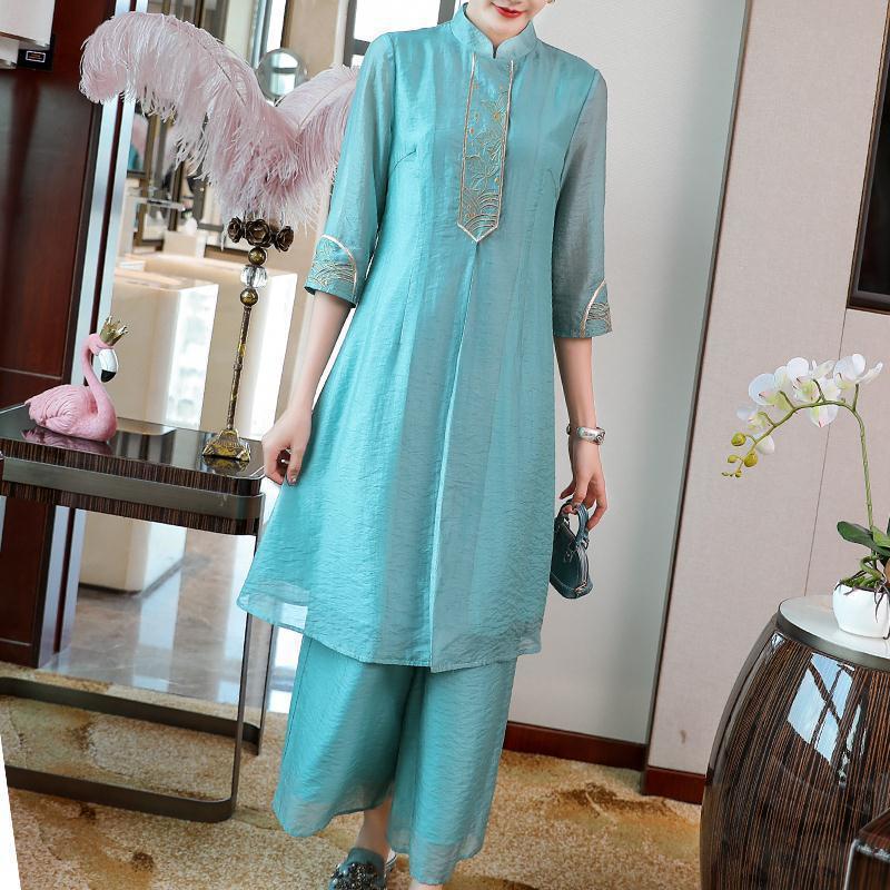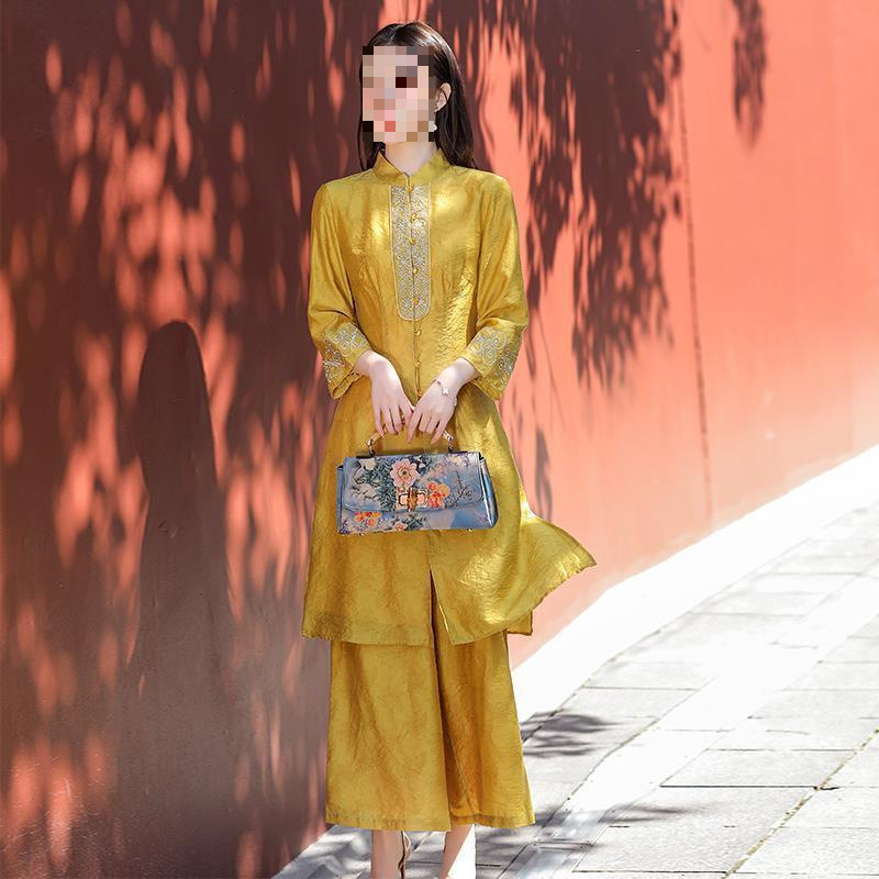 여성을위한 복고풍 민족 스타일 치파오 2021 여름과 가을 새로운 투피스 양복 외국 스타일 엄마 탑 와이드 레그 스커트 정장