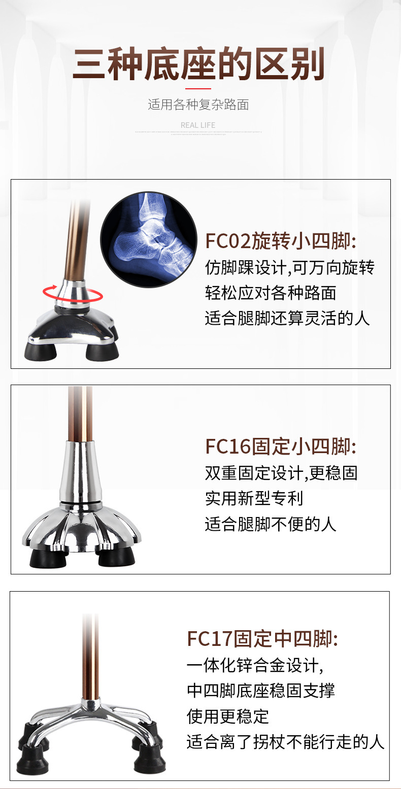 일본 Lelafu 알루미늄 합금 4발 노인용 지팡이, 미끄럼 방지 경량 마사지 지팡이, 조명 지팡이가 있는 텔레스코픽 지팡이