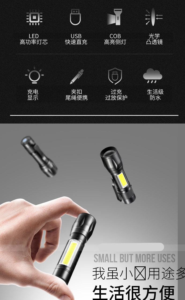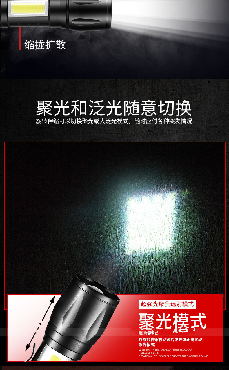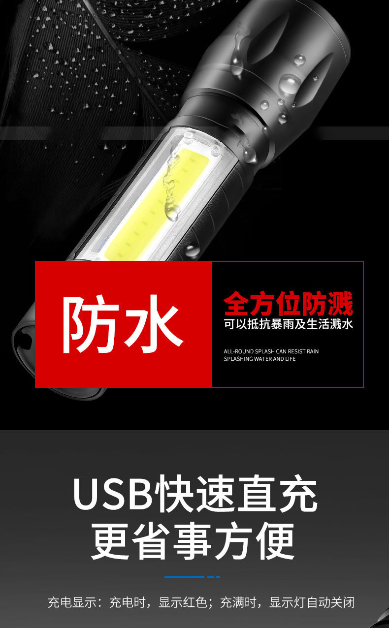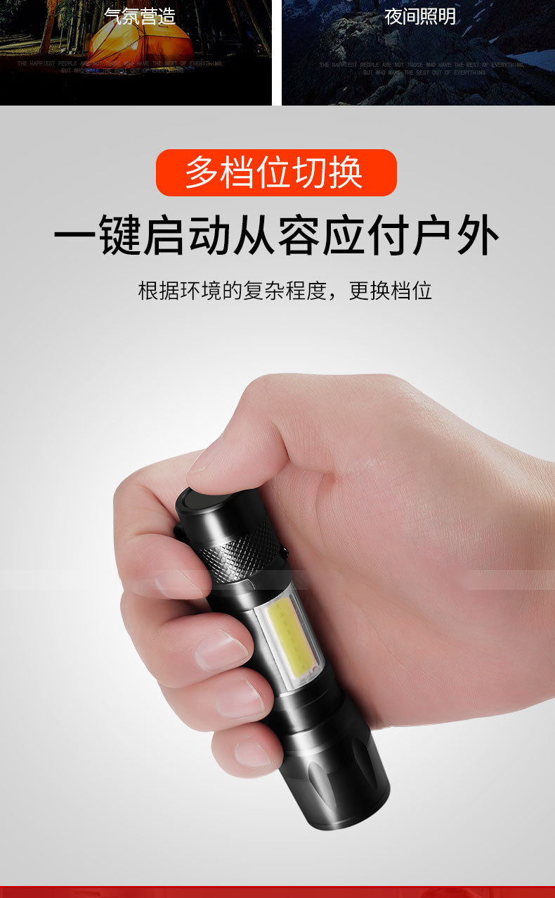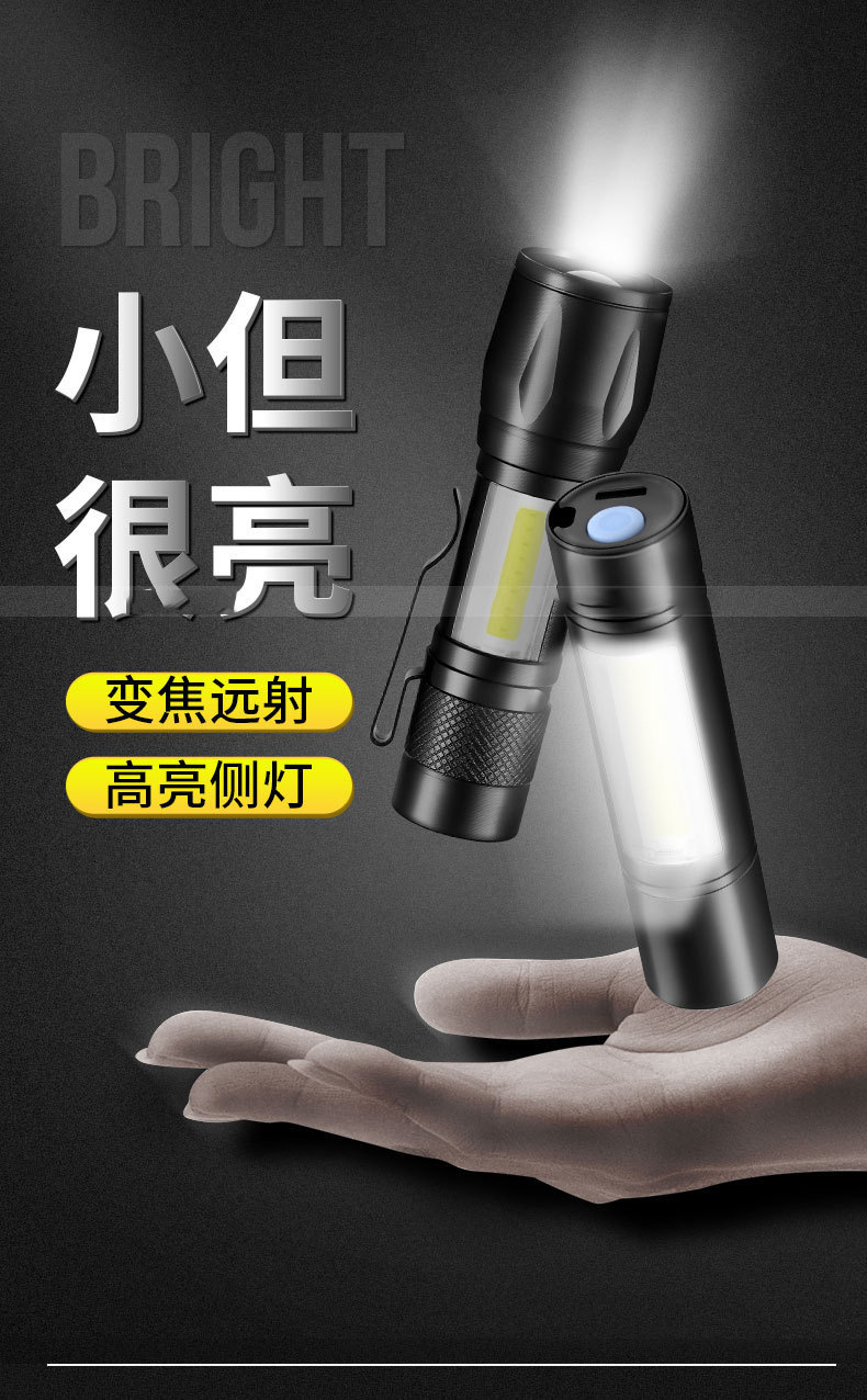 LED 미니 손전등 강한 빛 충전식 긴 배터리 수명 야외 휴대용 다기능 줌 비상 cob 작업 조명