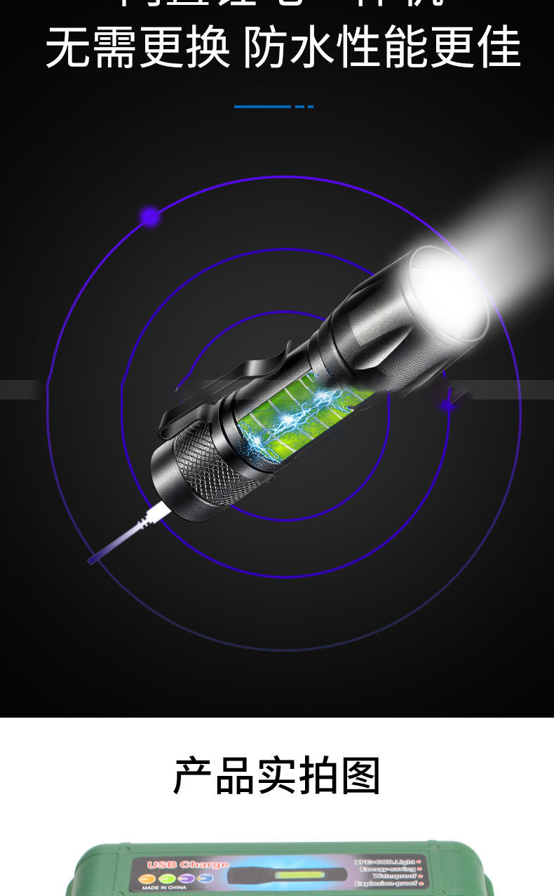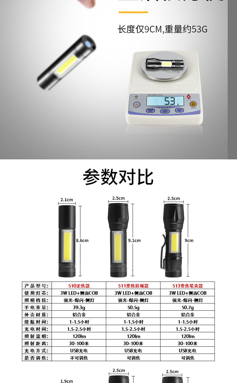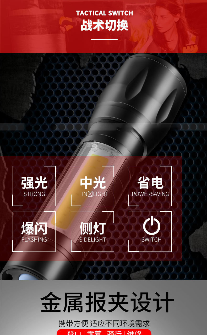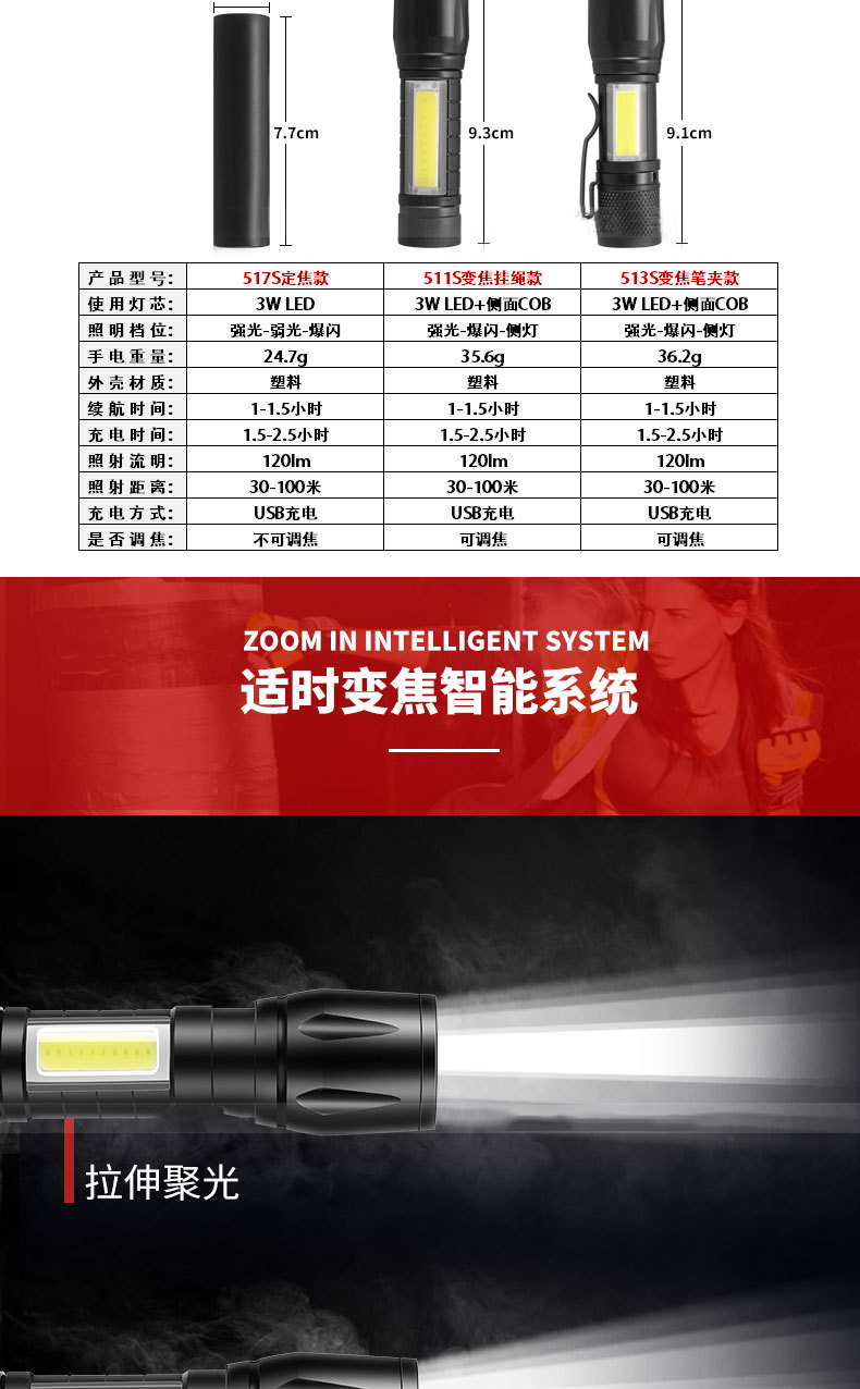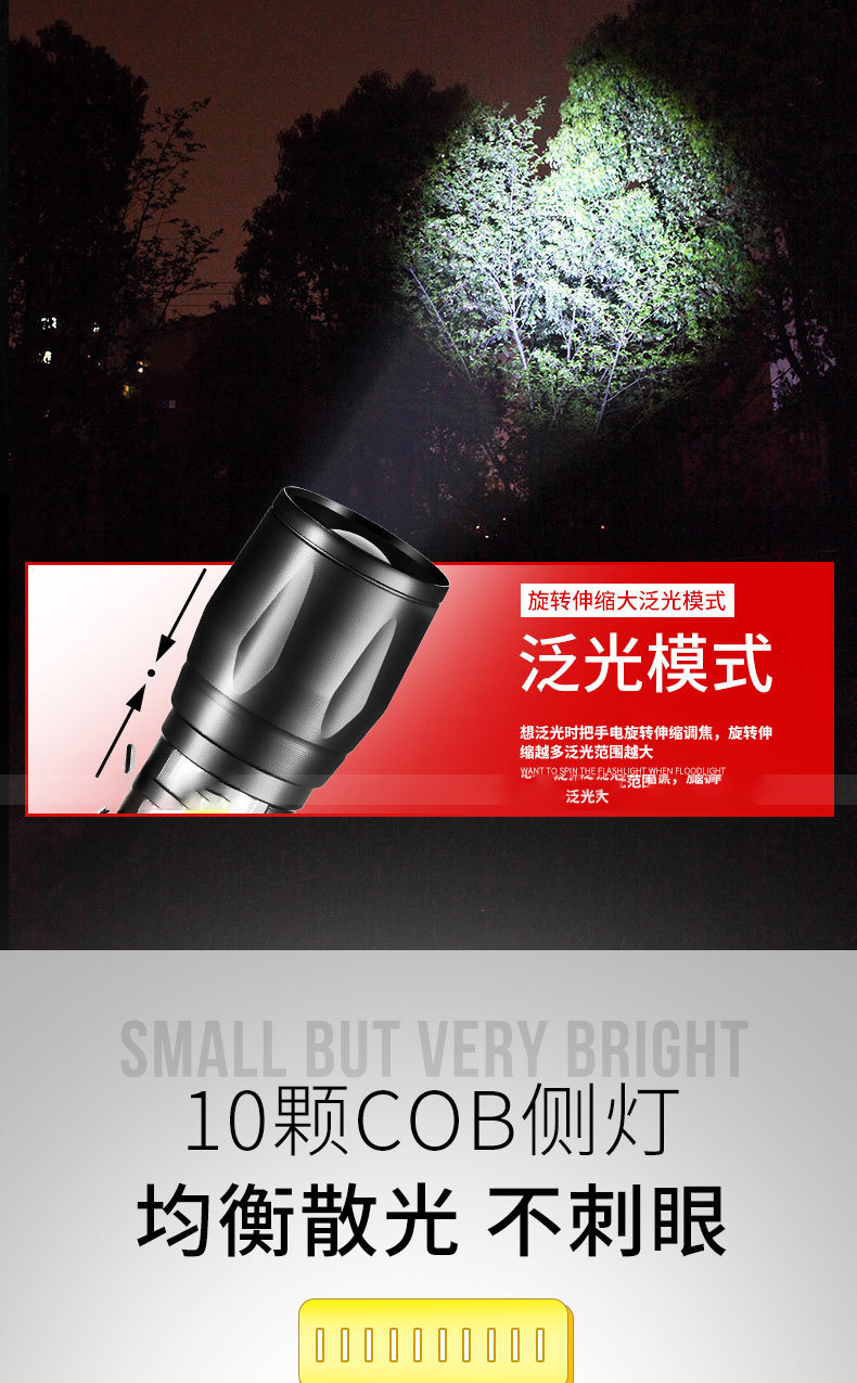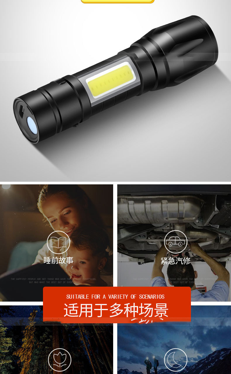 LED 미니 손전등 강한 빛 충전식 긴 배터리 수명 야외 휴대용 다기능 줌 비상 cob 작업 조명