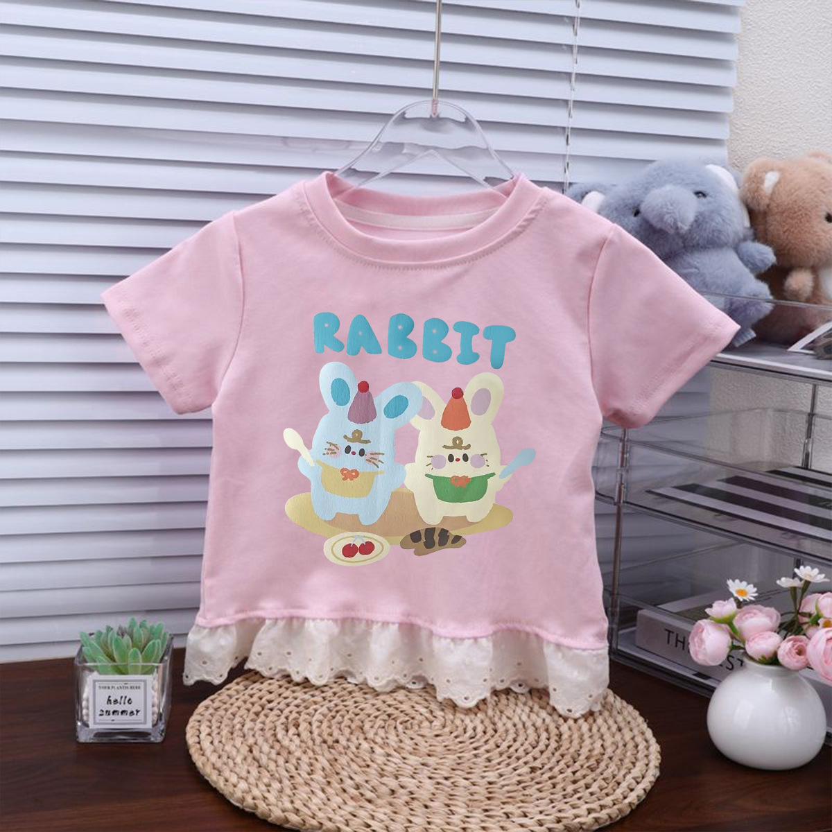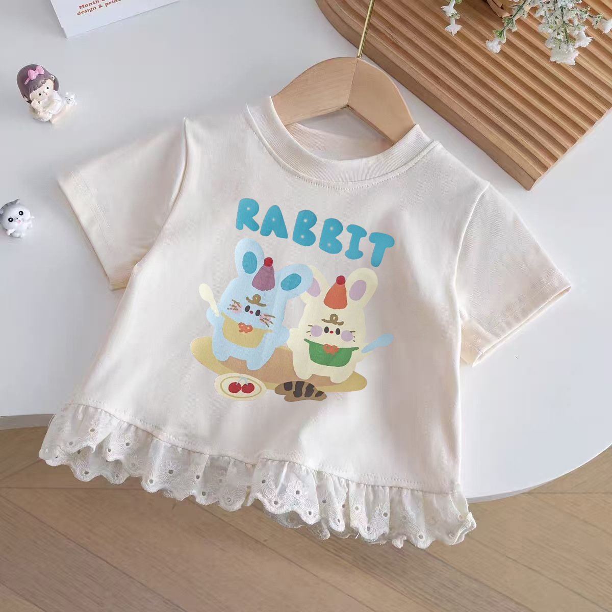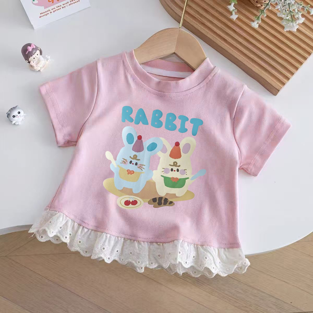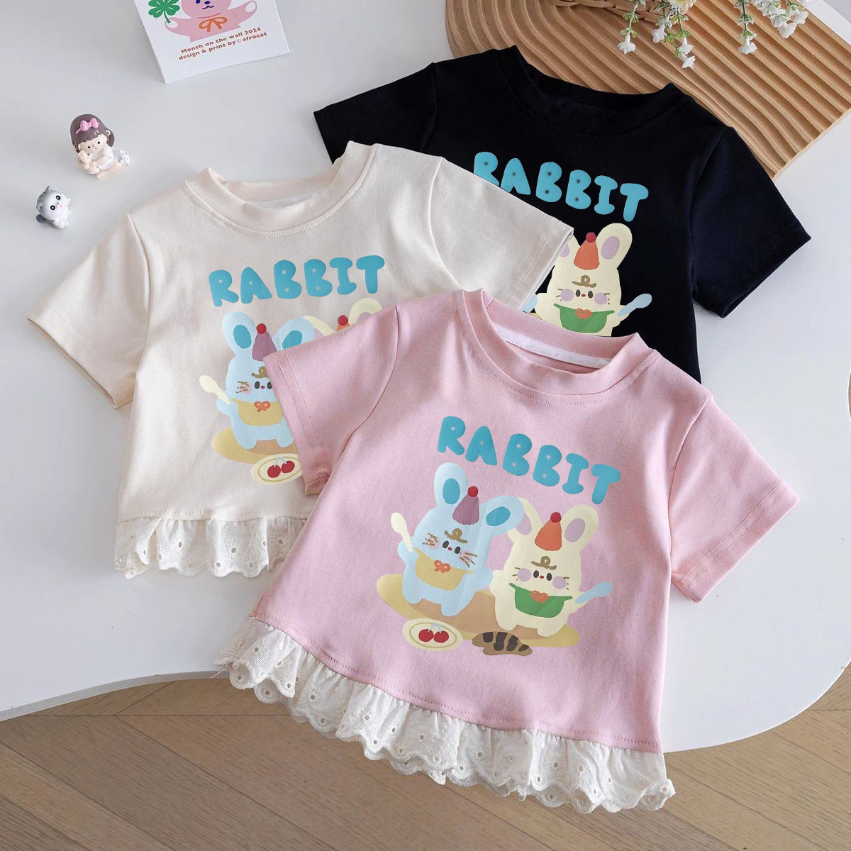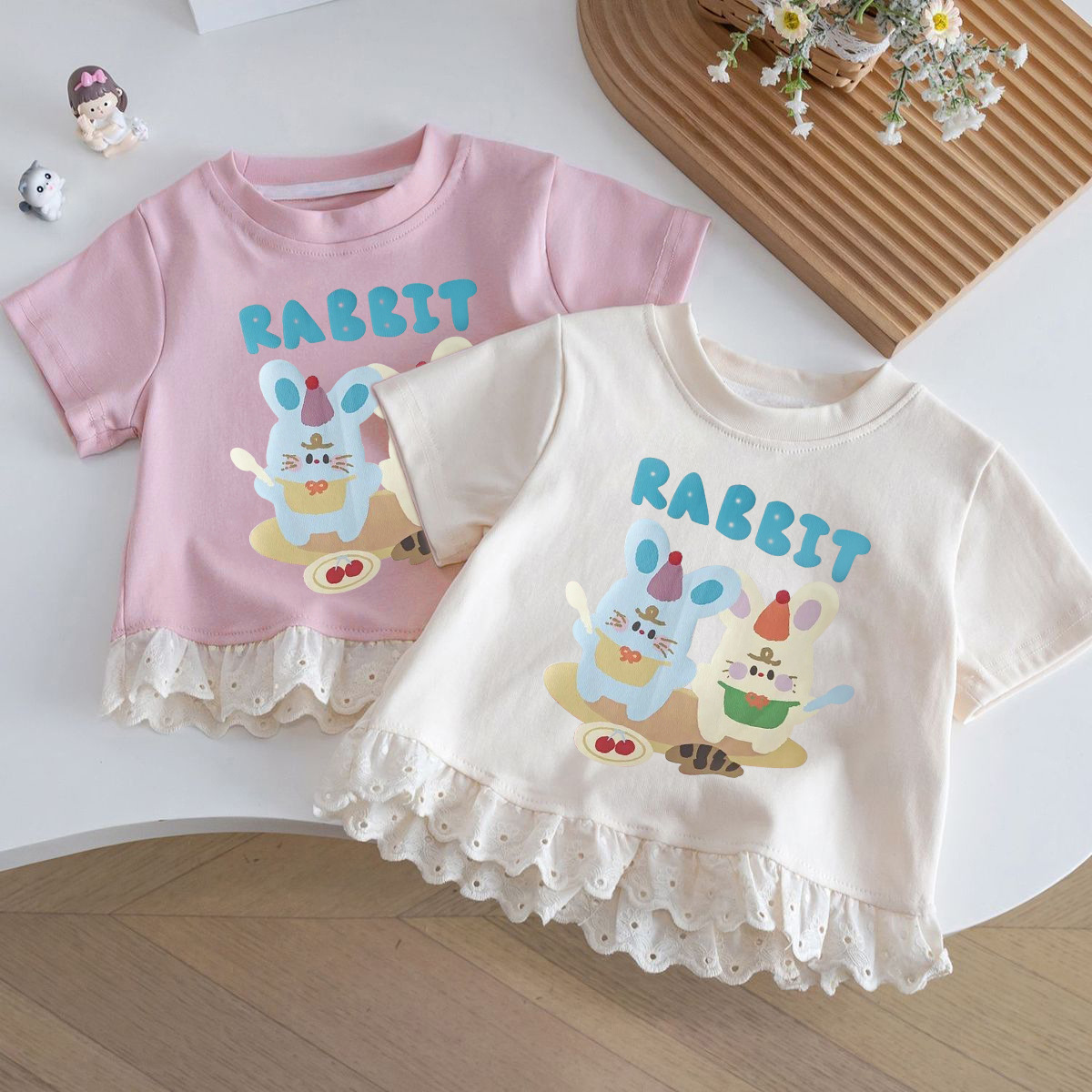 2025년 여름 새로운 스타일의 만화 달콤하고 세련된 프린트 여아 베이비 아동 레이스 반팔 티셔츠 탑 아우터 t스토어 가기