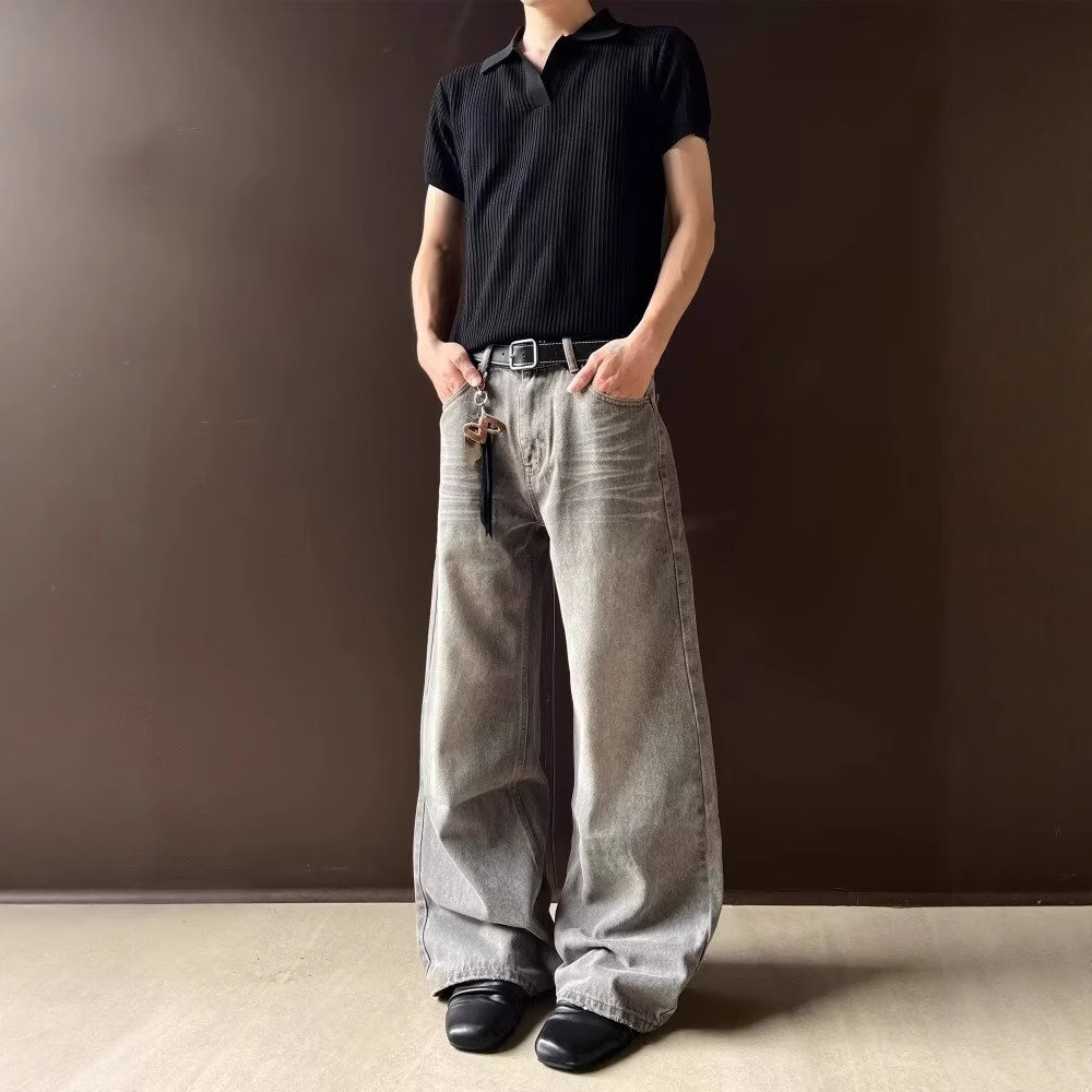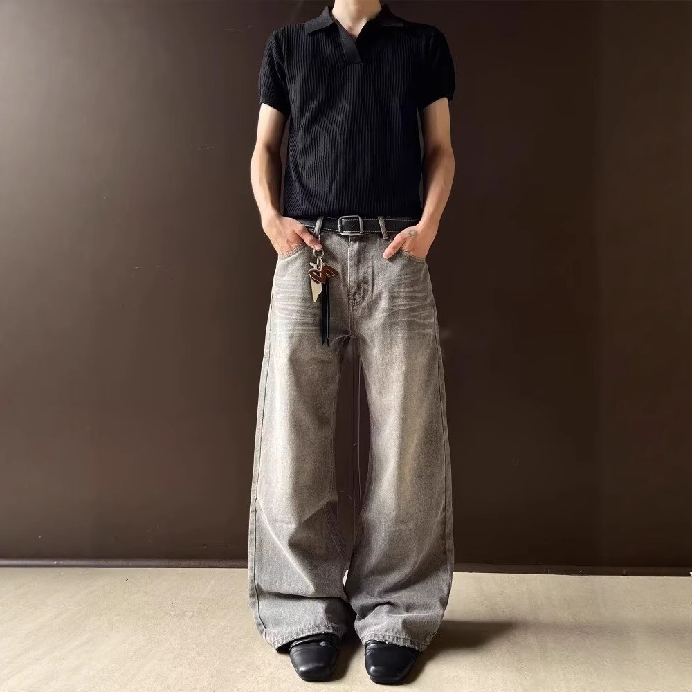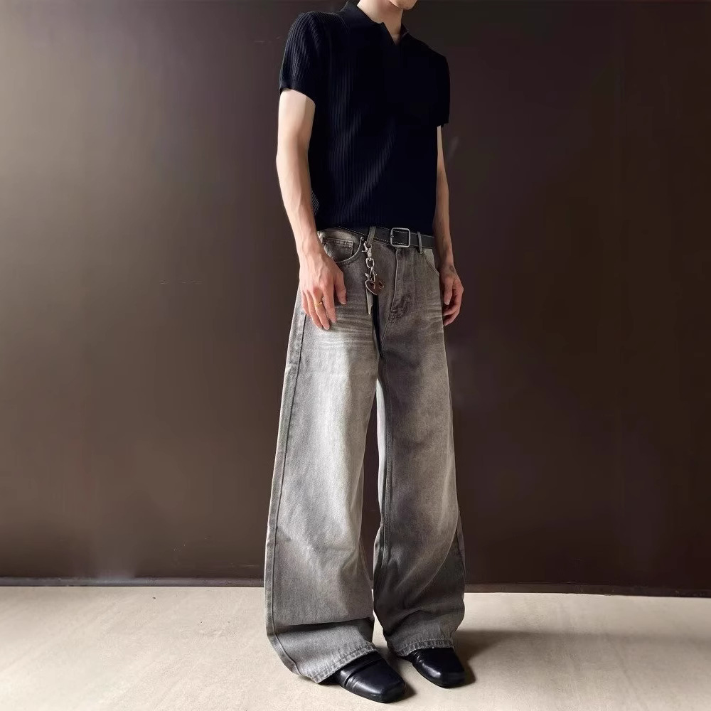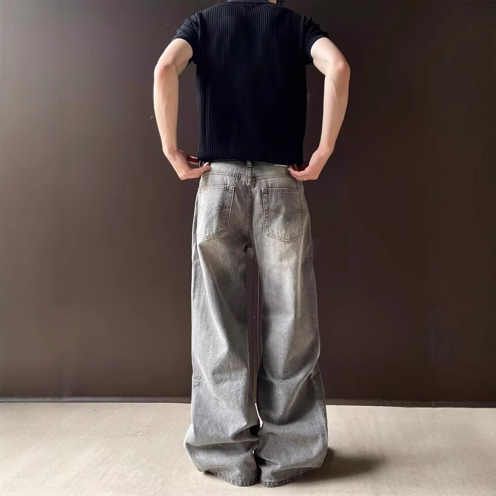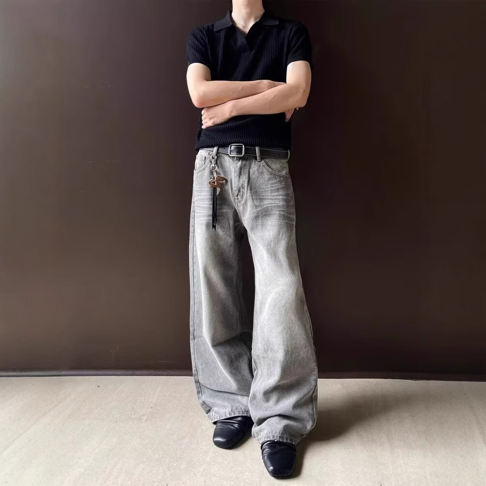 크로스보더 아메리칸 레트로 클린핏 워싱 및 디스트레스드 하이엔드 위스커 라이트 그레이 남성용 루즈 스트레이트 청바지스토어 가기