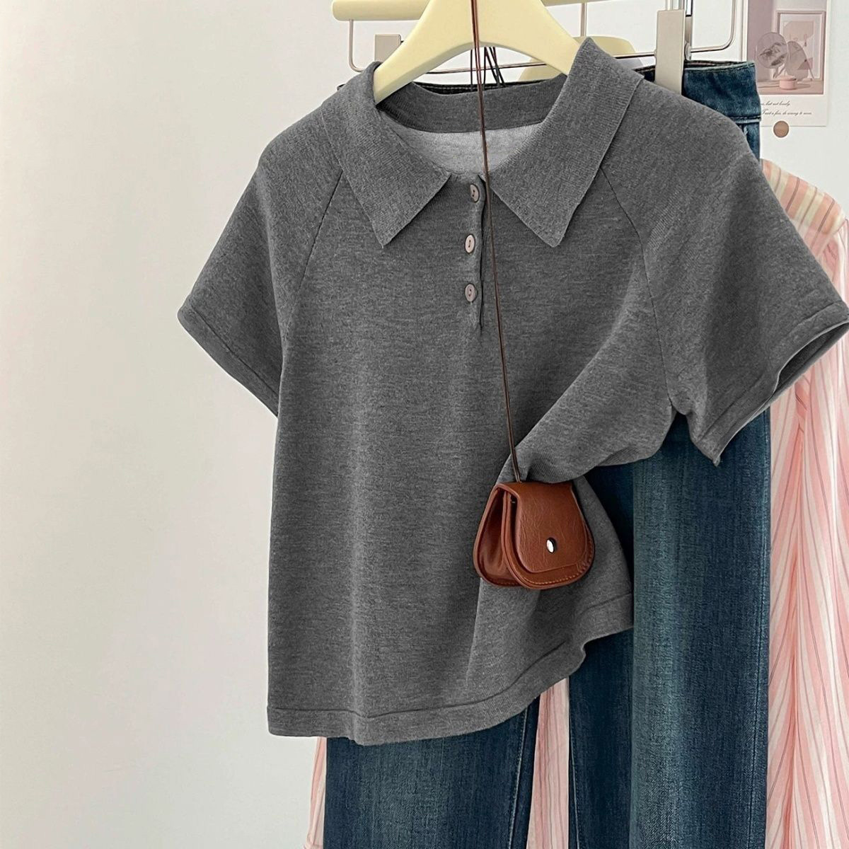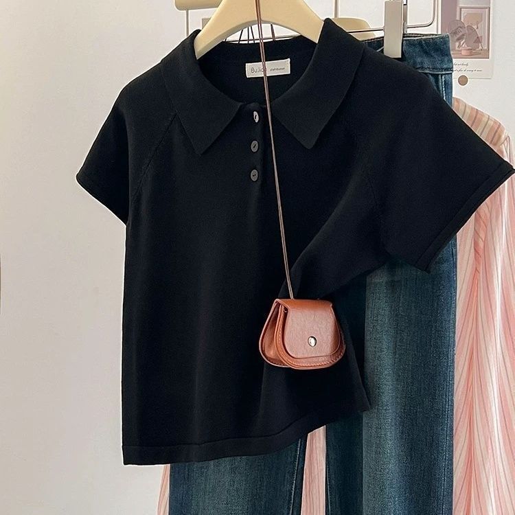 여름 폴로 칼라 반팔 티셔츠 여성 여름 하이 엔드 오른쪽 어깨 디자인 느슨한 슬리밍 짧은 스타일 트렌드스토어 가기