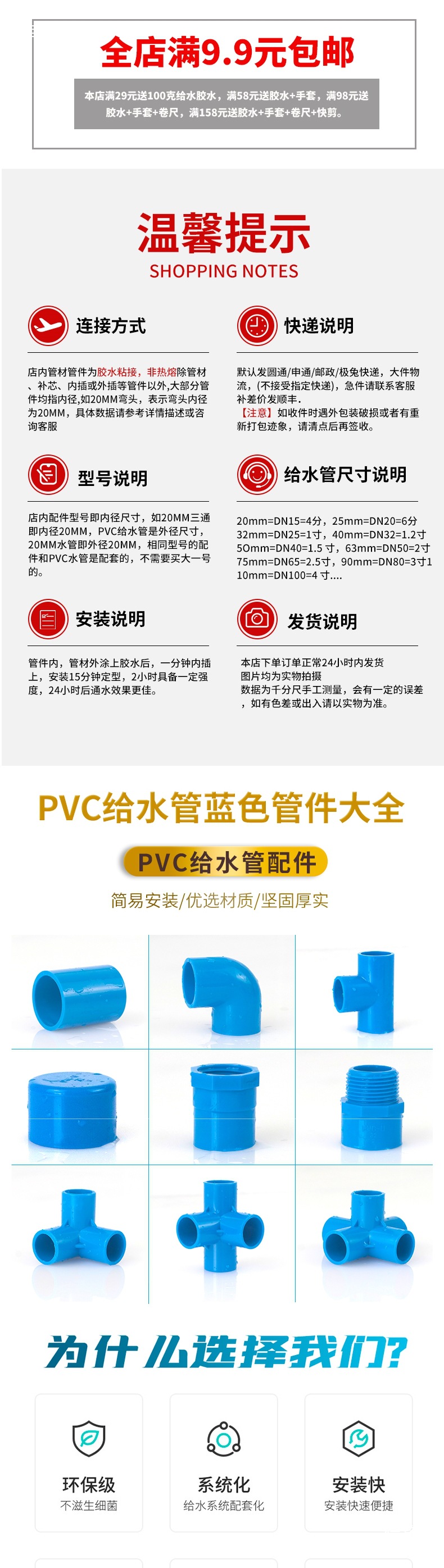 PVC 수도관 액세서리 엘보우 3방향 4방향 직접 물고기 탱크 상부 및 하부 급수 파이프 피팅 플라스틱 조인트 접착제 파란색스토어 가기