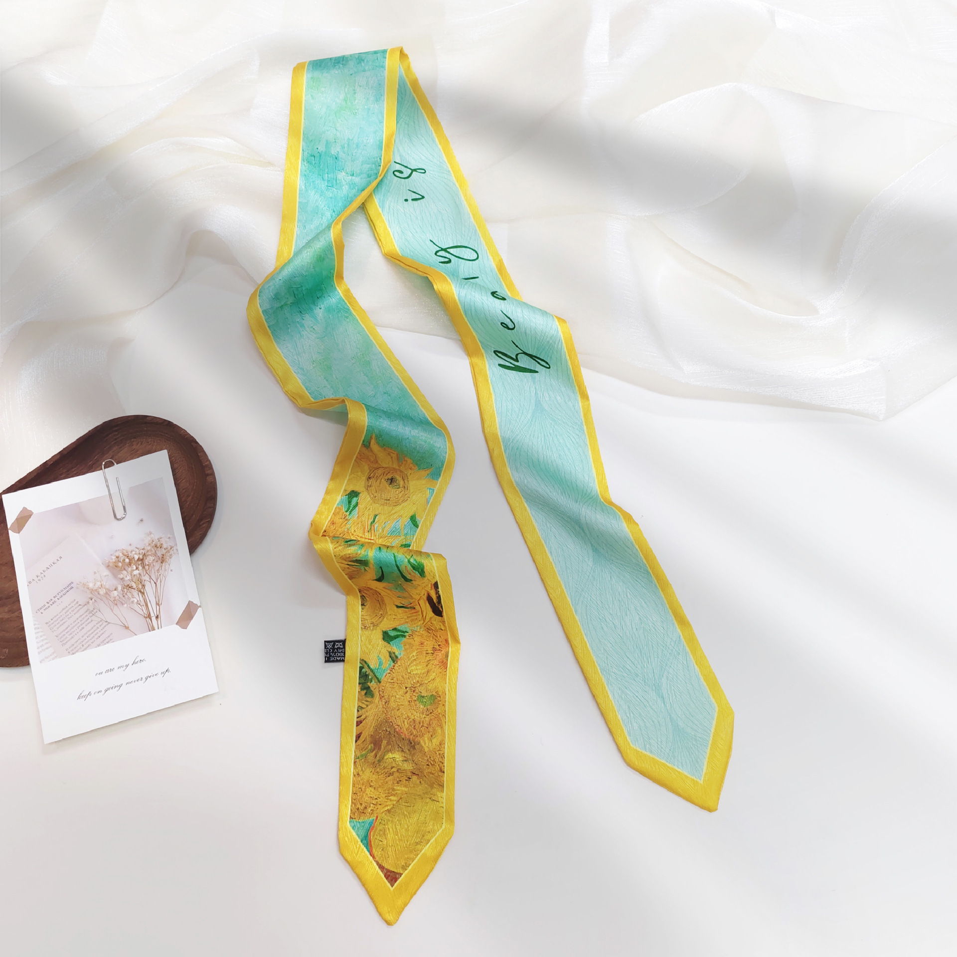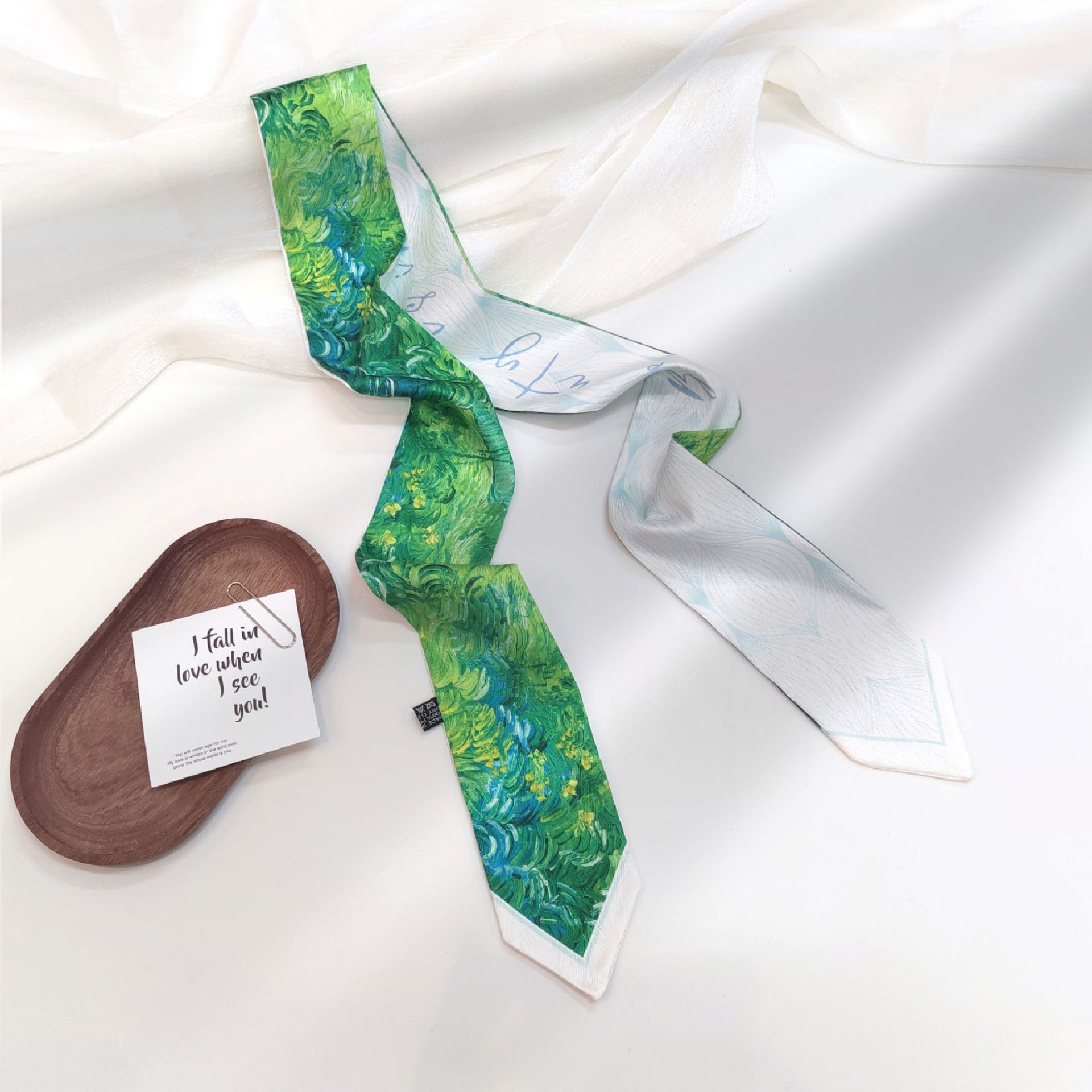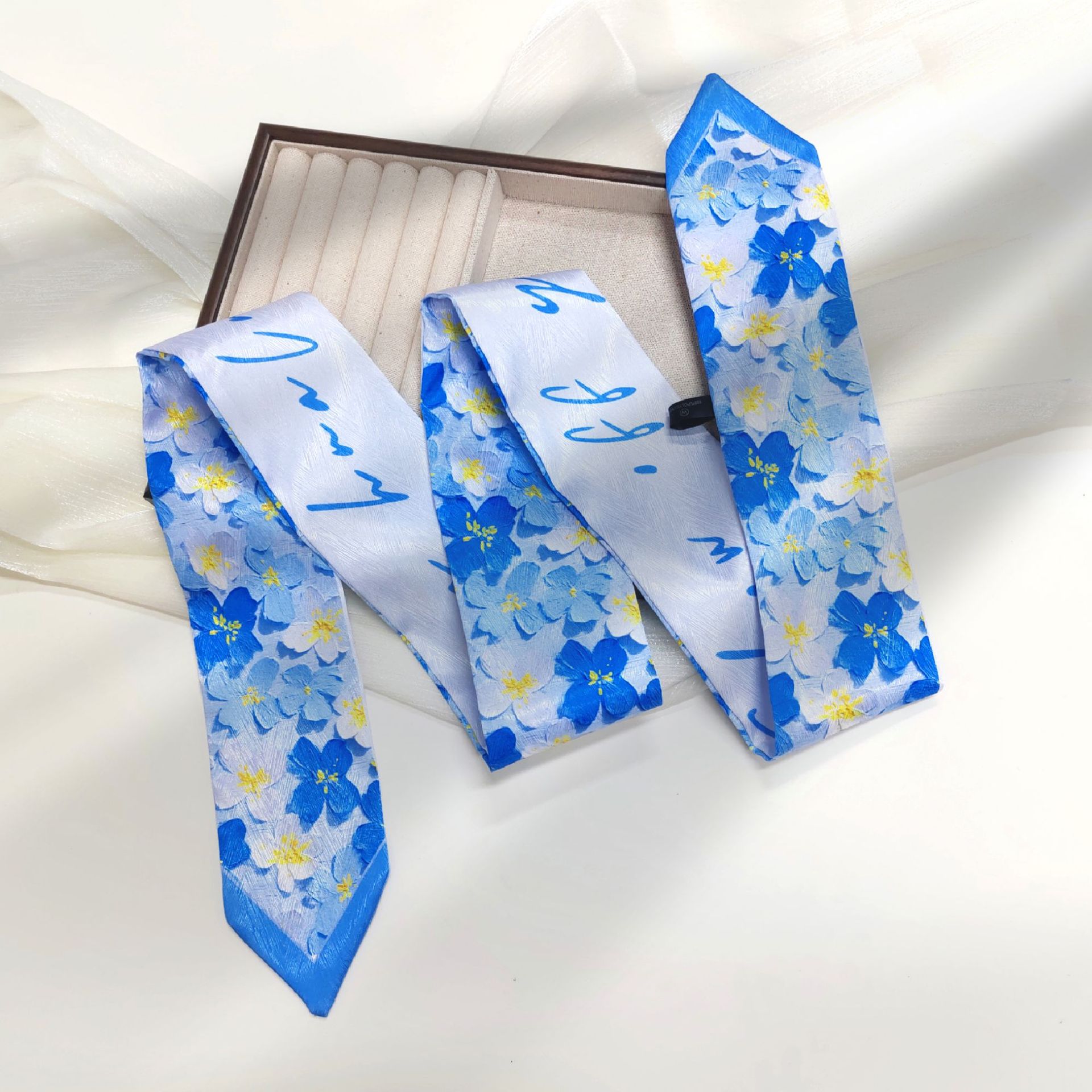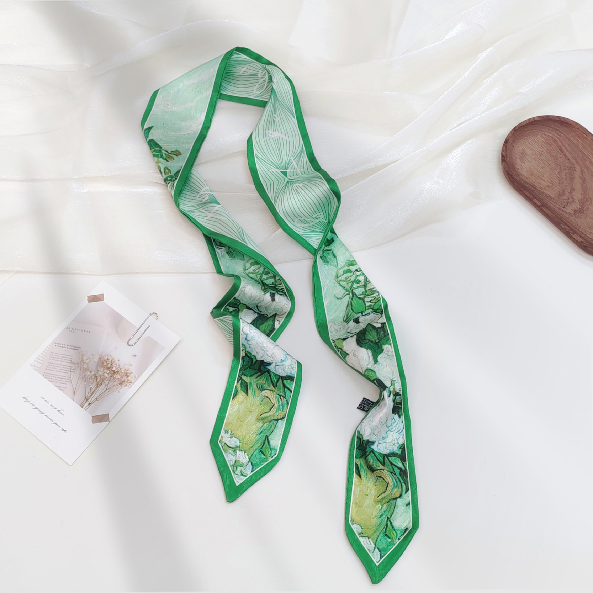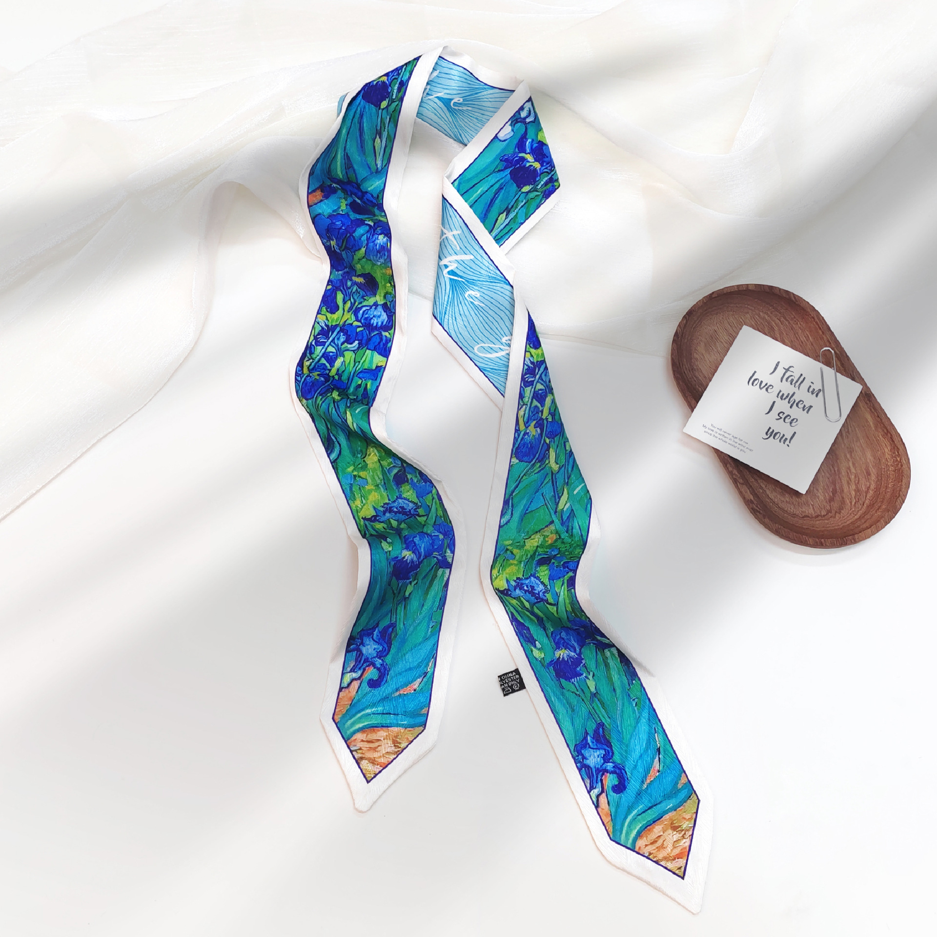 반 고흐의 흰색 아이리스 유화 실크 스카프 여성용 패턴 다용도 긴 머리끈과 가방 리본 뾰족한 작은 스카프