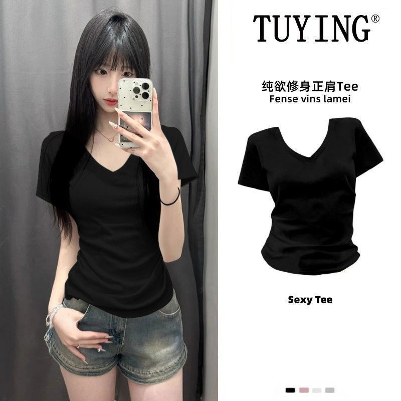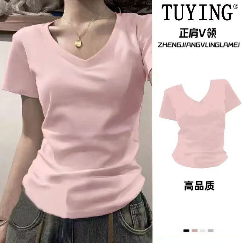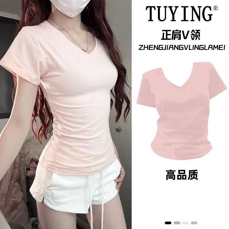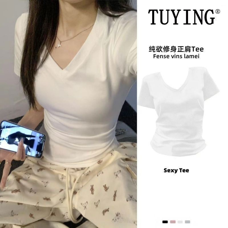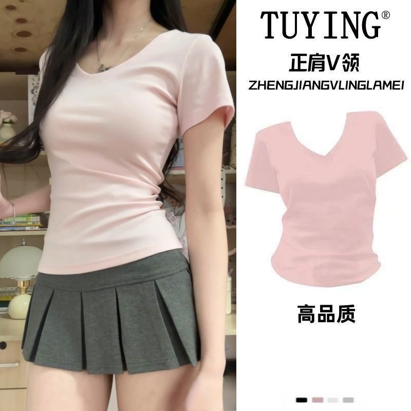 여성용 아메리칸 브이넥 퓨어 코튼 오른쪽 어깨 여름 반팔 티셔츠, 화이트 슬림핏 핫걸 바텀 셔츠 탑스토어 가기