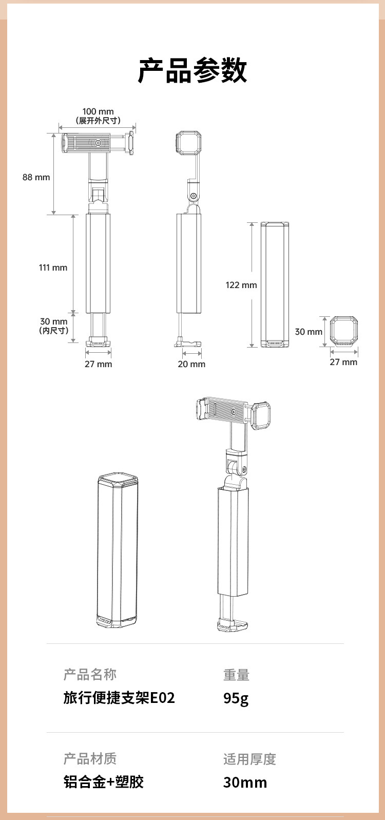 고속철도 및 비행기 여행용 휴대폰 홀더, 휴대용, 회전식 360도 기차 및 고속열차 출장 셀카봉