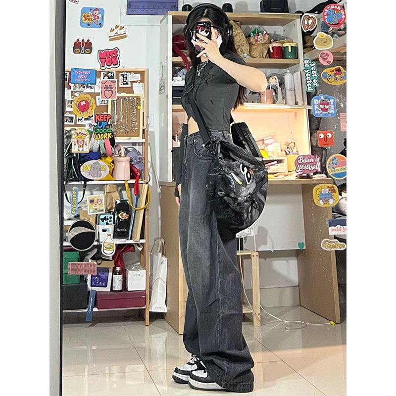 여름 여성을 위한 아메리칸 하이 스트리트 레트로 디스트레스드 와이드 레그 청바지 새로운 스타일 하이 웨이스트 슬림 루즈 스트레이트 바닥 길이 바지스토어 가기