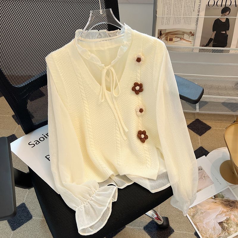 여성을위한 쉬폰 셔츠 투피스 세트가있는 프렌치 니트 조끼 가을 새로운 달콤한 연령 감소 긴팔 스타일 탑스토어 가기