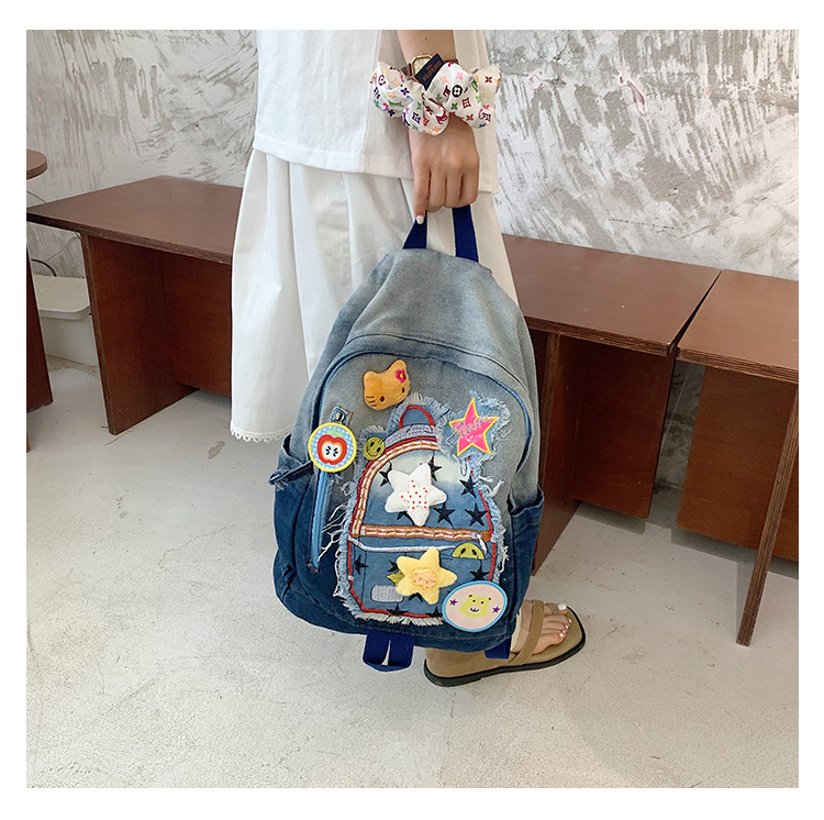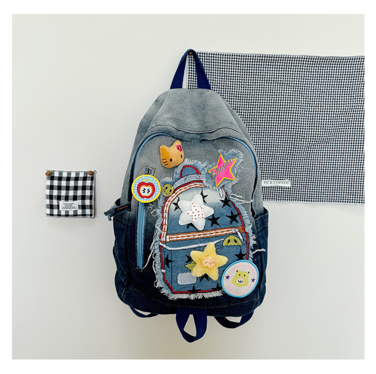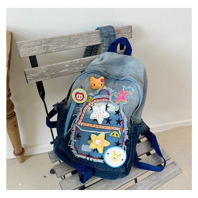 홈메이드 밀레니엄 그라데이션 데님 배낭 여성 스타 KT 고양이 대용량 빈티지 스타일 학생 배낭 학교 가방스토어 가기
