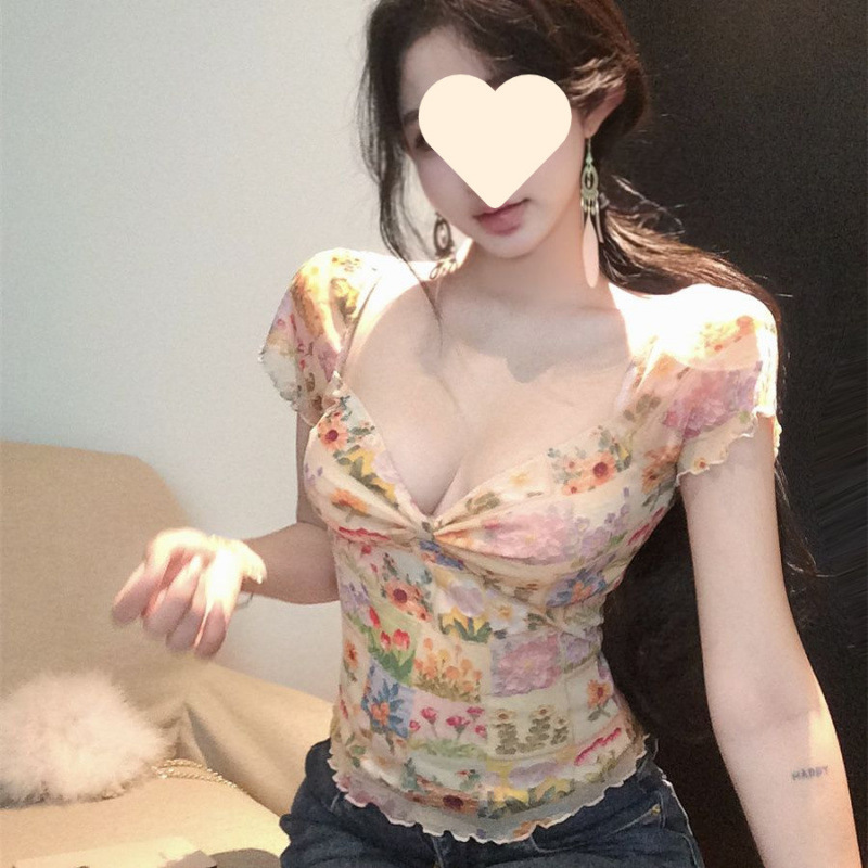 레트로 유화 스타일 작은 꽃무늬 브이넥 반팔 탑 여름 신작 순수한 욕망 아름다운 메쉬 귀여운 소녀 티셔츠스토어 가기