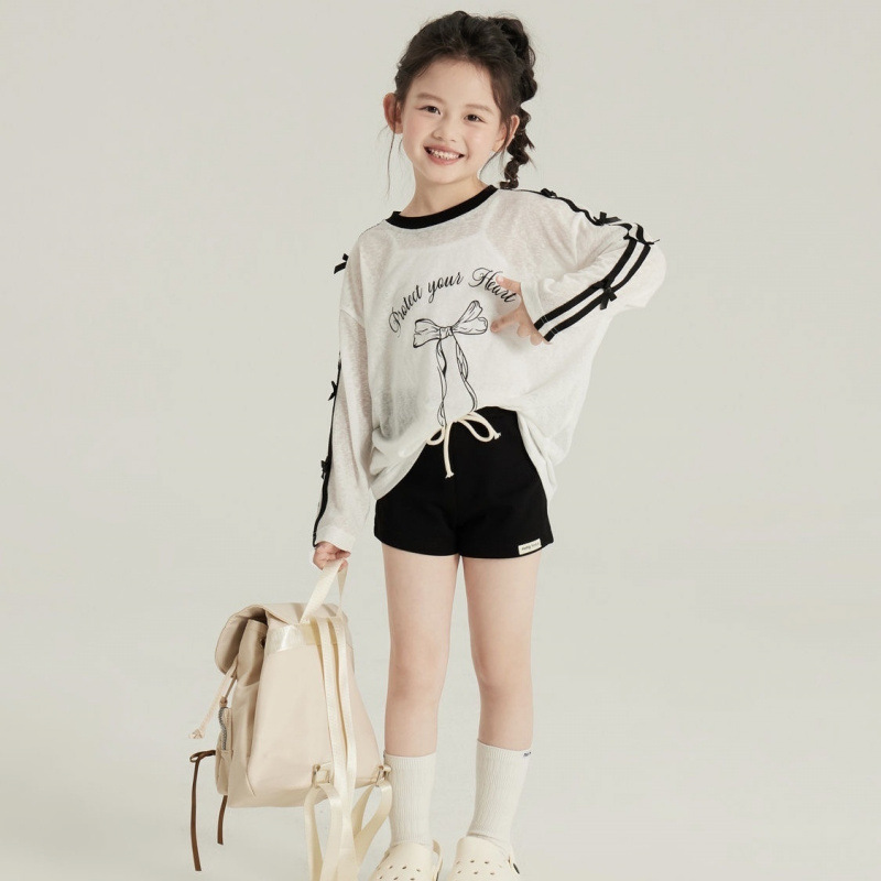 여아 여름 티셔츠, 어린 소녀 한국식 리본 긴팔 상의, 아동용 경량 에어컨 셔츠, 중대형 아동용 자외선 차단 티셔츠