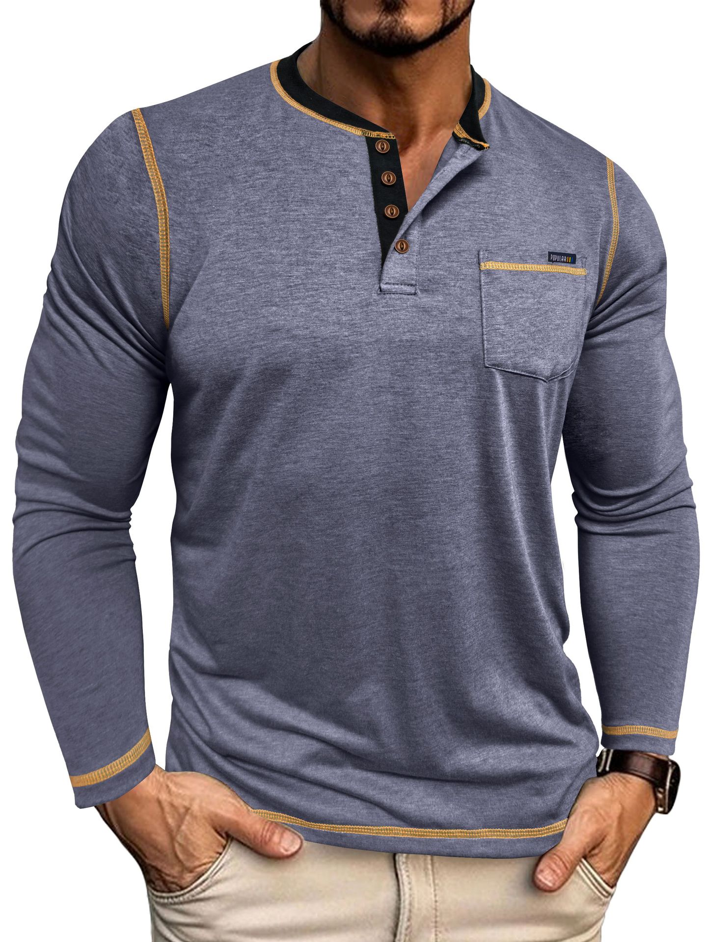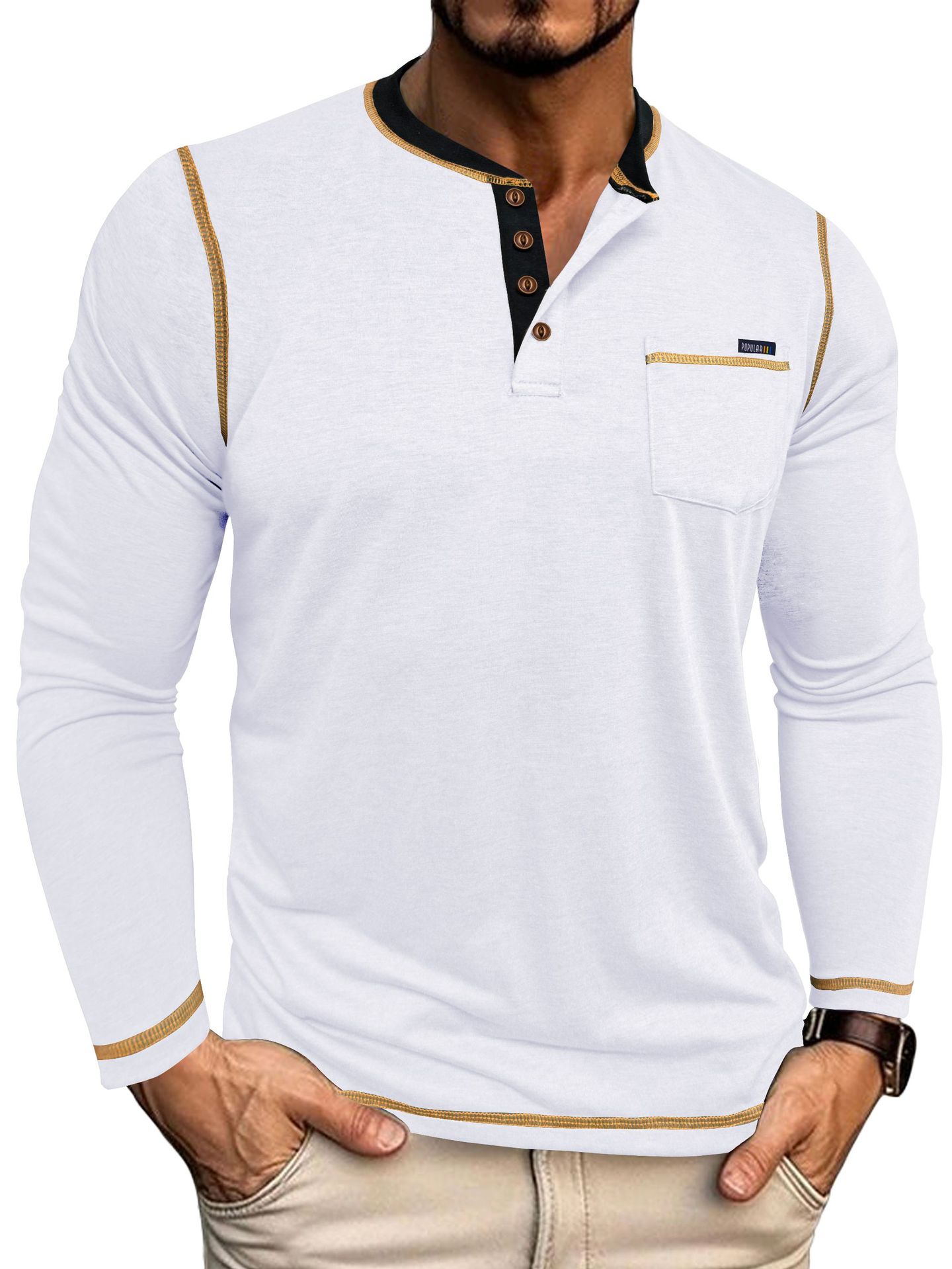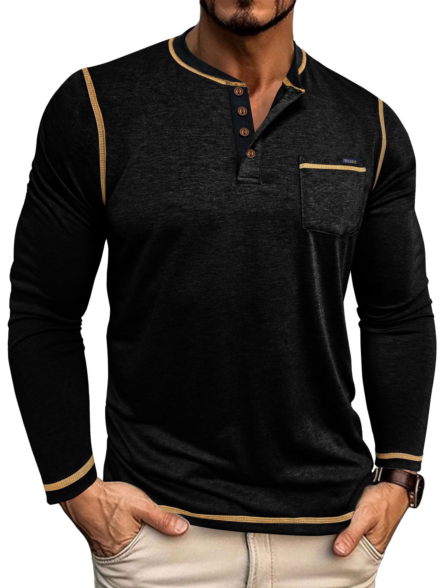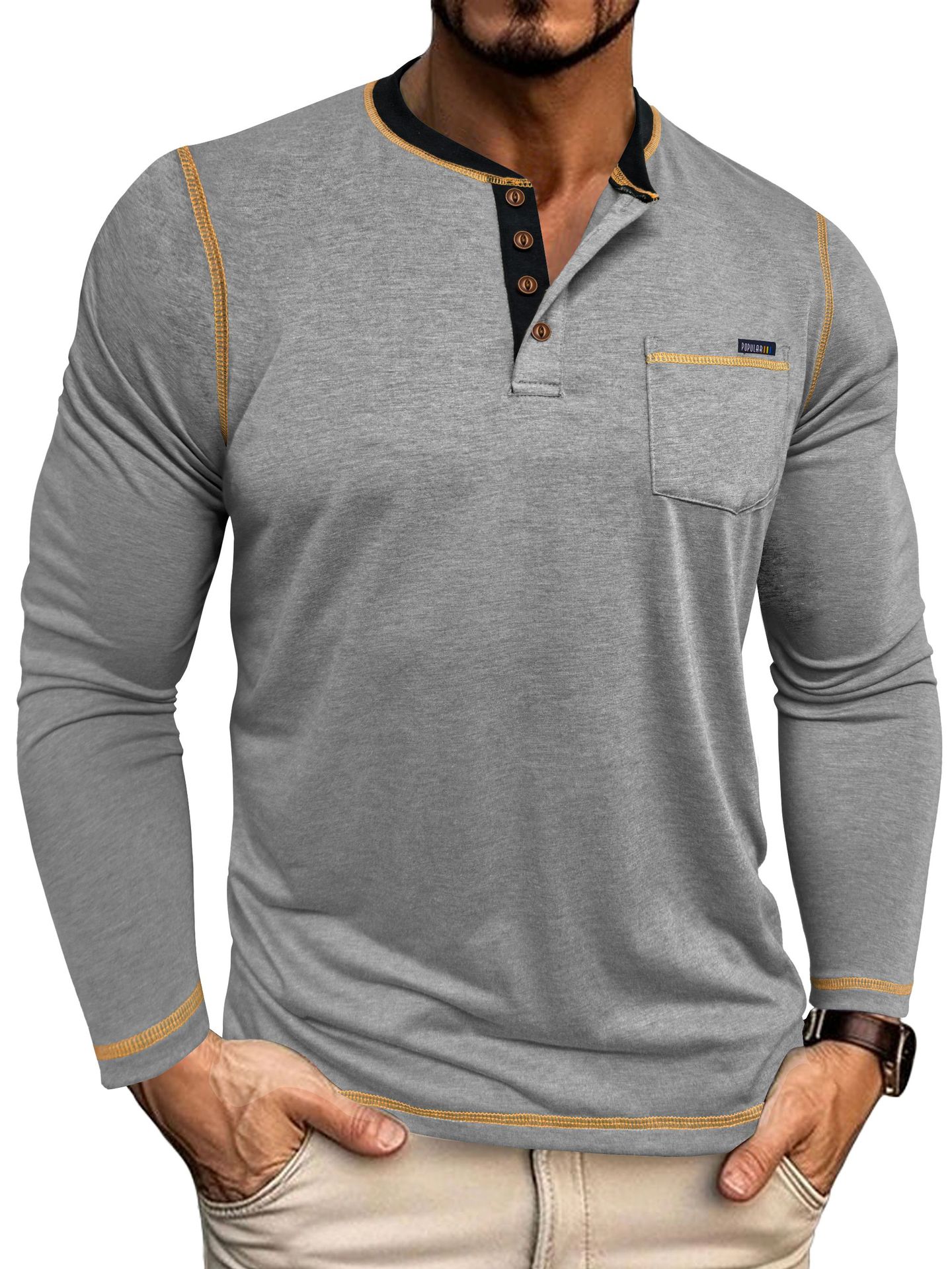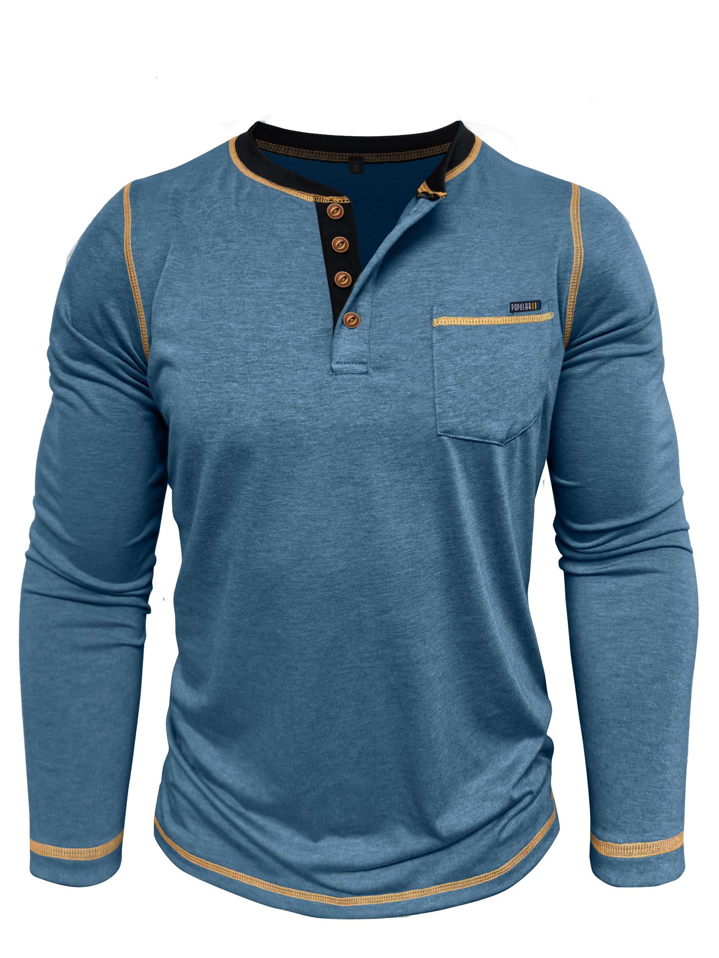 2025 크로스보더 남성 가을 겨울 대형 대외 무역 남성 긴팔 티셔츠 유럽과 미국 남성 헨리 셔츠 4버튼 탑스토어 가기