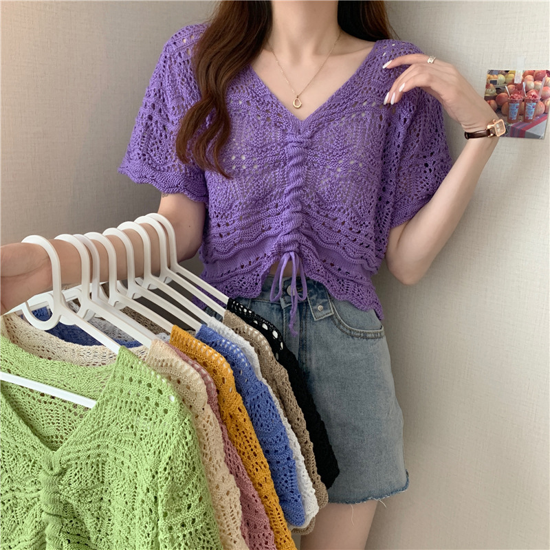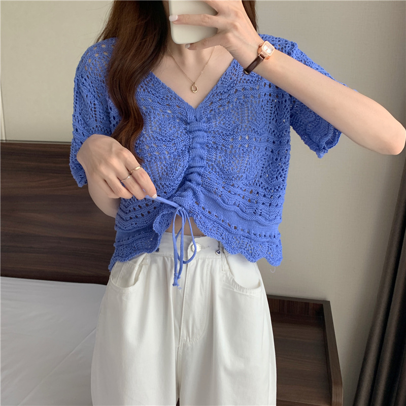 한국 디자인 틈새 드로스트링 짧은 중공 탑 하이 웨이스트 반팔 니트 자외선 차단 블라우스 v 넥 여성 티셔츠스토어 가기