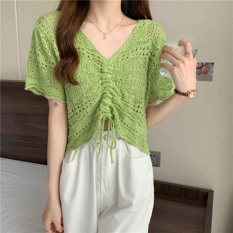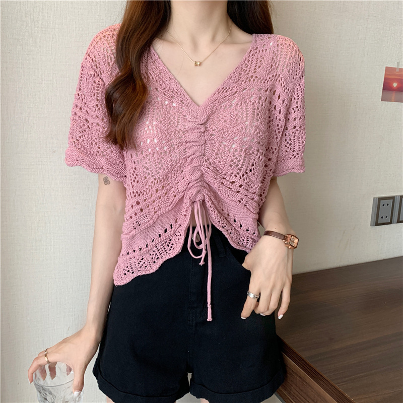 한국 디자인 틈새 드로스트링 짧은 중공 탑 하이 웨이스트 반팔 니트 자외선 차단 블라우스 v 넥 여성 티셔츠