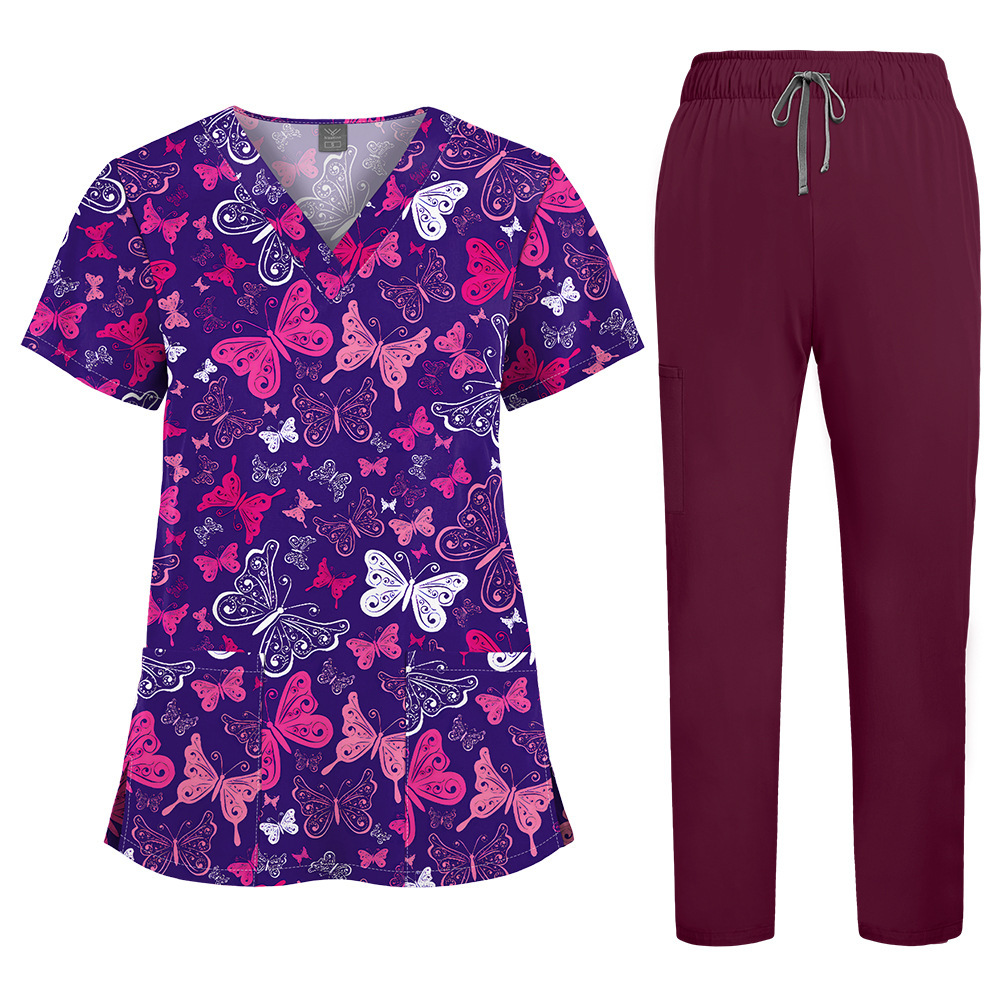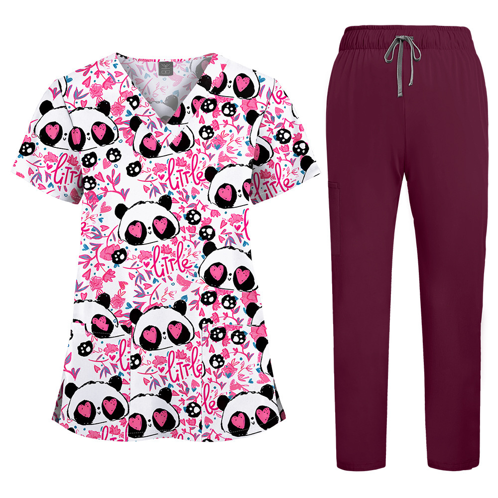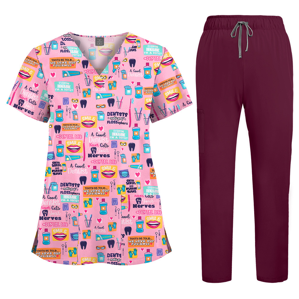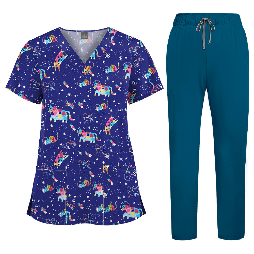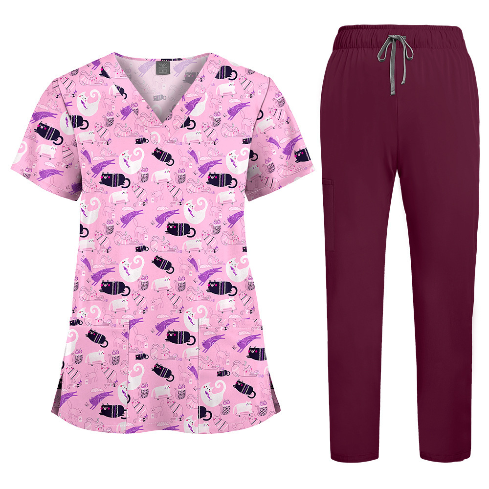 뜨거운 판매 새로운 인쇄 손 씻기 의류 단색 바지 정장 간호사 의류 의사 병원 클리닉 작업복 투피스 세트스토어 가기