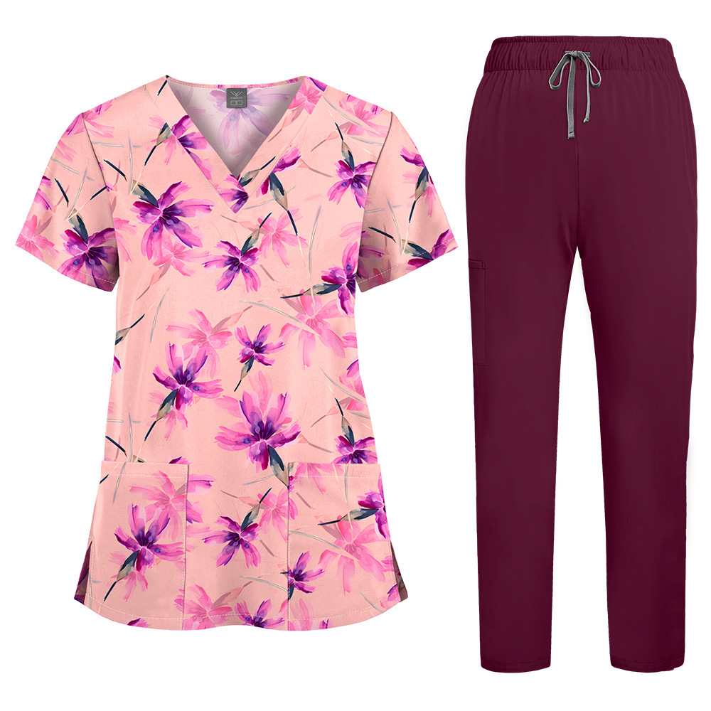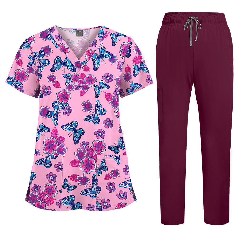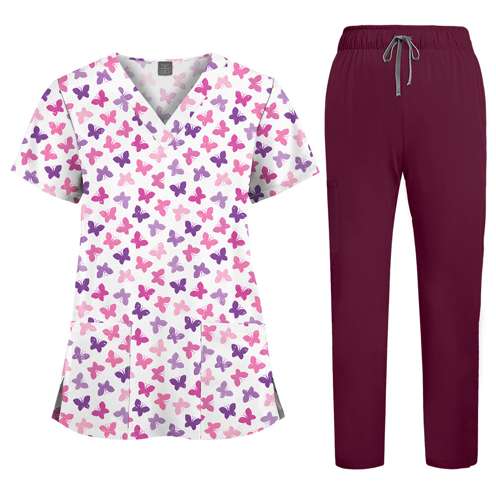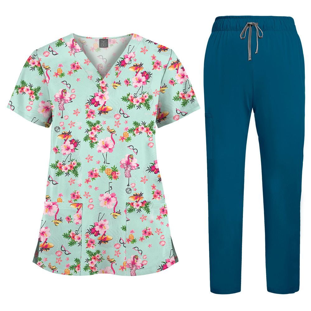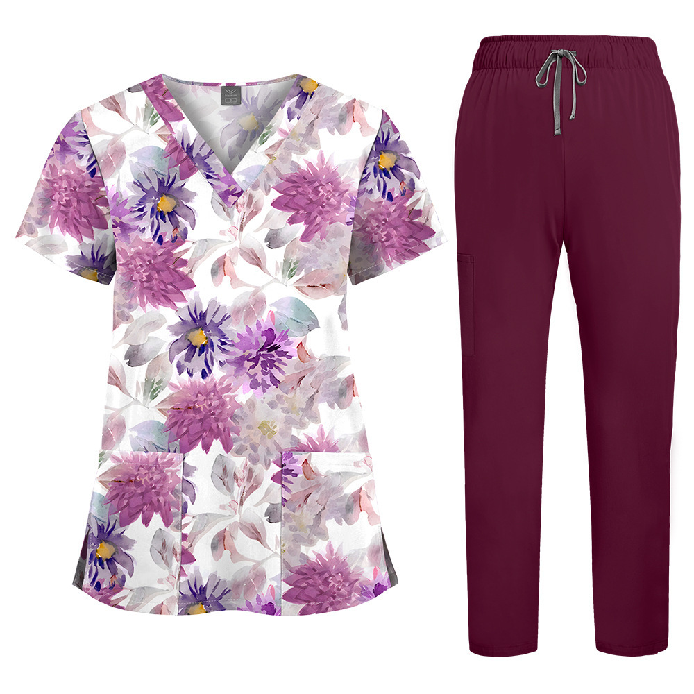 뜨거운 판매 새로운 인쇄 손 씻기 의류 단색 바지 정장 간호사 의류 의사 병원 클리닉 작업복 투피스 세트스토어 가기
