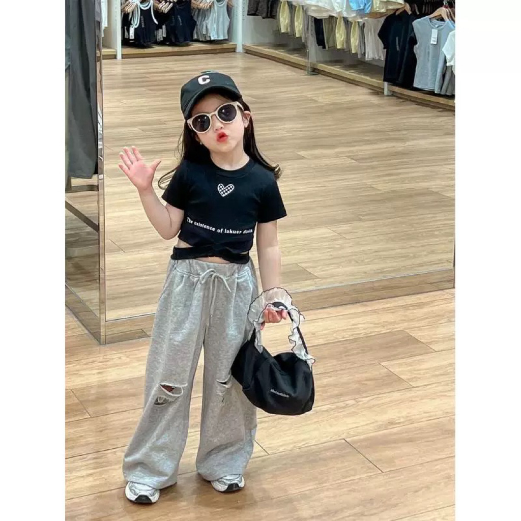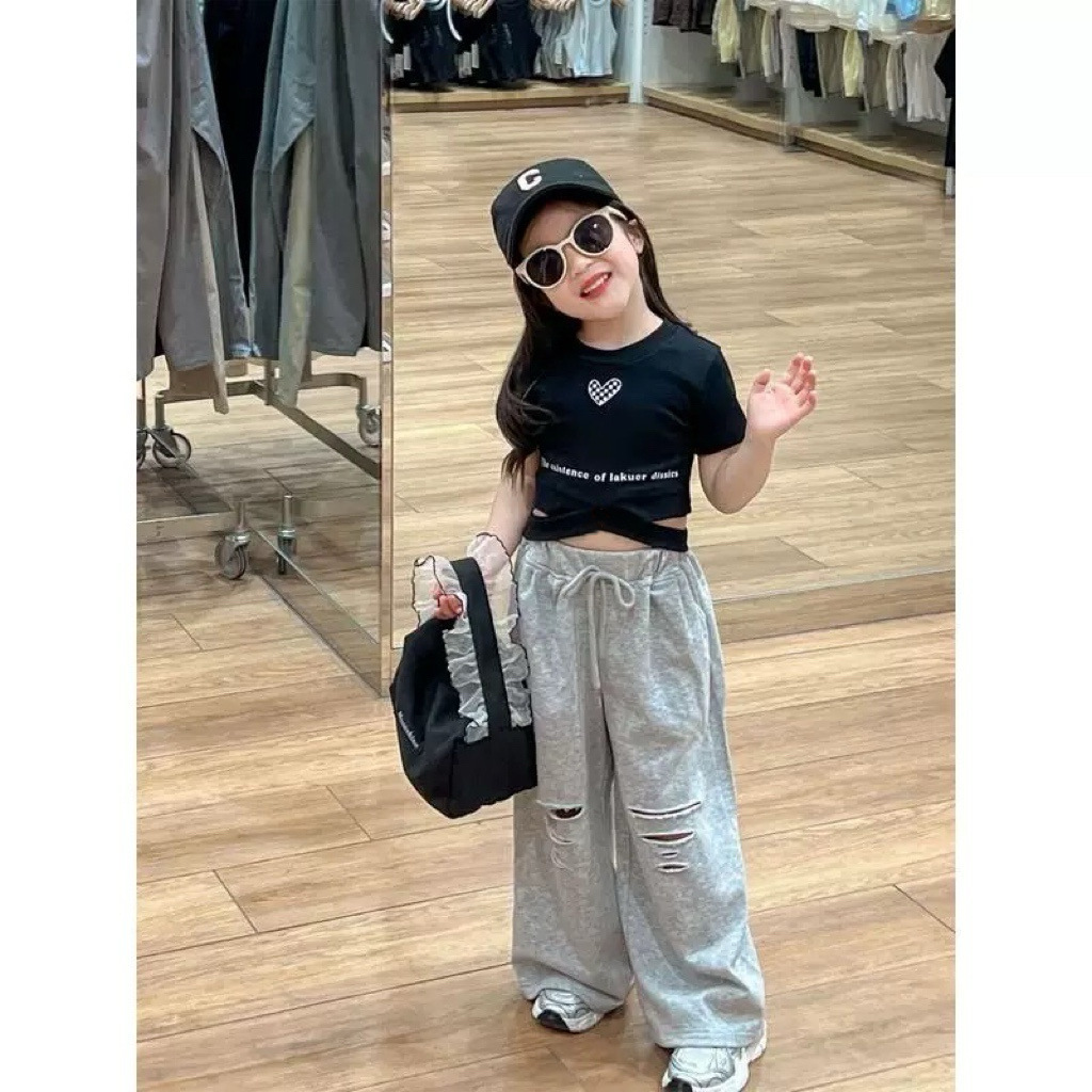 트렌디하고 쿨한 여아 정장 2025 여름 여아 허리 프린트 러브 노출 배꼽 반팔 티셔츠 레트로 찢어진 스트레이트 팬츠스토어 가기