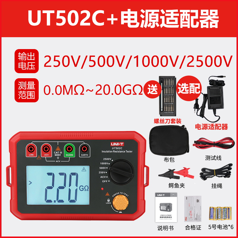 • UT502C 경제형 버전(2500V+20GΩ) + 전원 어댑터 + 무료 드라이버 세트