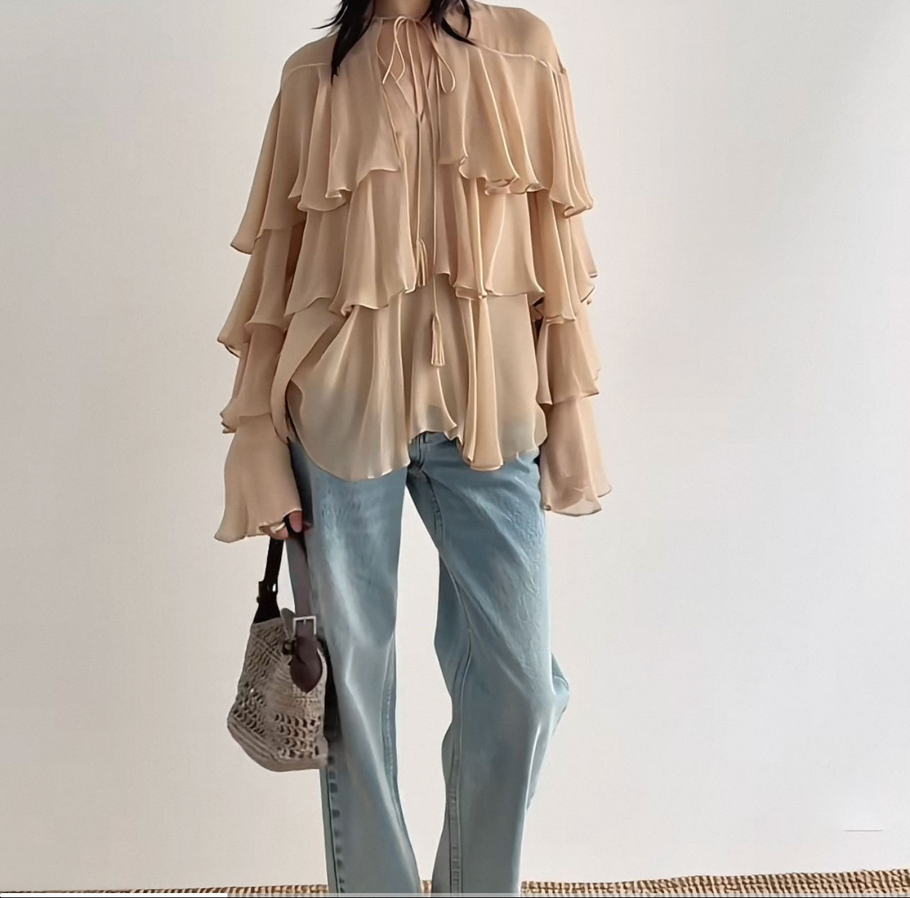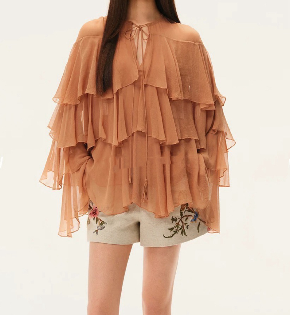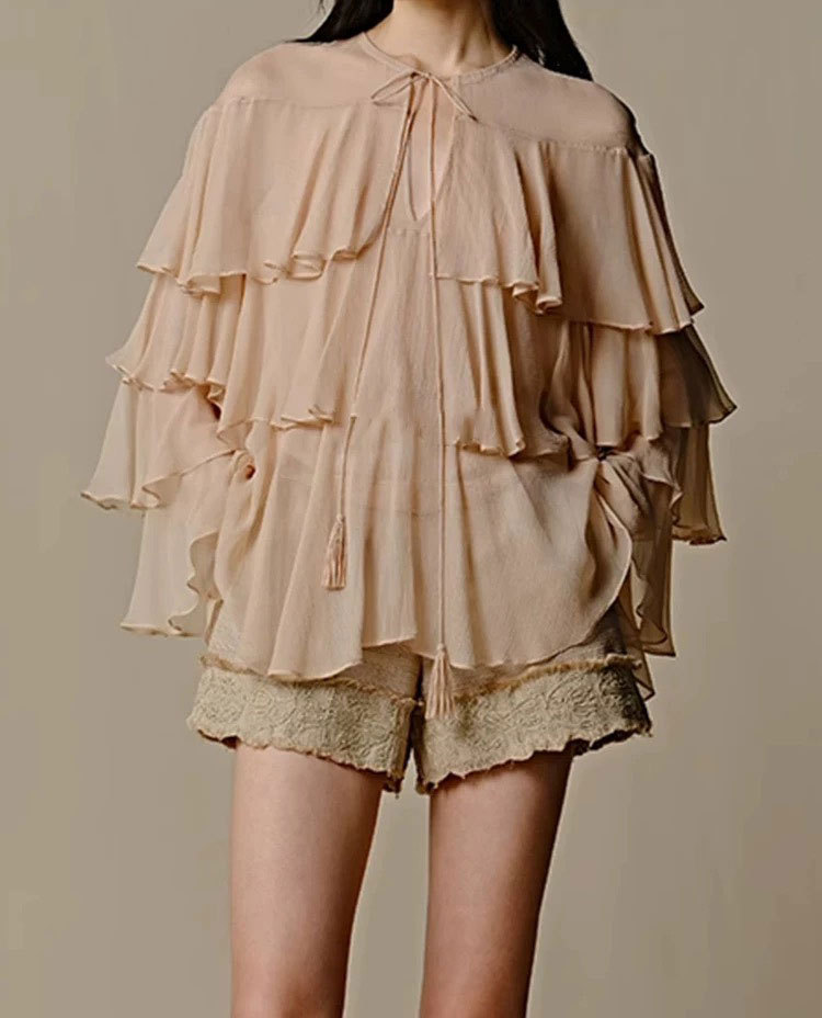 2025 봄/가을 신상 무지 러플 레이스업 배색 셔츠+스커트 세트