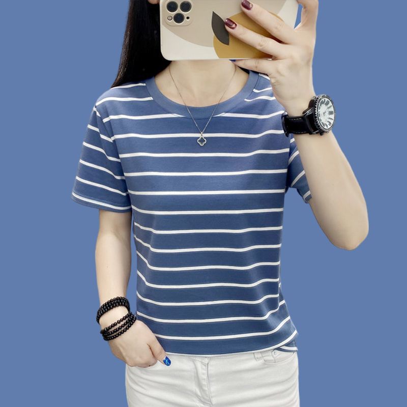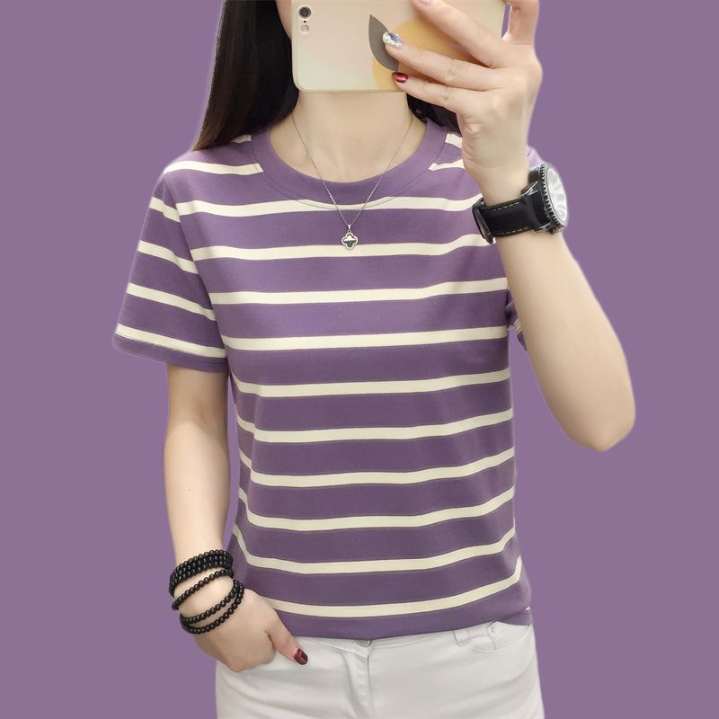 여성을위한 순수 코튼 반팔 뚱뚱한 소녀 느슨한 대형 스트라이프 티셔츠 한국 스타일 캐주얼 서양식 아름다운 탑 2024 여름 새 스타일스토어 가기