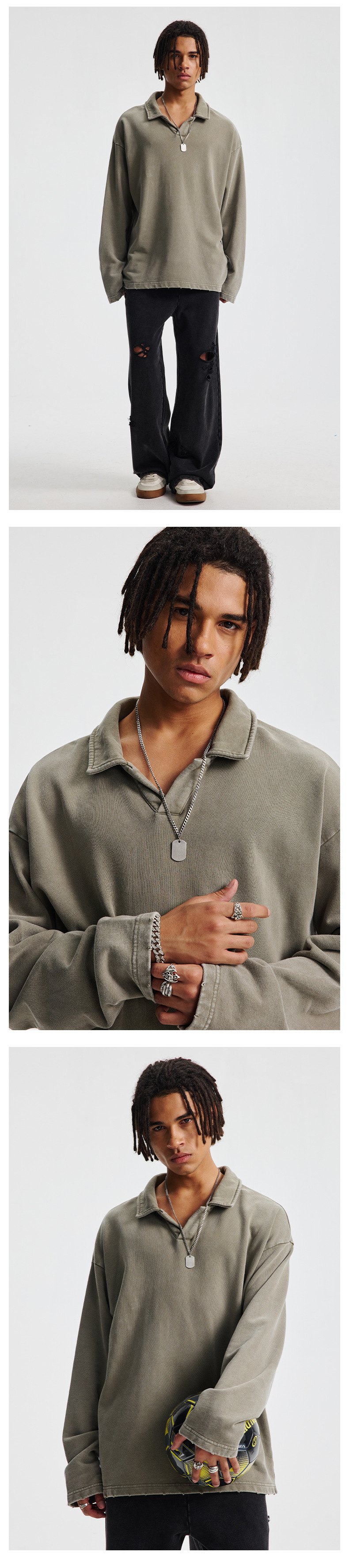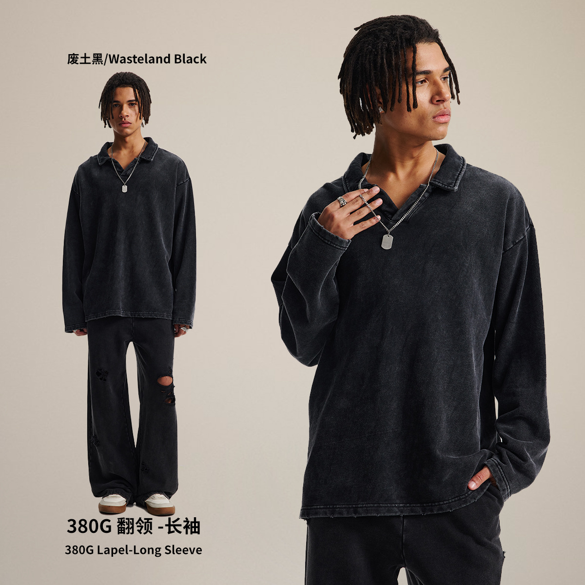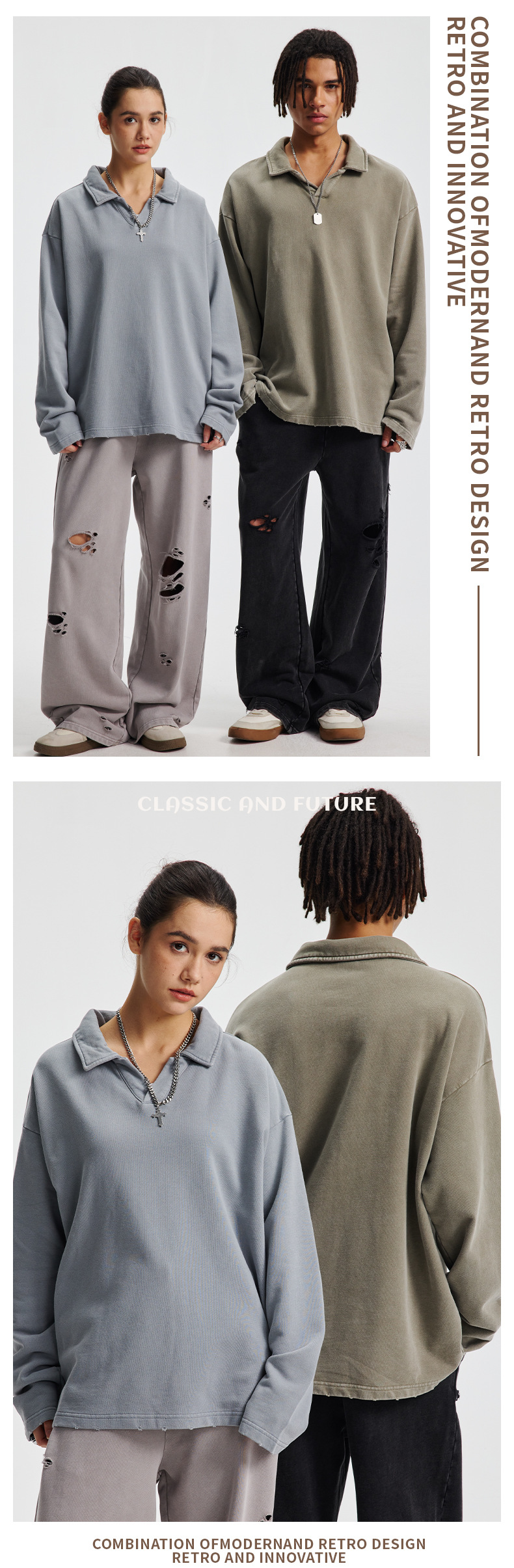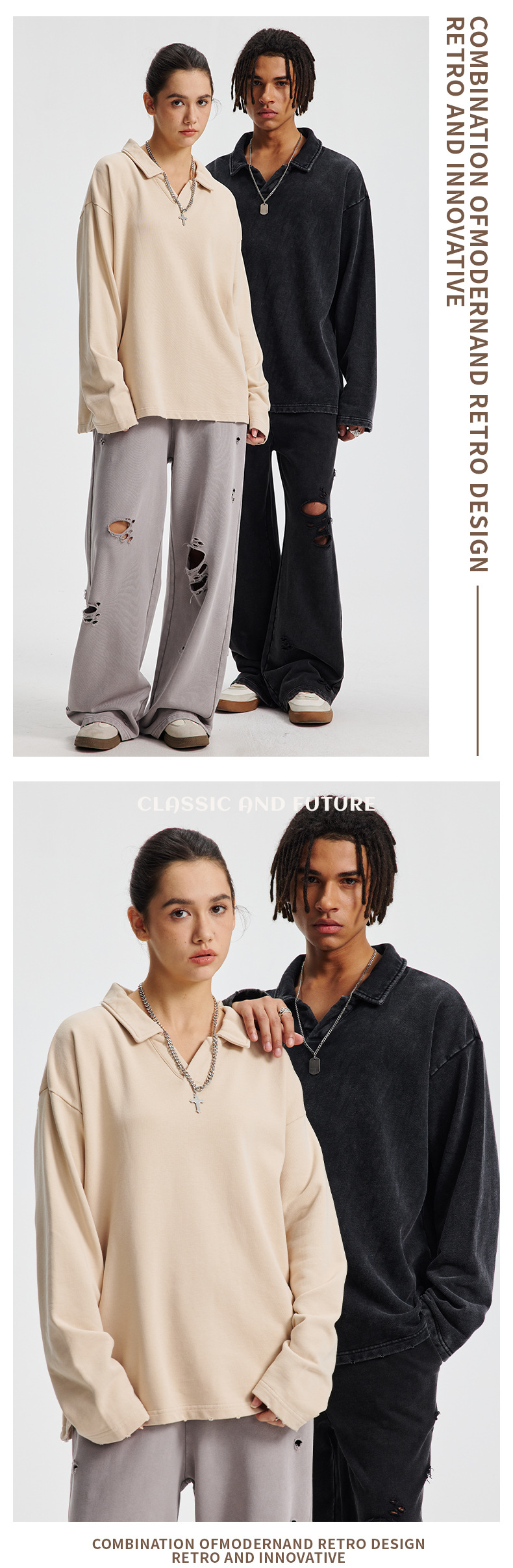 체인 트렌드 남성복 | 가을 겨울 신제품 라펠 400G 테리 긴팔 에지 디스트레스드 루즈 남녀공용 긴팔 티셔츠스토어 가기