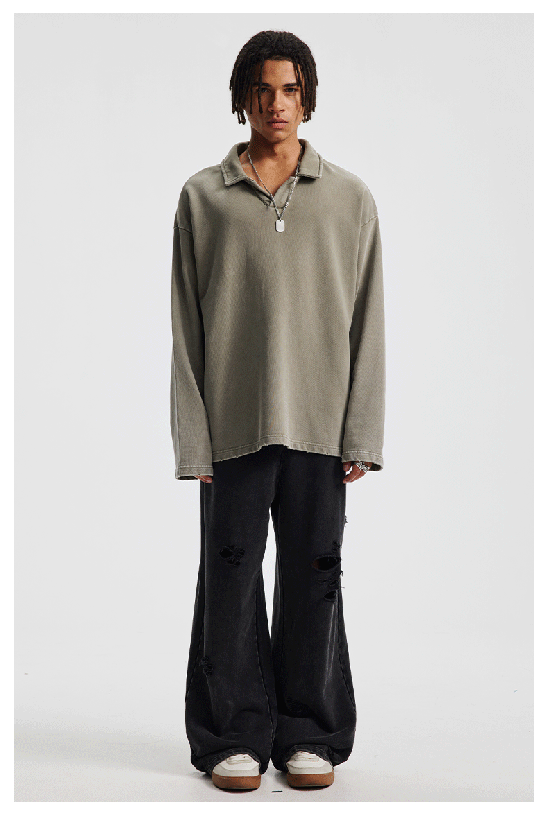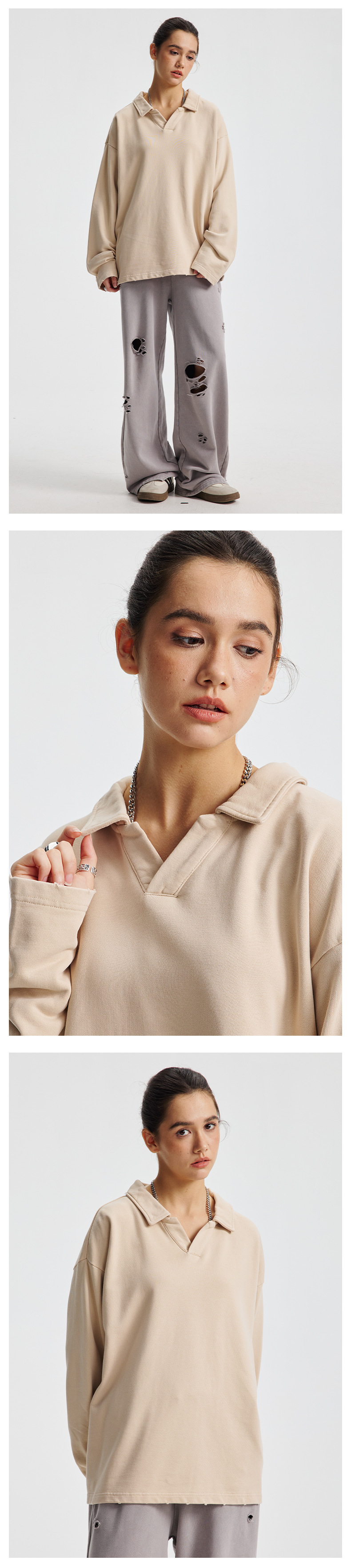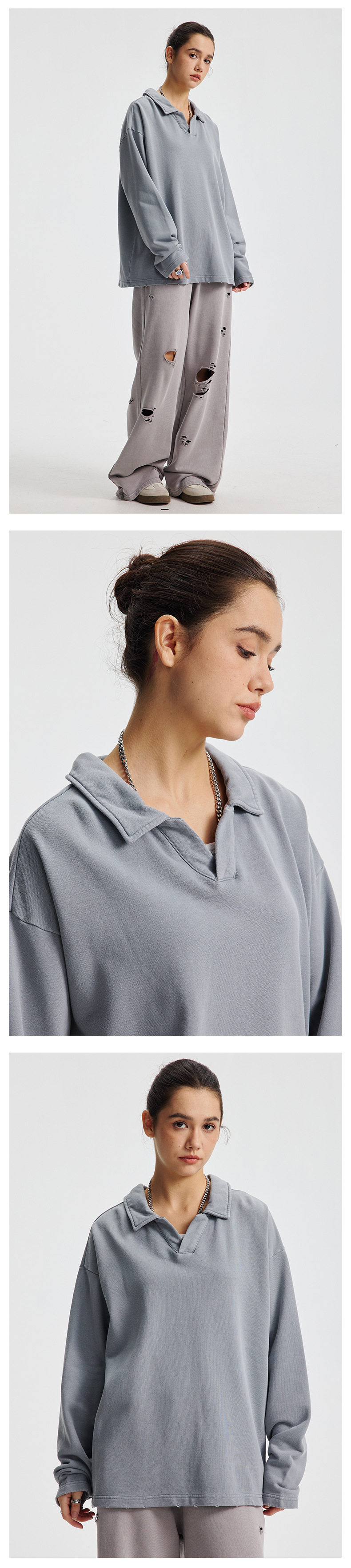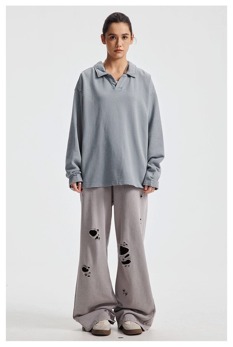 체인 트렌드 남성복 | 가을 겨울 신제품 라펠 400G 테리 긴팔 에지 디스트레스드 루즈 남녀공용 긴팔 티셔츠스토어 가기