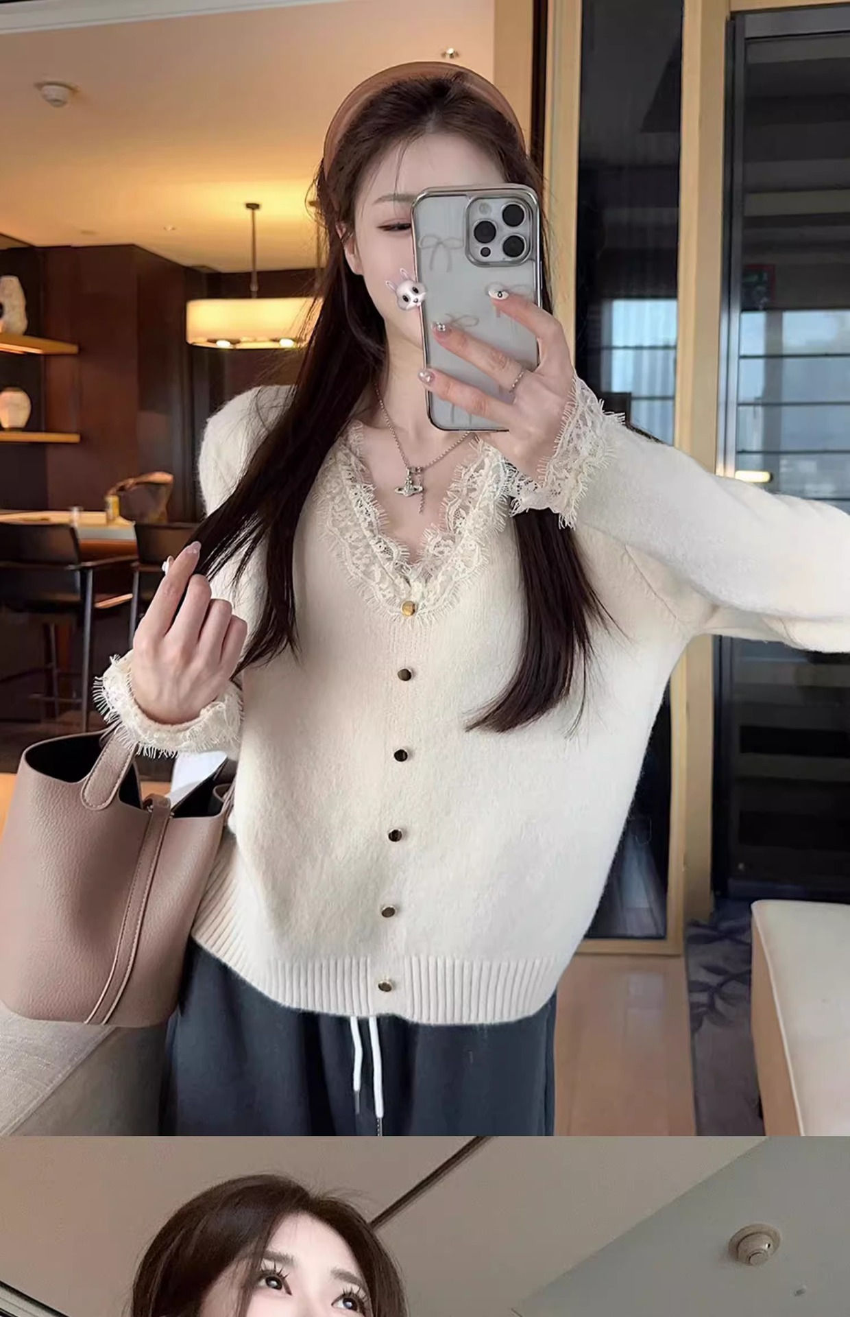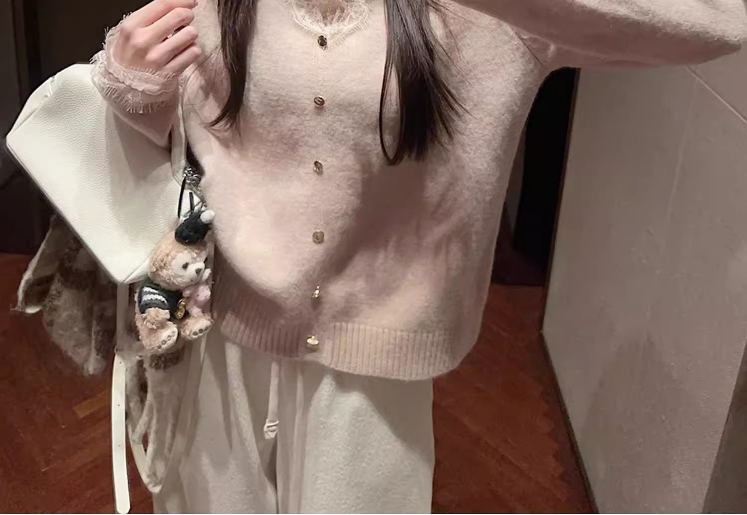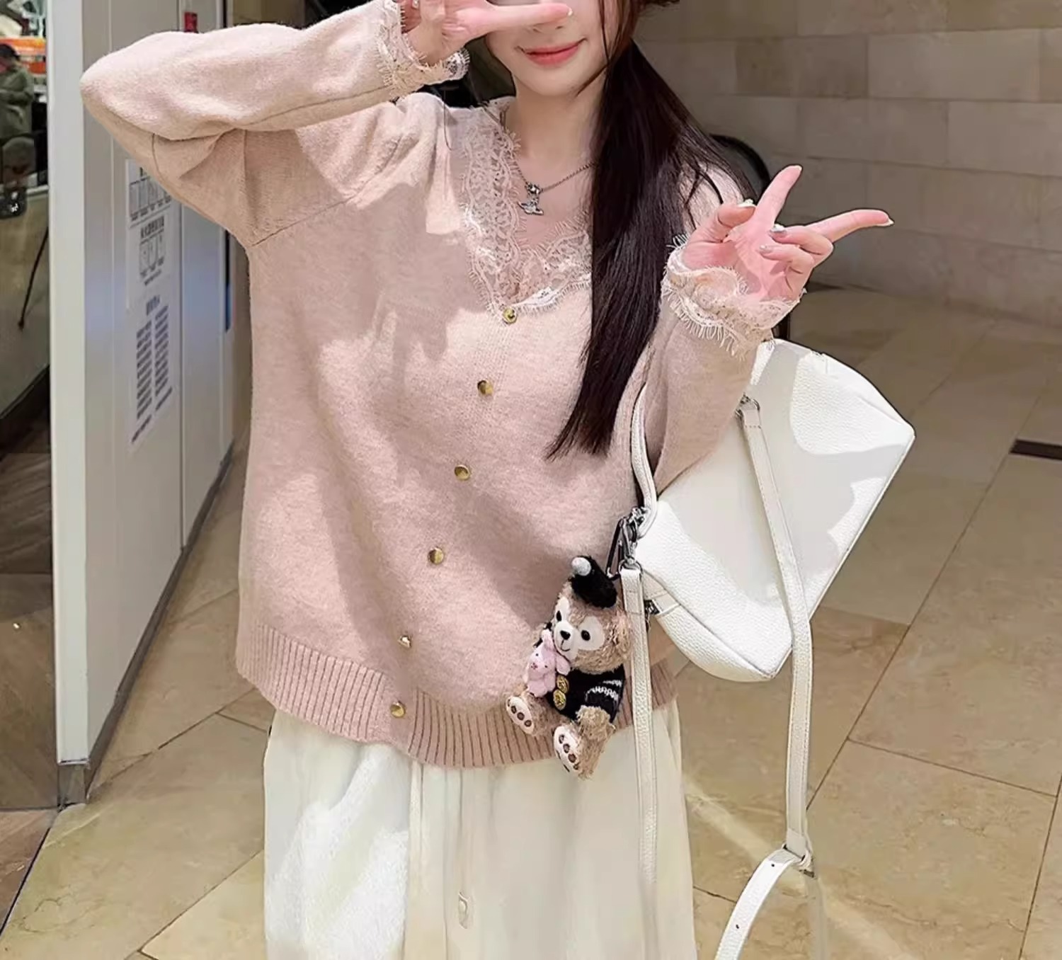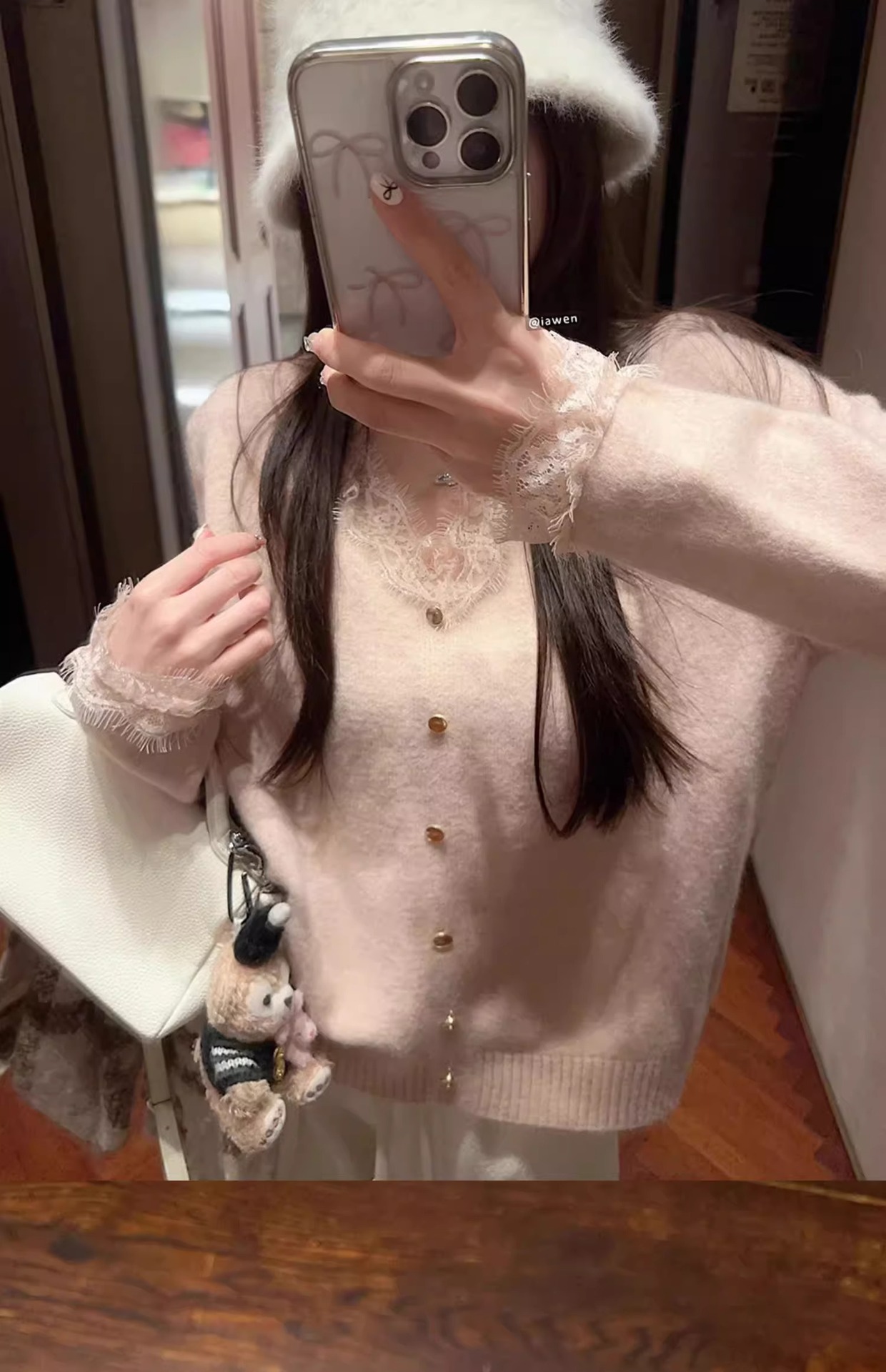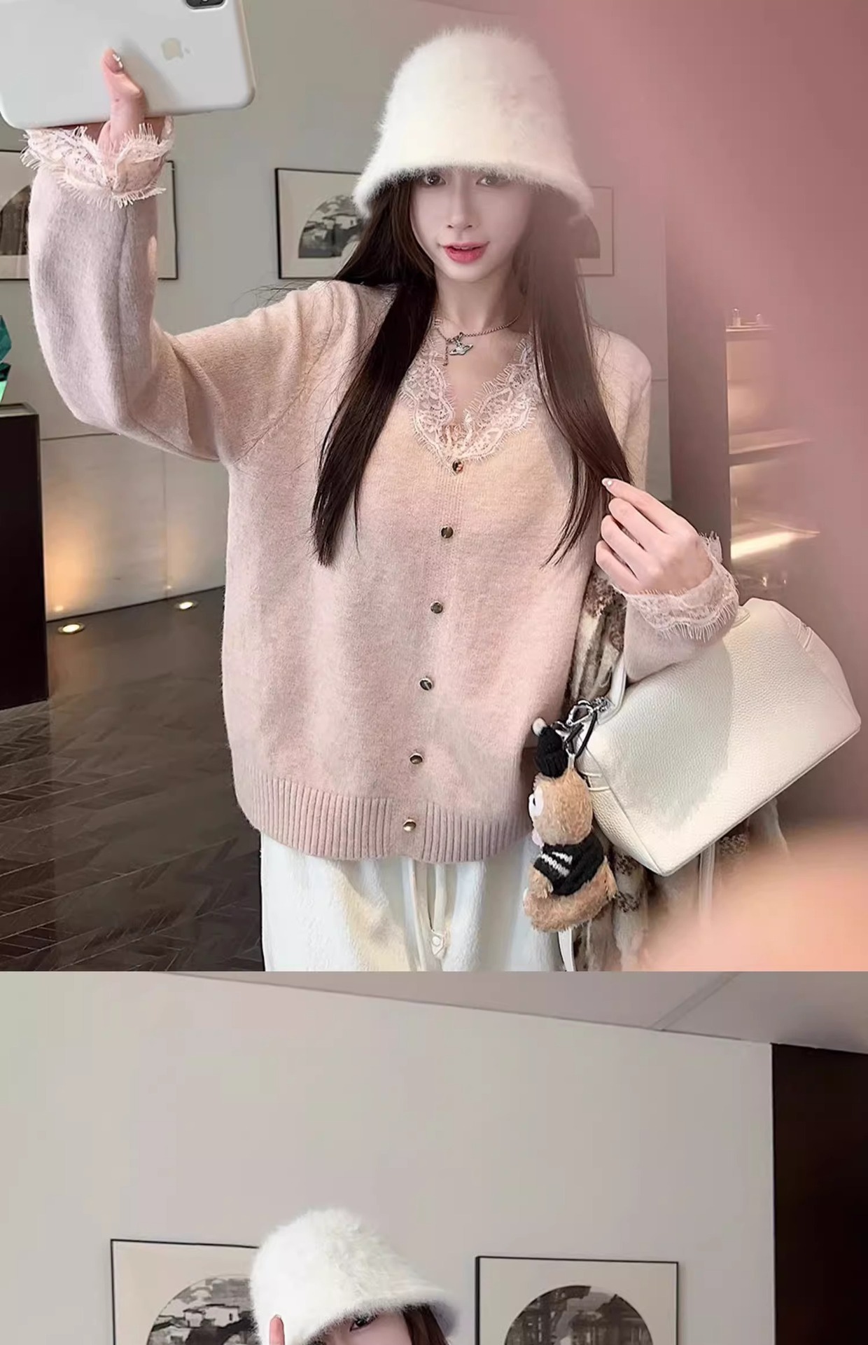 여성용 핑크 스몰 프래그런스 레이스 스웨터, 가을 겨울 루즈한 브이넥 두꺼운 이너웨어 퓨어 러브 탑스토어 가기
