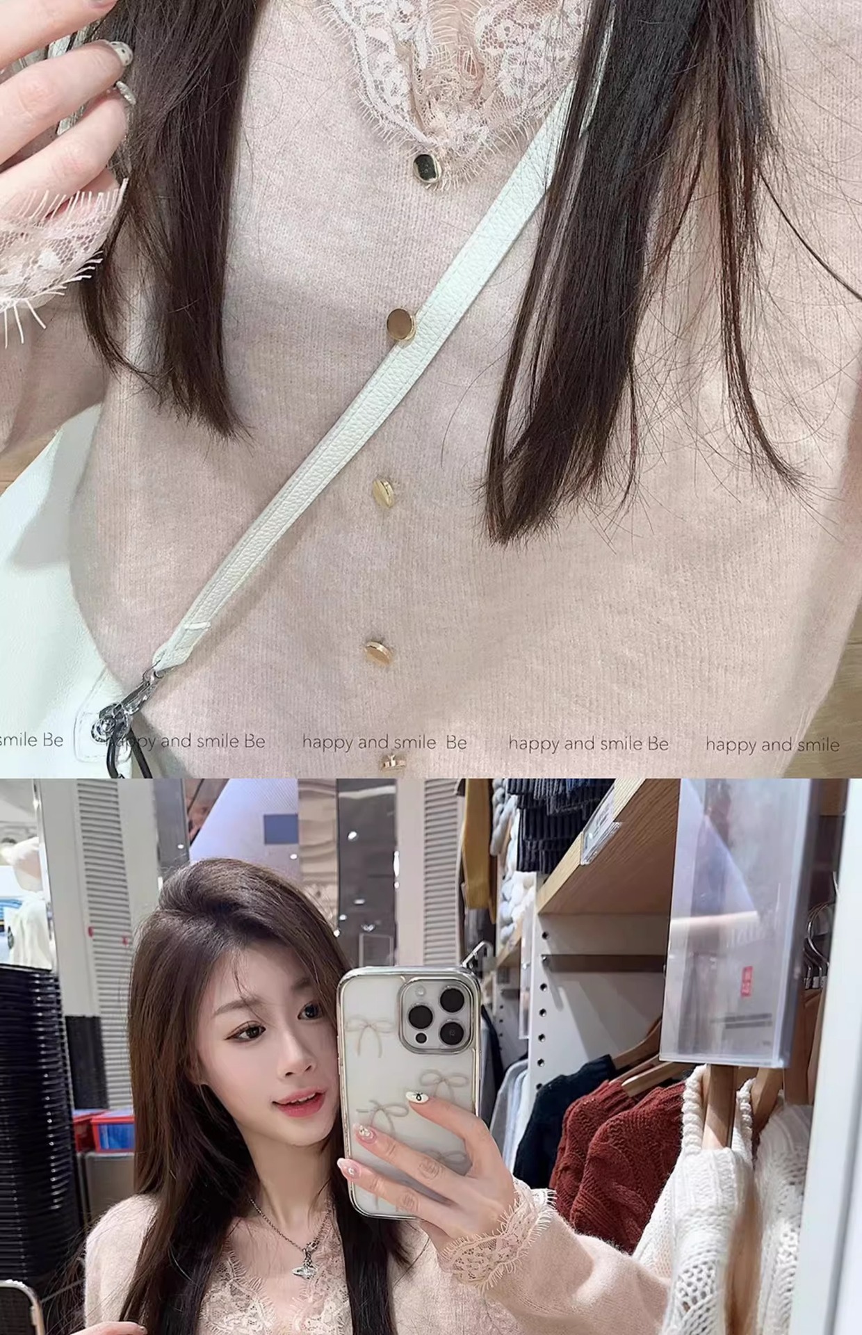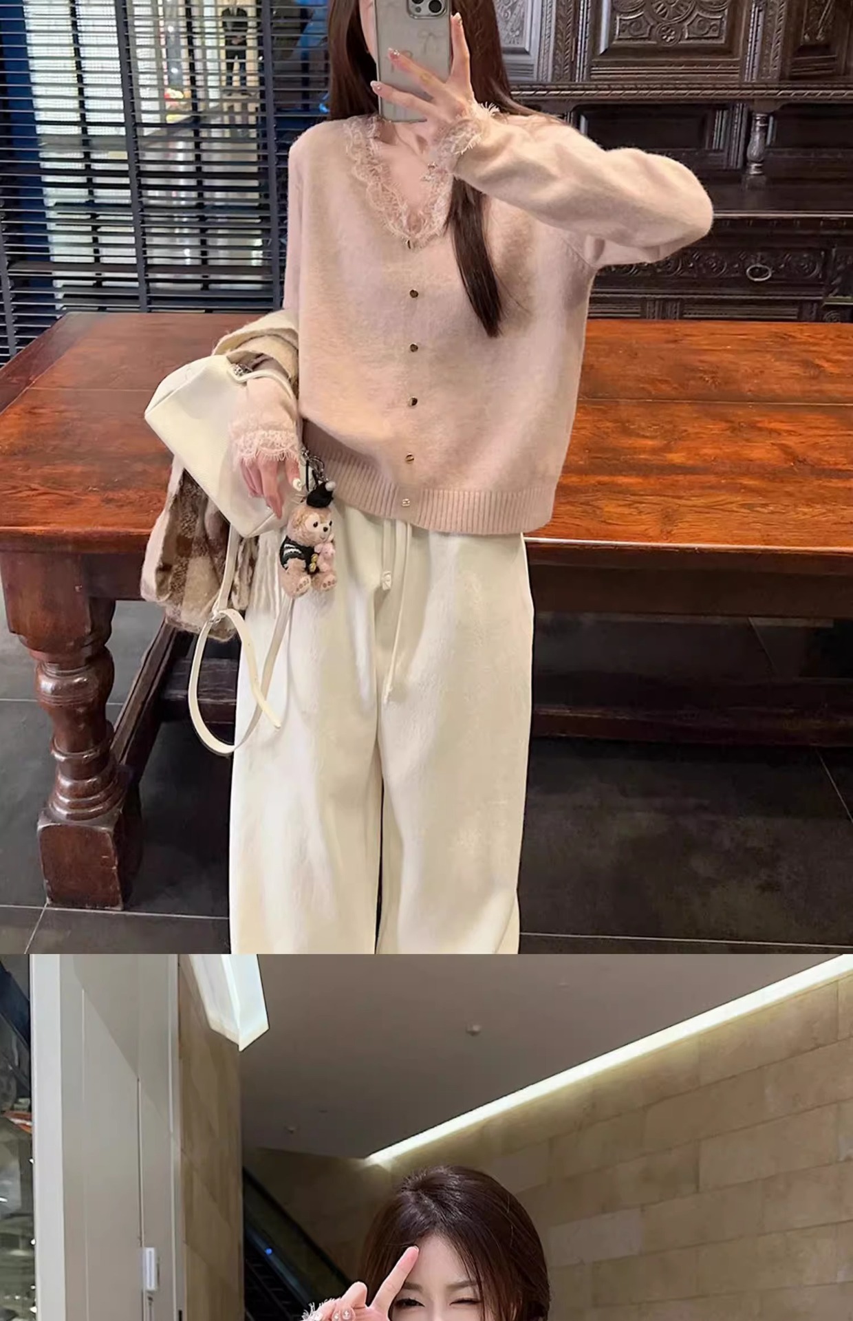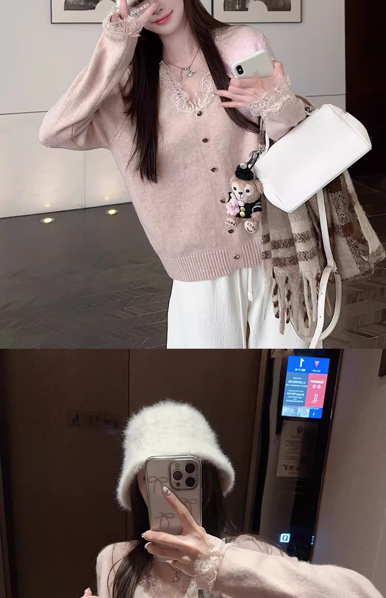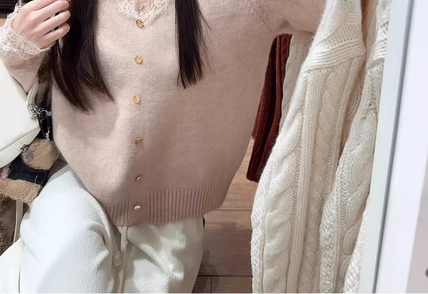 여성용 핑크 스몰 프래그런스 레이스 스웨터, 가을 겨울 루즈한 브이넥 두꺼운 이너웨어 퓨어 러브 탑스토어 가기