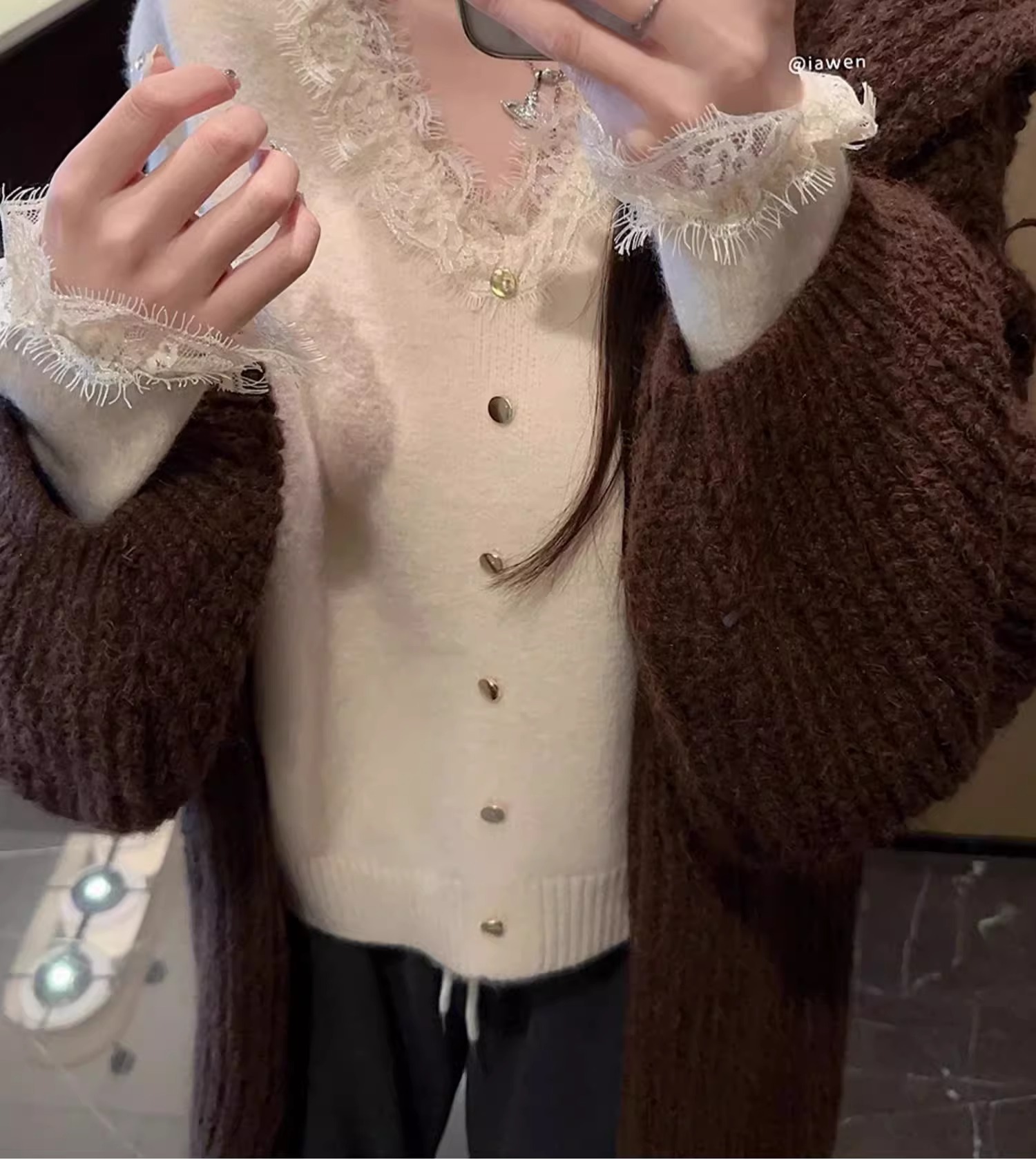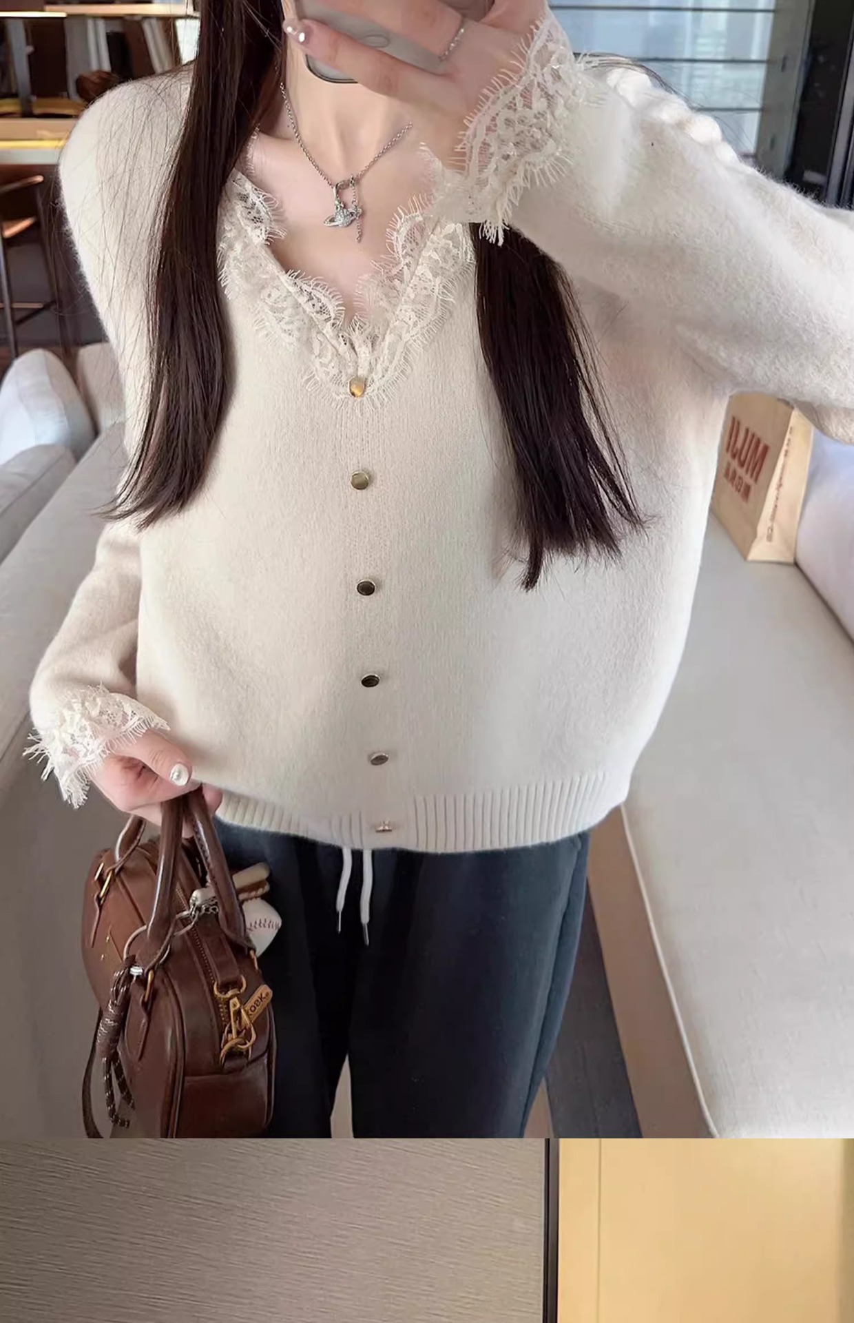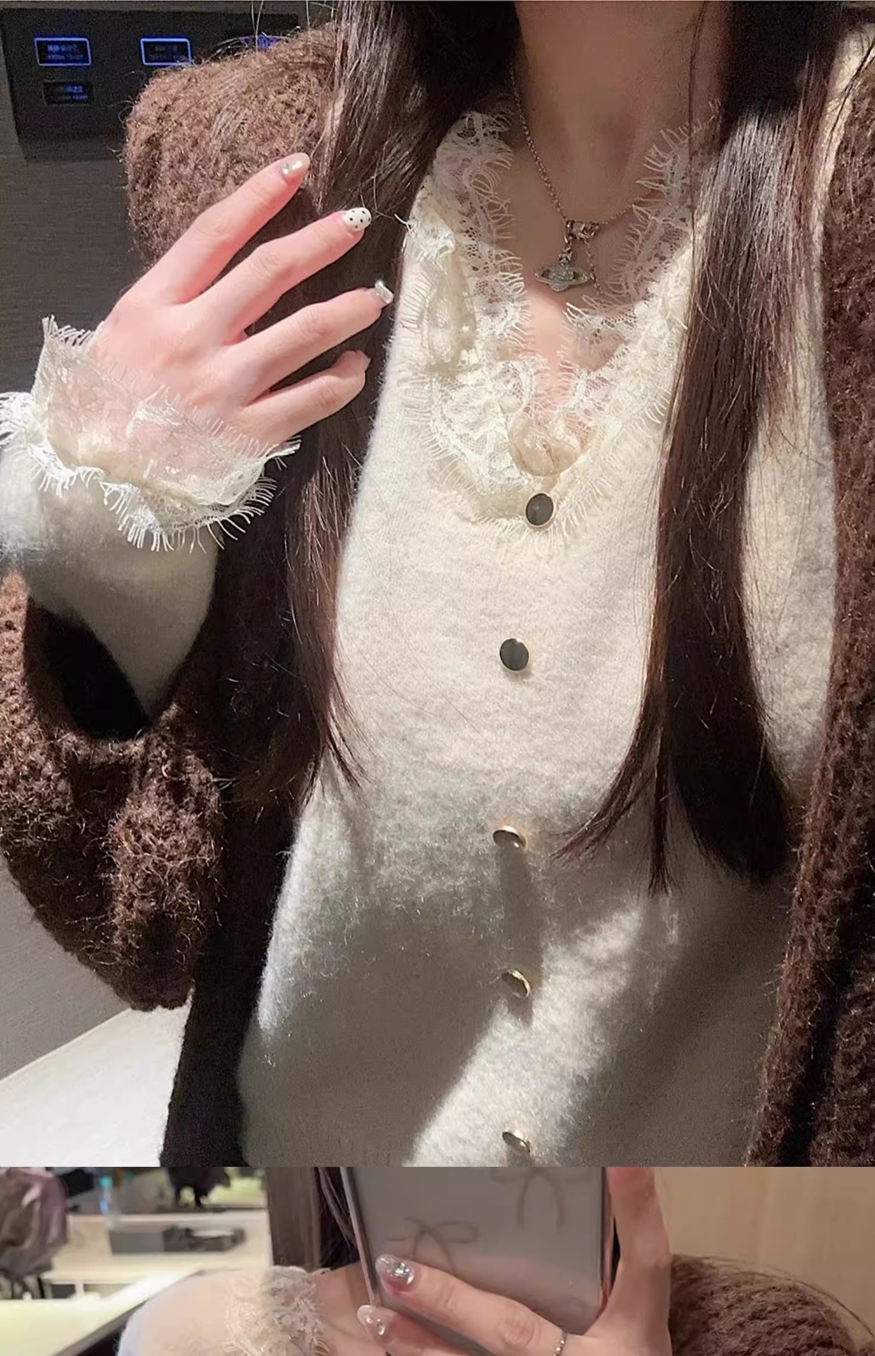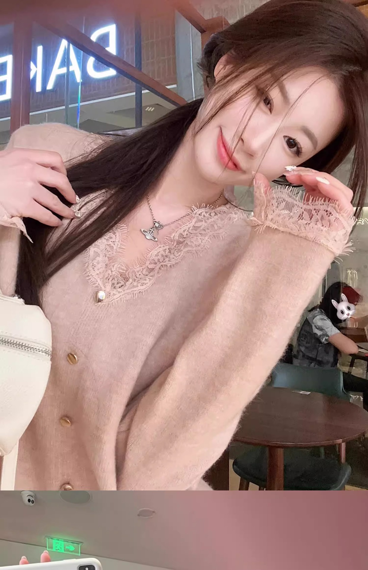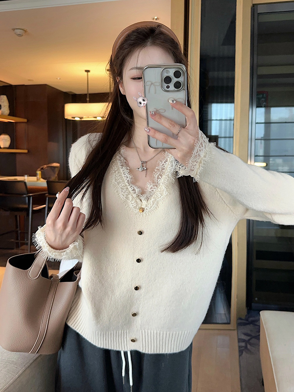 여성용 핑크 스몰 프래그런스 레이스 스웨터, 가을 겨울 루즈한 브이넥 두꺼운 이너웨어 퓨어 러브 탑스토어 가기