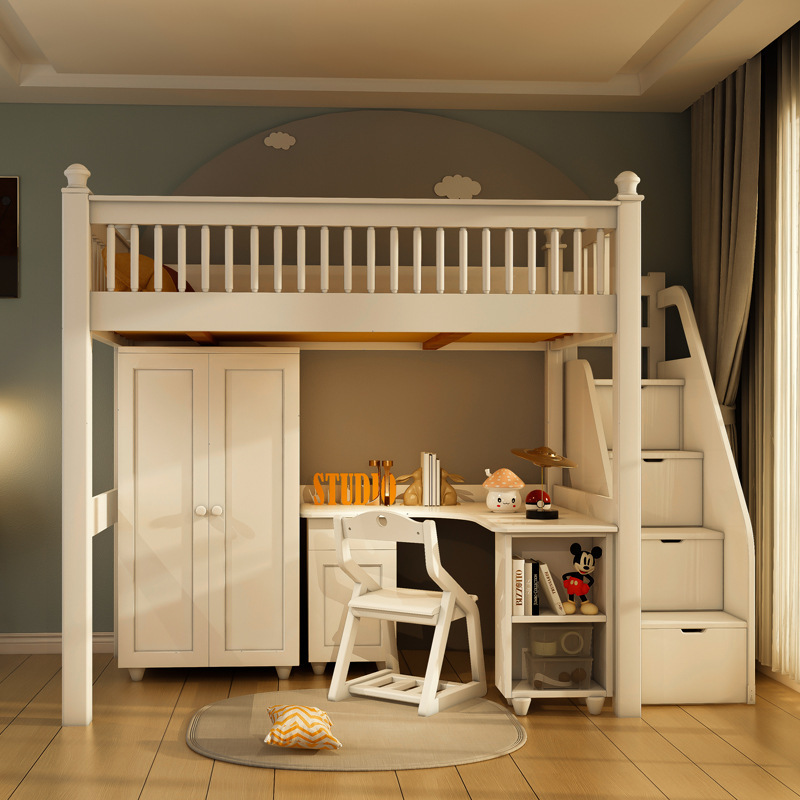 옷장이 있는 원목 이층 침대, 다기능 높은 침대, 상단 및 하단 테이블, 소형 아파트 어린이 침대 책상
