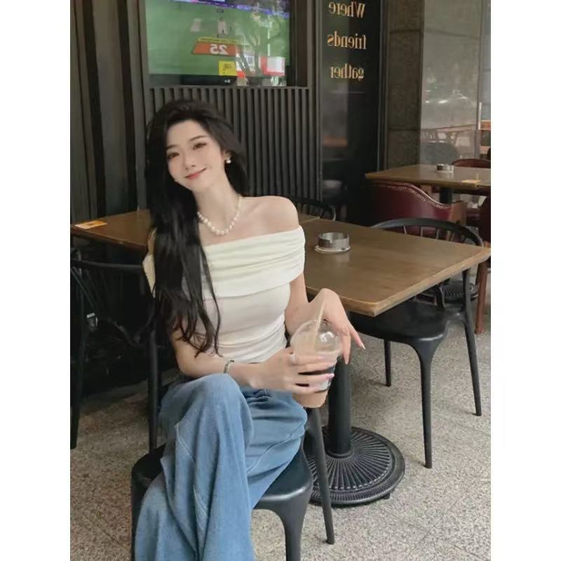 오프 숄더 섹시 핫 걸 퓨어 러스 원 라인 칼라 반팔 티셔츠 여성 여름 슬림 피트 바닥 셔츠 틈새 탑