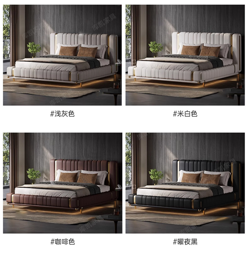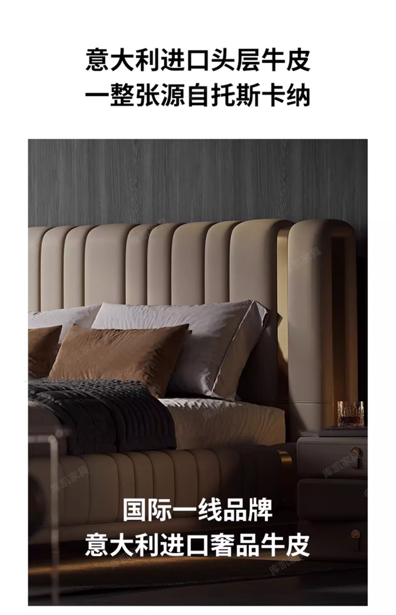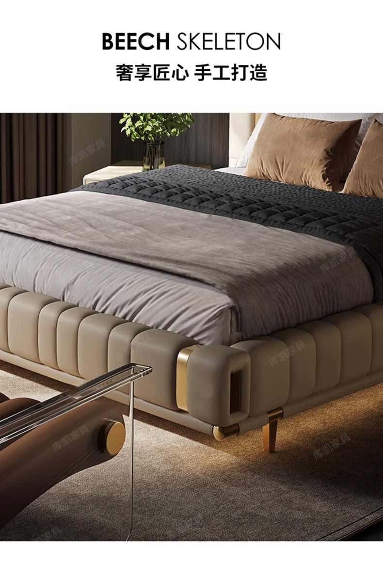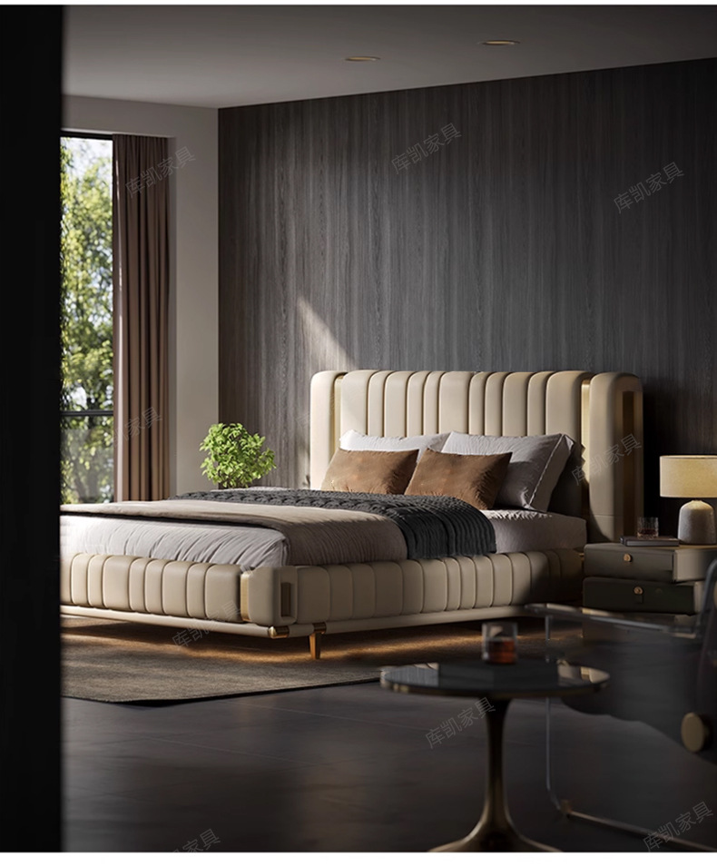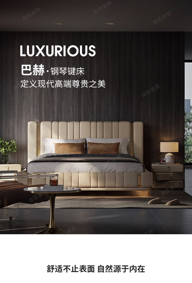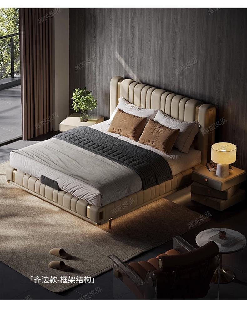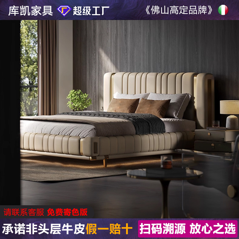 KuKai 가구 라이트 럭셔리 미니멀리스트 피아노 키 가죽 침대 마스터 침실 빌라 럭셔리 더블 소프트 가죽 1 층 소 가죽 침대스토어 가기