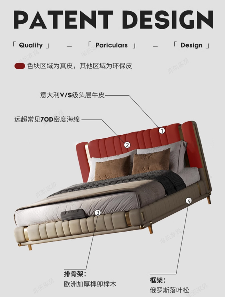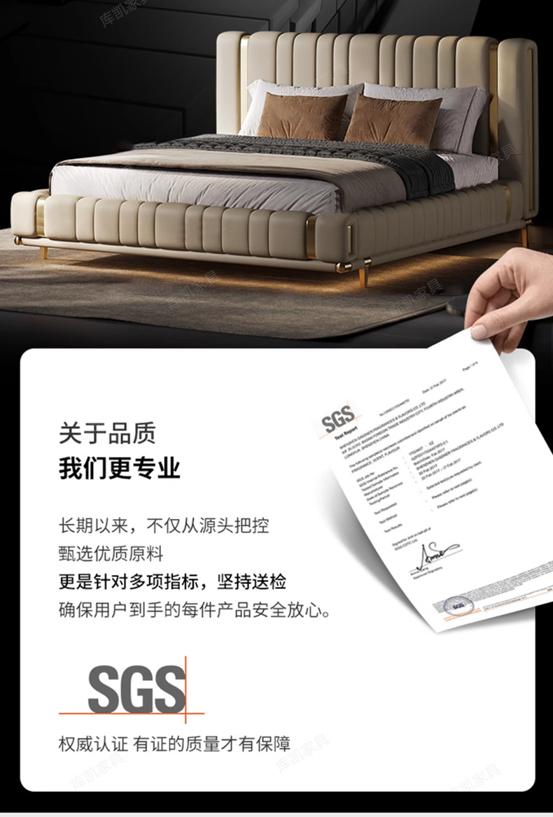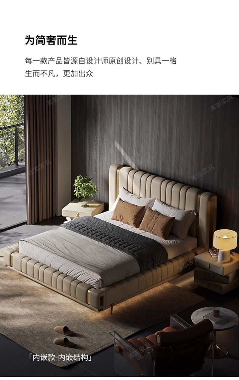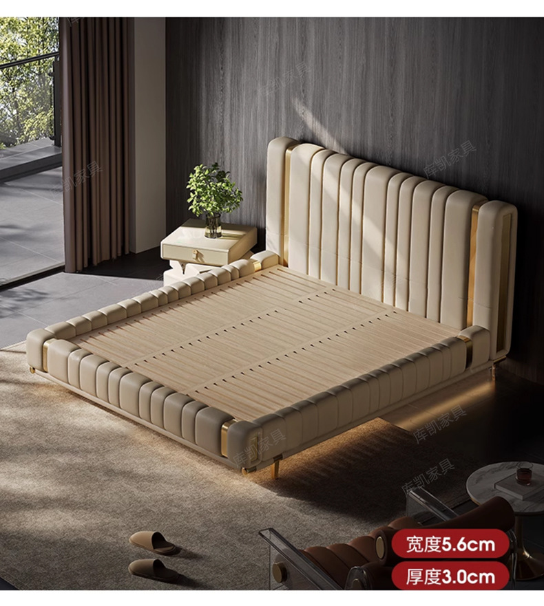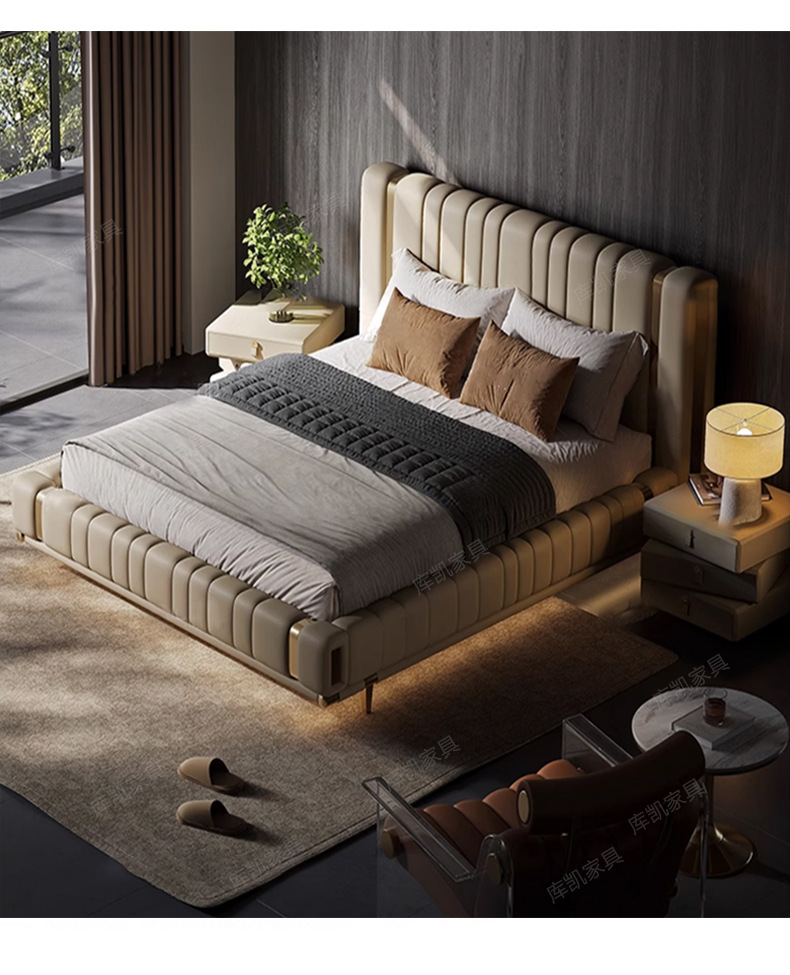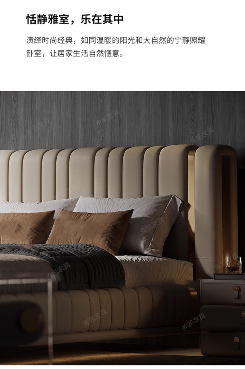 KuKai 가구 라이트 럭셔리 미니멀리스트 피아노 키 가죽 침대 마스터 침실 빌라 럭셔리 더블 소프트 가죽 1 층 소 가죽 침대스토어 가기
