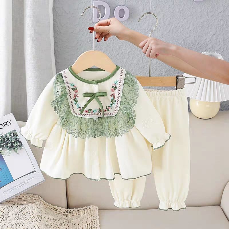 한국 스타일 소녀의 봄, 가을 얇은 가정 의류 아기 순면 투피스 세트 아기 긴팔 잠옷 레이스 공주 정장