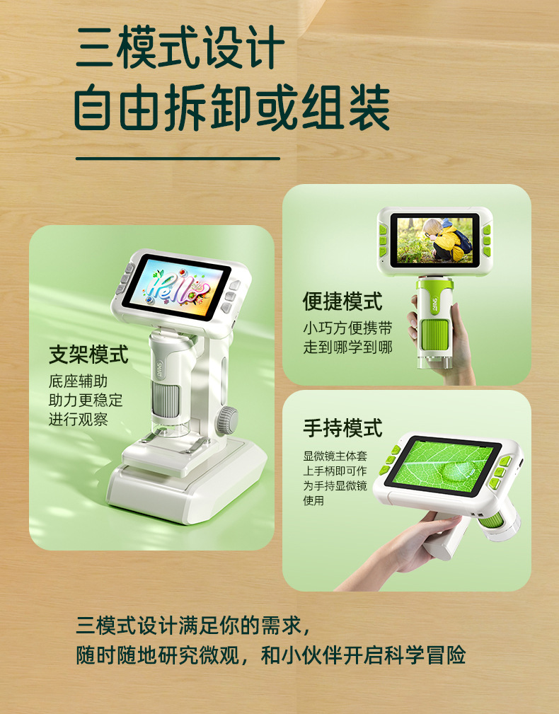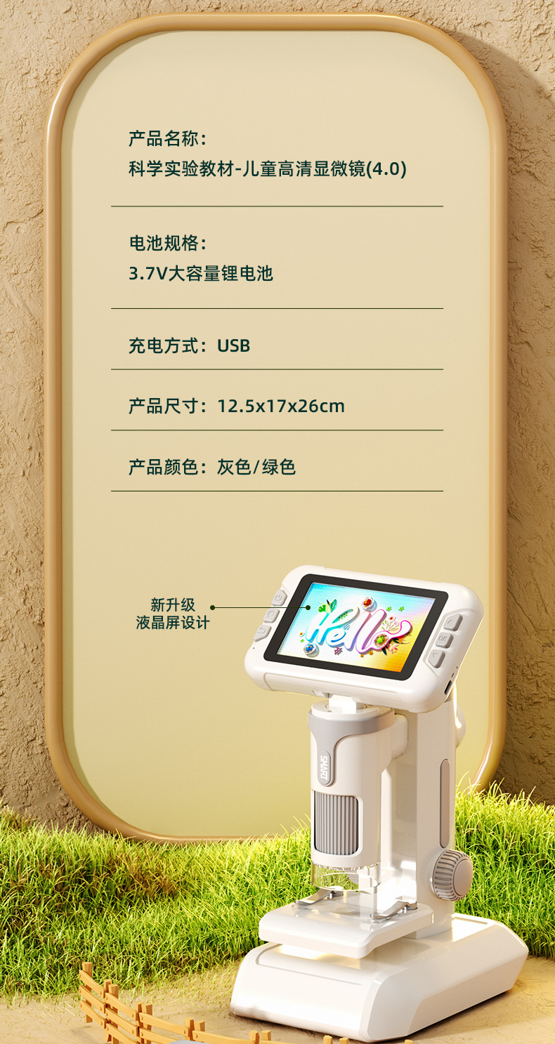 品名:4英寸高清大屏儿童数码显微镜(手持、台式、挂脖三合一)