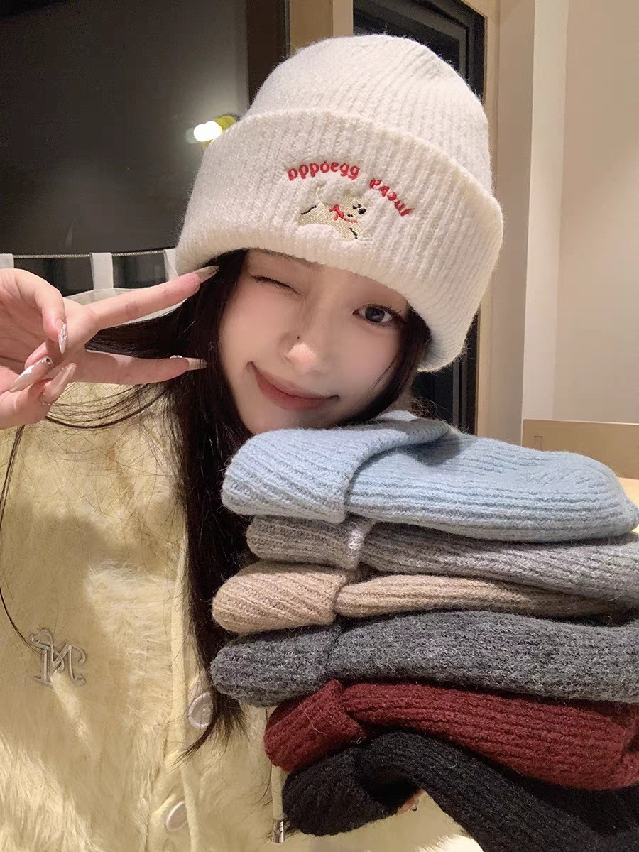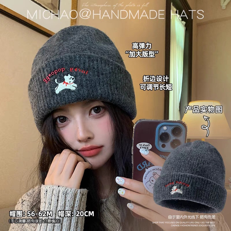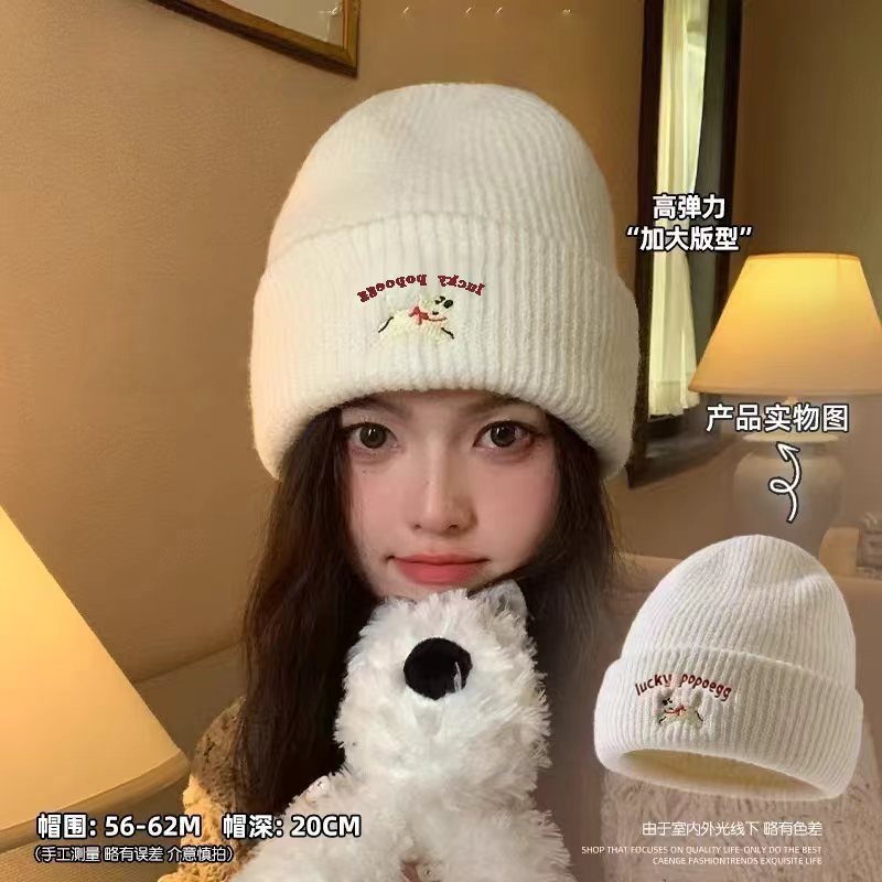 여성을위한 귀여운 강아지 자수 니트 모직 모자 2024 새로운 가을, 겨울 얼굴이 작은 다용도 대형 머리 모자스토어 가기