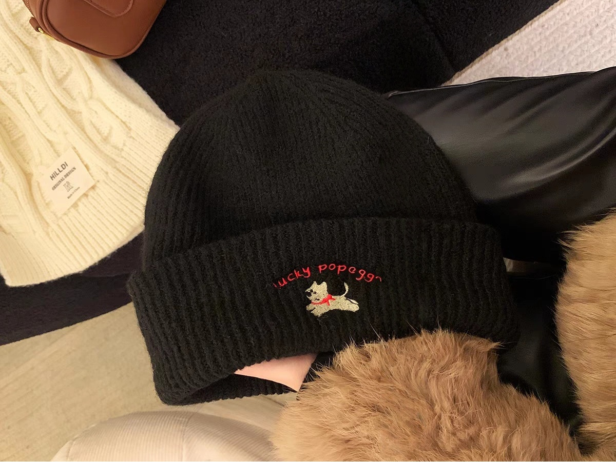 여성을위한 귀여운 강아지 자수 니트 모직 모자 2024 새로운 가을, 겨울 얼굴이 작은 다용도 대형 머리 모자