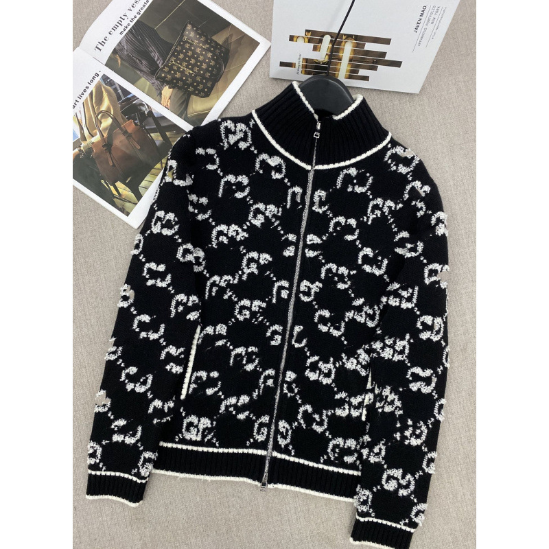 고급 버전 Nanyou G의 새로운 스타일 타월 자수 스탠드 칼라 지퍼 더블 G 풀 프린트 니트 울 가디건 여성용