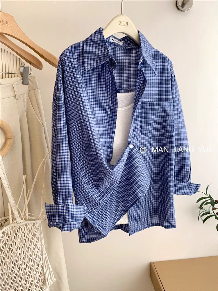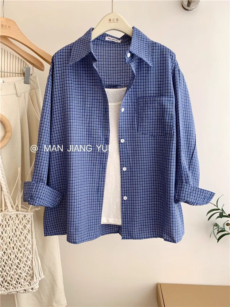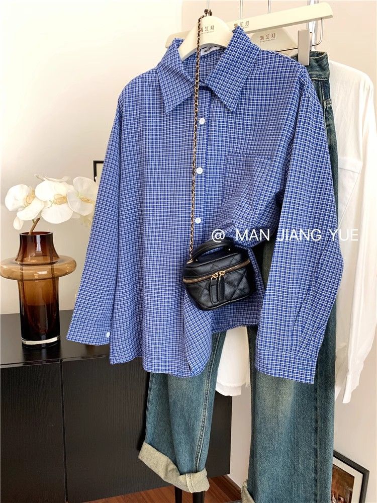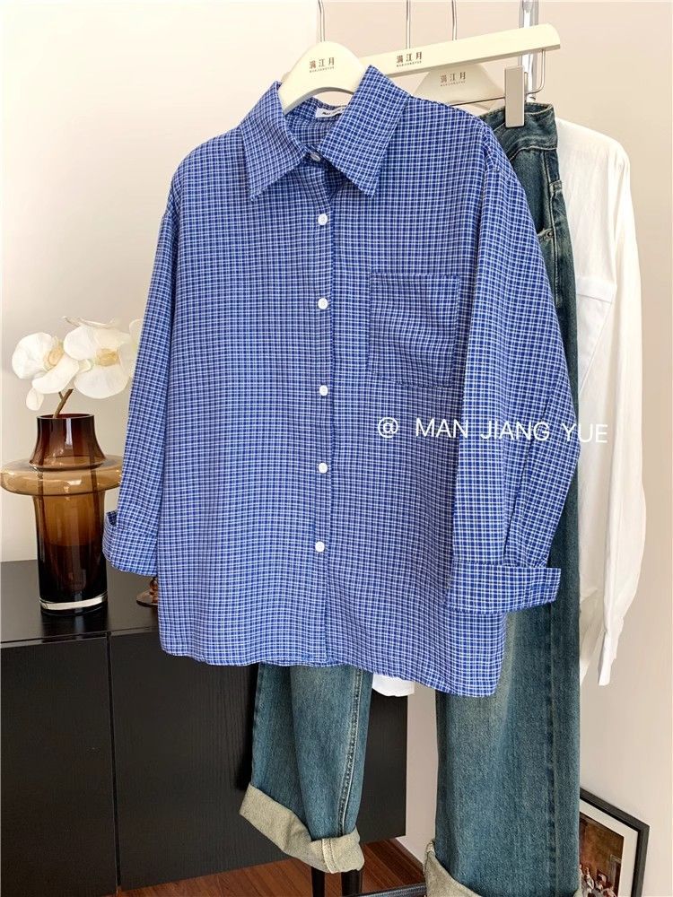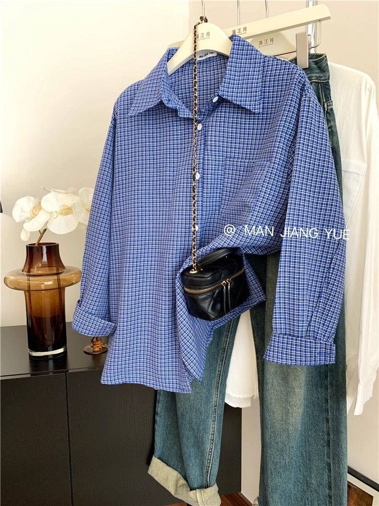 여성을위한 파란색 격자 무늬 긴팔 셔츠 코트 탑 초가을 복고풍 게으른 스타일 느슨한 캐주얼 슬림 격자 무늬 셔츠스토어 가기